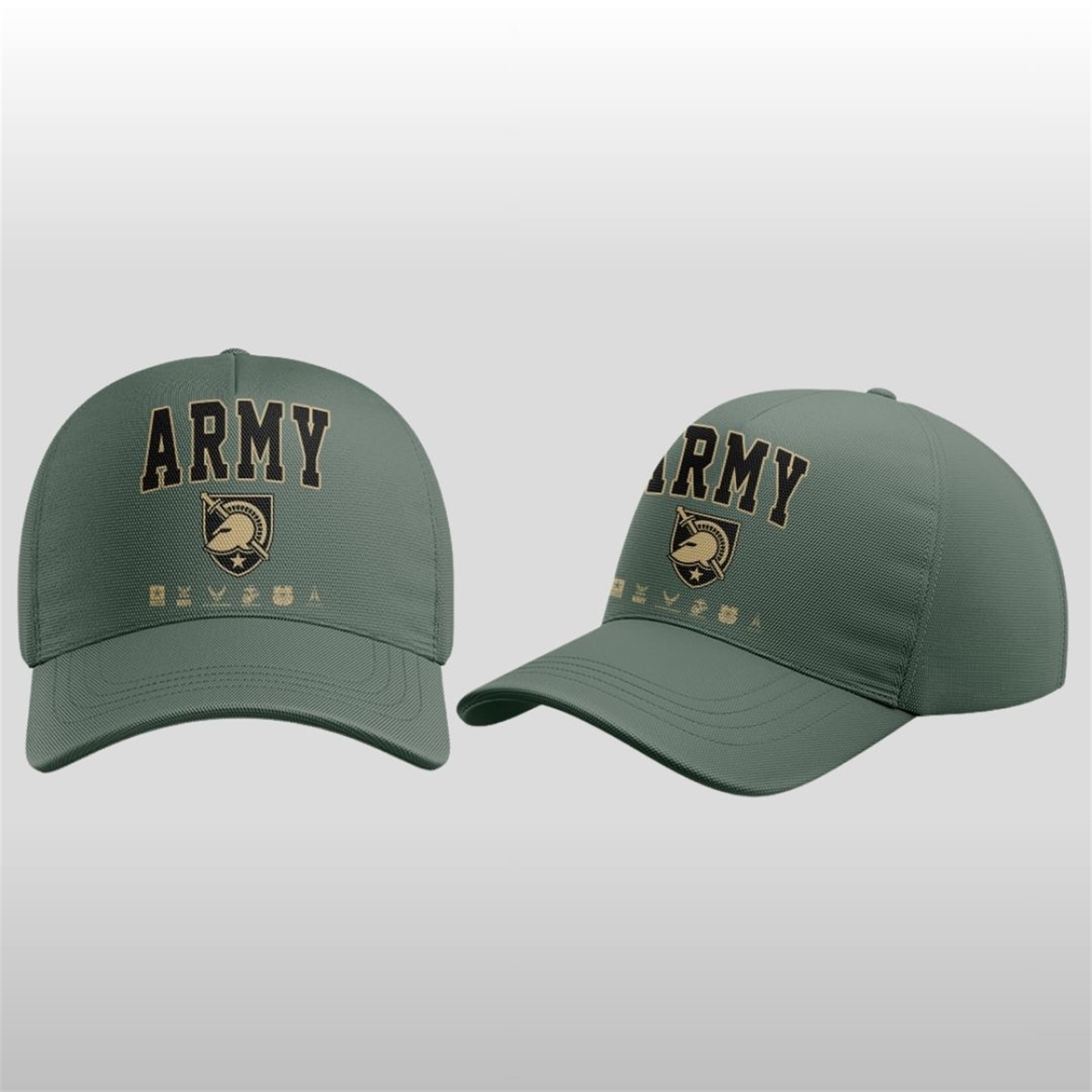 The reverse side proudly displays “ARMY” in large, striking block letters above the crest graphic. Below this, a series of emblems representing the different branches of the United States Armed Forces—Army, Navy, Air Force, Marine Corps, and Coast Guard—are subtly arranged, celebrating the wider military community.