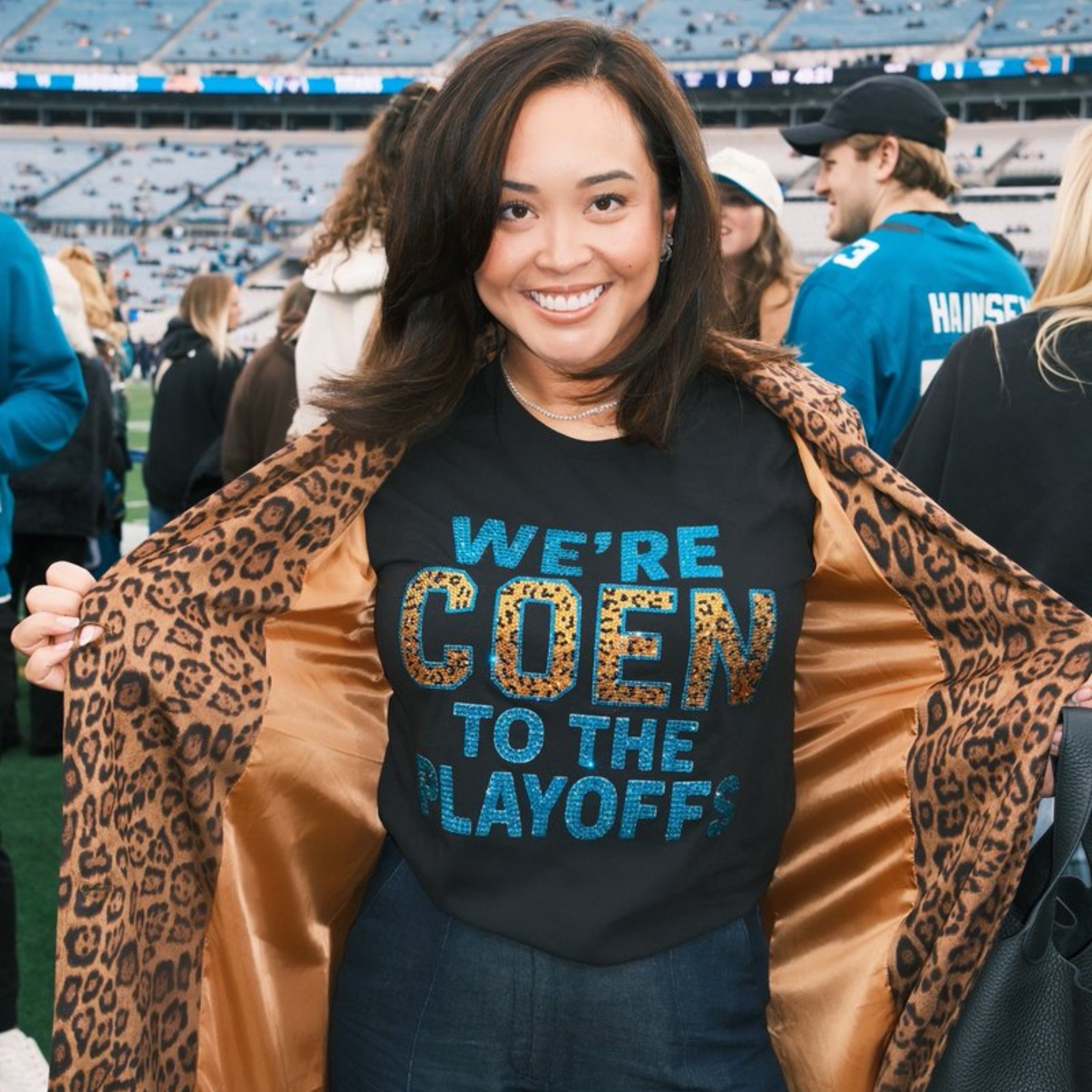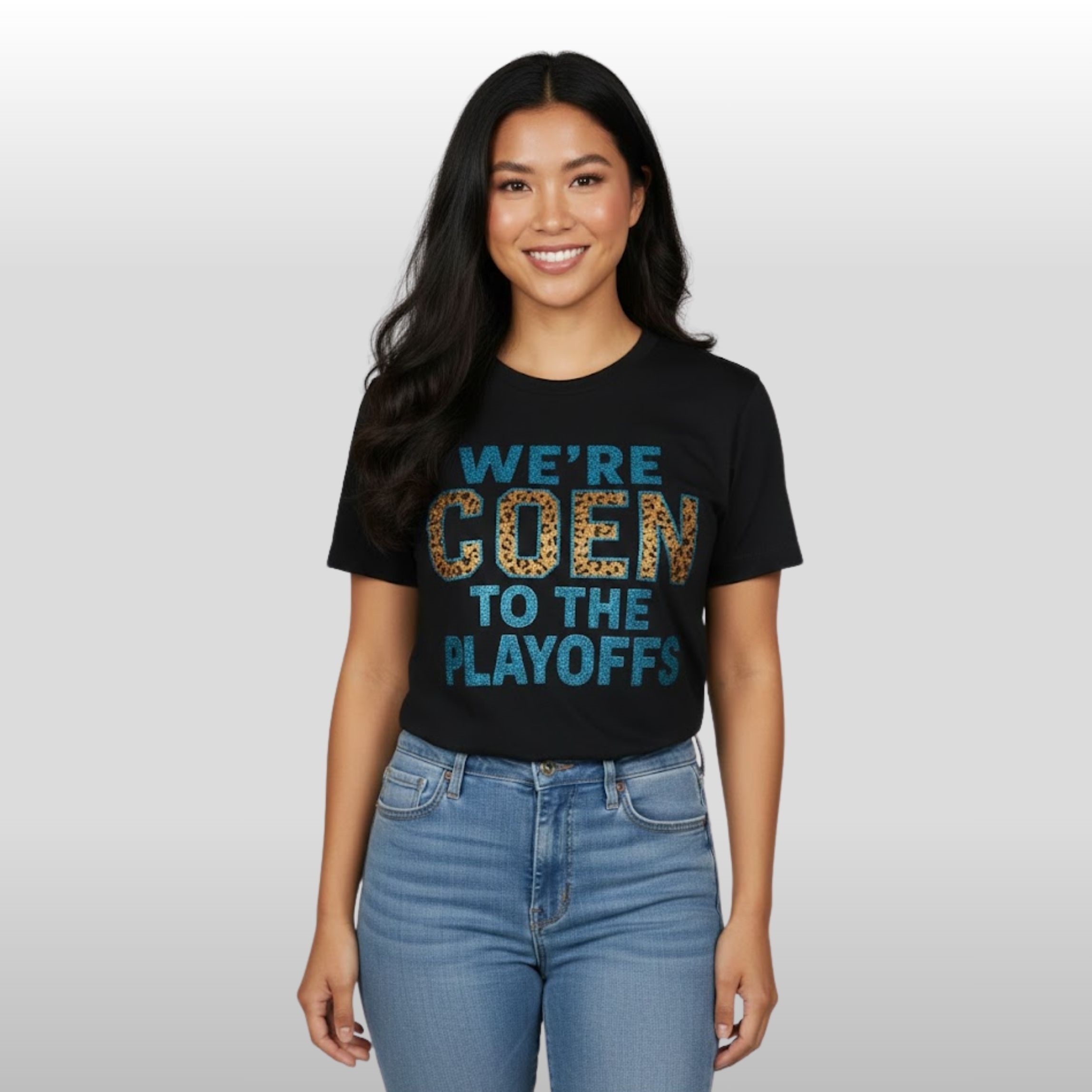 The shirt features a bold, eye-catching design with the phrase “WE’RE COEN TO THE PLAYOFFS” front and center. Using a striking mix of vibrant blue glitter-style text and a fierce leopard print pattern for the name “COEN,” this shirt perfectly blends sports enthusiasm with a touch of trendy flair. It’s the ultimate statement piece for stadium tailgates, watch parties, or simply representing your team pride around town.