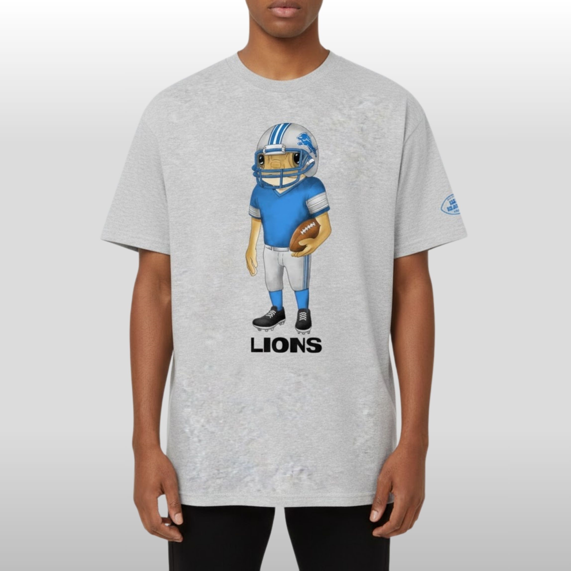 The shirt is a masterclass in aesthetic blending. It moves away from standard sportswear looks to embrace a creative, playful vibe. Featuring a charming character sporting the iconic silver and Honolulu blue helmet, the design bridges the gap between the “World’s Hottest Artist” and the “Pride of Detroit.”