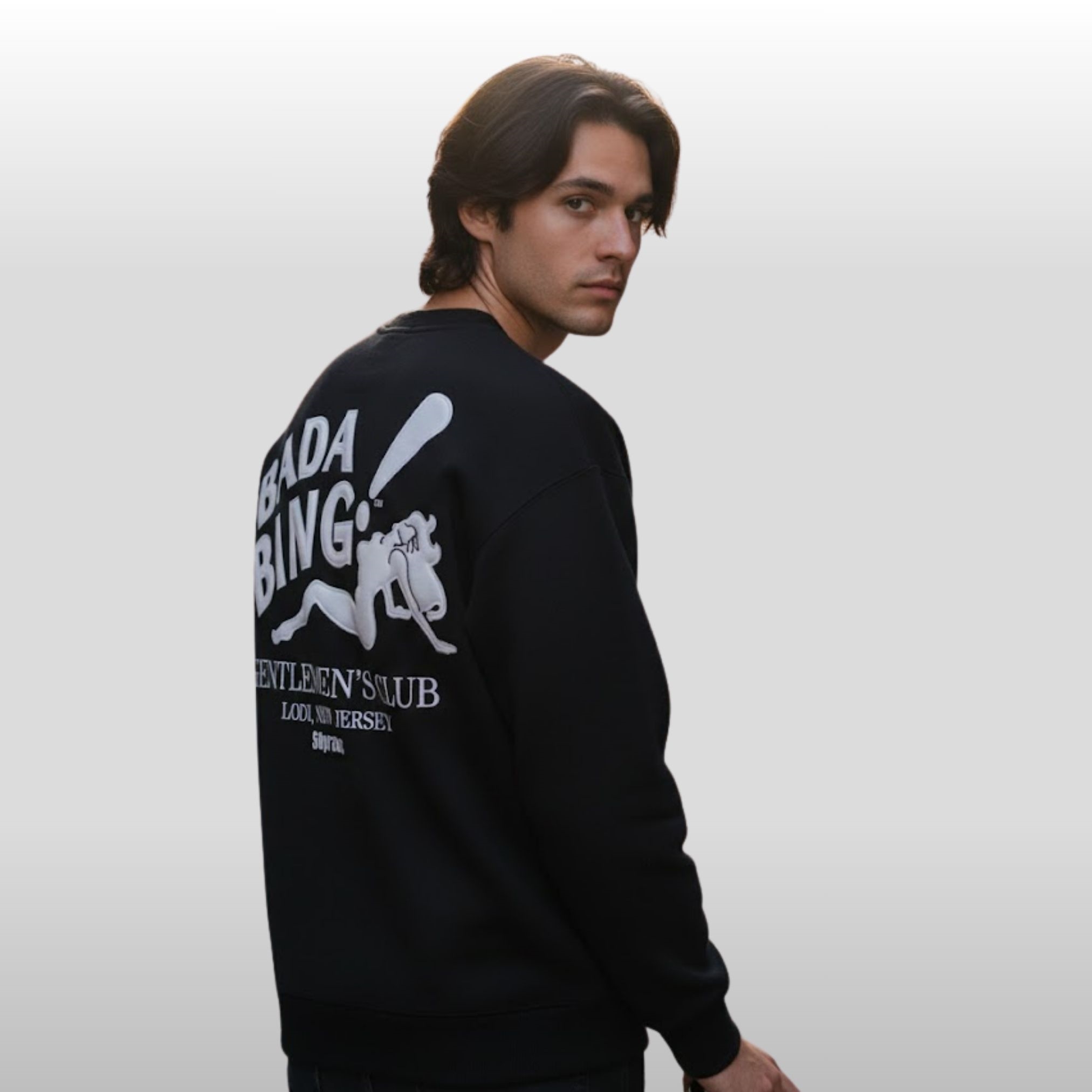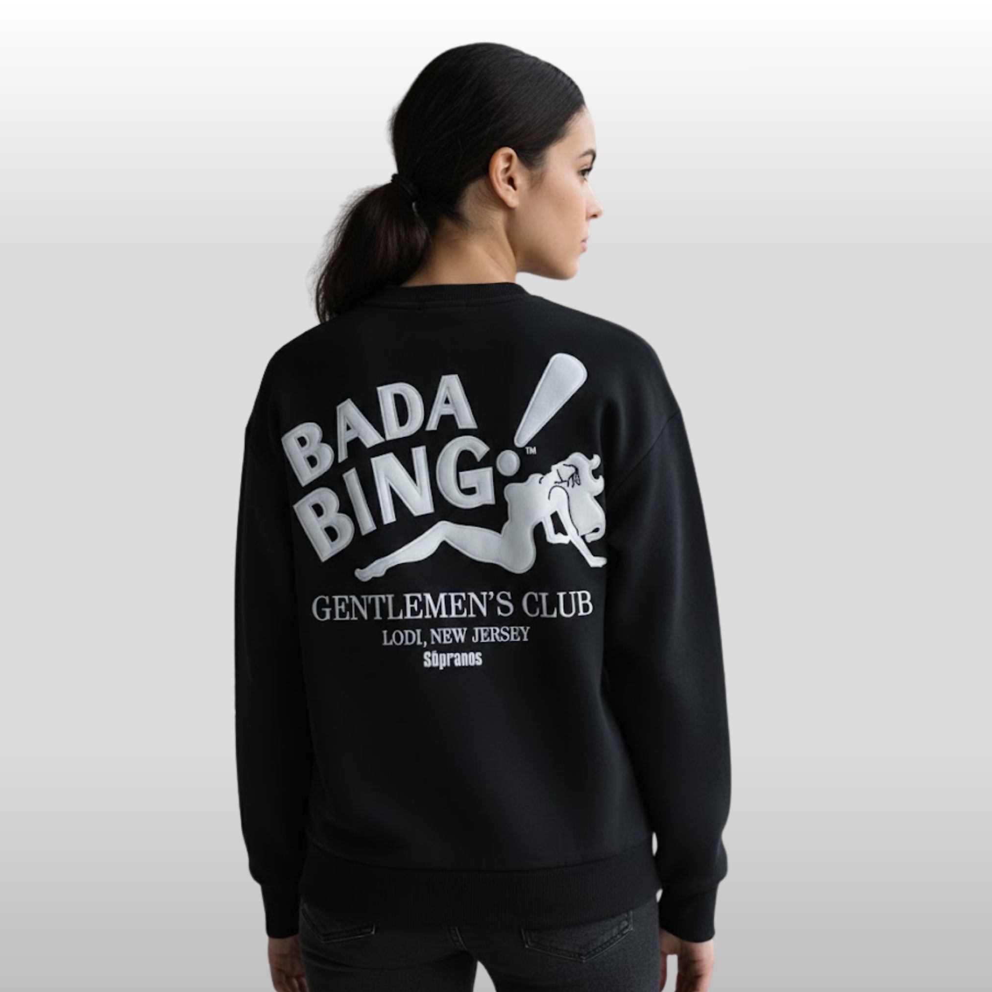 Embrace the legacy of the most famous fictional hangout in television history. The Bada Bing Gentlemen Club Lodi New Jersey Sweatshirt is more than just a piece of clothing; it is a high-quality tribute to the smoke-filled rooms and back-office deals of North Jersey. This premium black crewneck features the unmistakable “Bada Bing!” logo in a bold, silver-grey puff print, complete with the iconic reclining silhouette. Below the main graphic, the text honors the legendary location of Lodi, New Jersey, ensuring this Sopranos-inspired lounge wear stands out in any crowd.