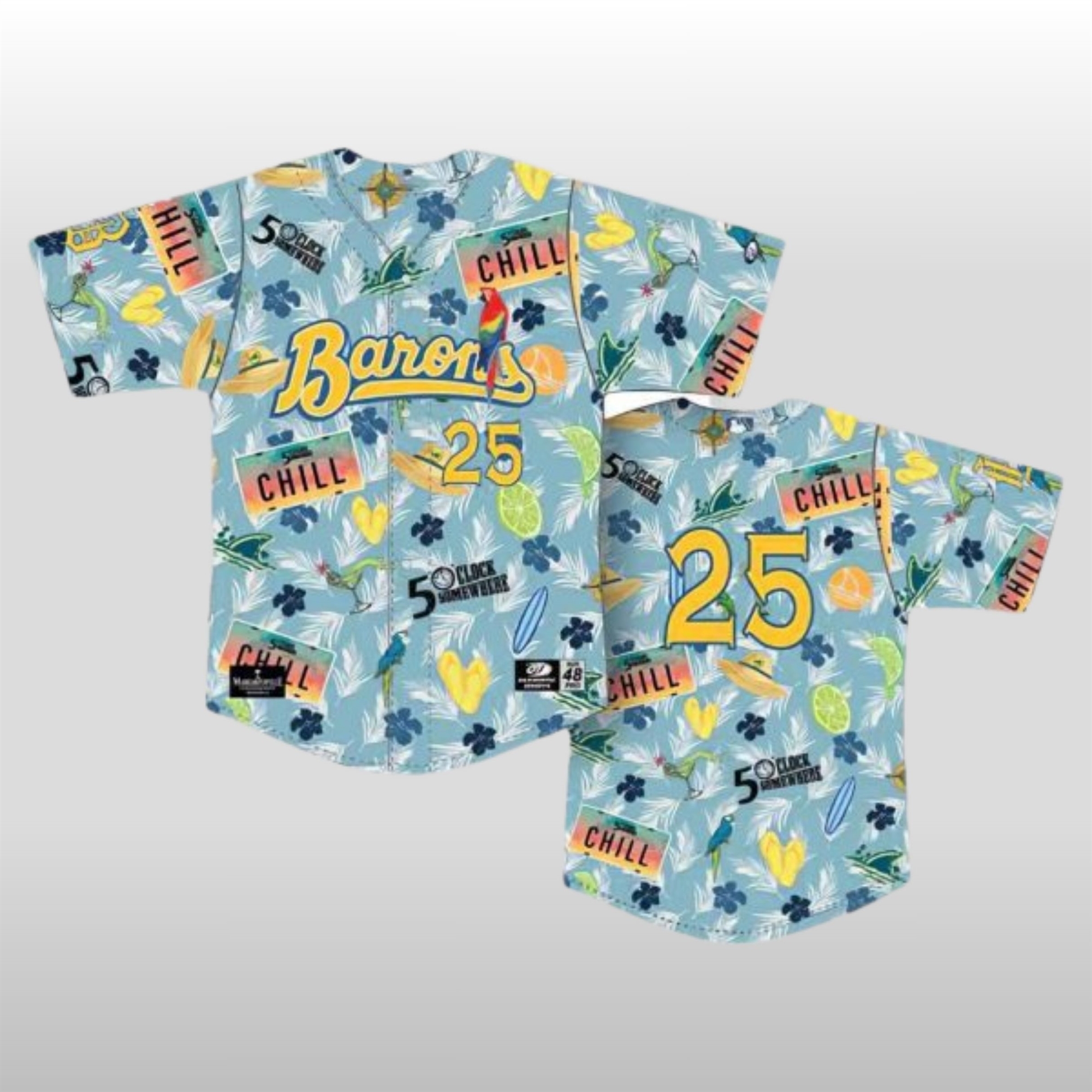 Dive into the details of this vibrant Barons Margaritaville Jersey 2025 Giveaway. The light blue fabric is a canvas of summer fun, featuring an all-over tropical pattern. Look closely and you’ll find iconic symbols of laid-back living: cheerful yellow hearts, green lime slices, playful parrots, and surfboards. The design boldly incorporates the phrase “CHILL” and the famous “5 O’CLOCK SOMEWHERE” motif. “Barons” is proudly displayed across the chest above the number “25,” rendered in a bright yellow with a cool blue outline, matching the large “25” on the back. This truly unique 2025 Barons Tropical Jersey is the perfect embodiment of seaside leisure and fun, making it the essential piece of fan gear for the season.