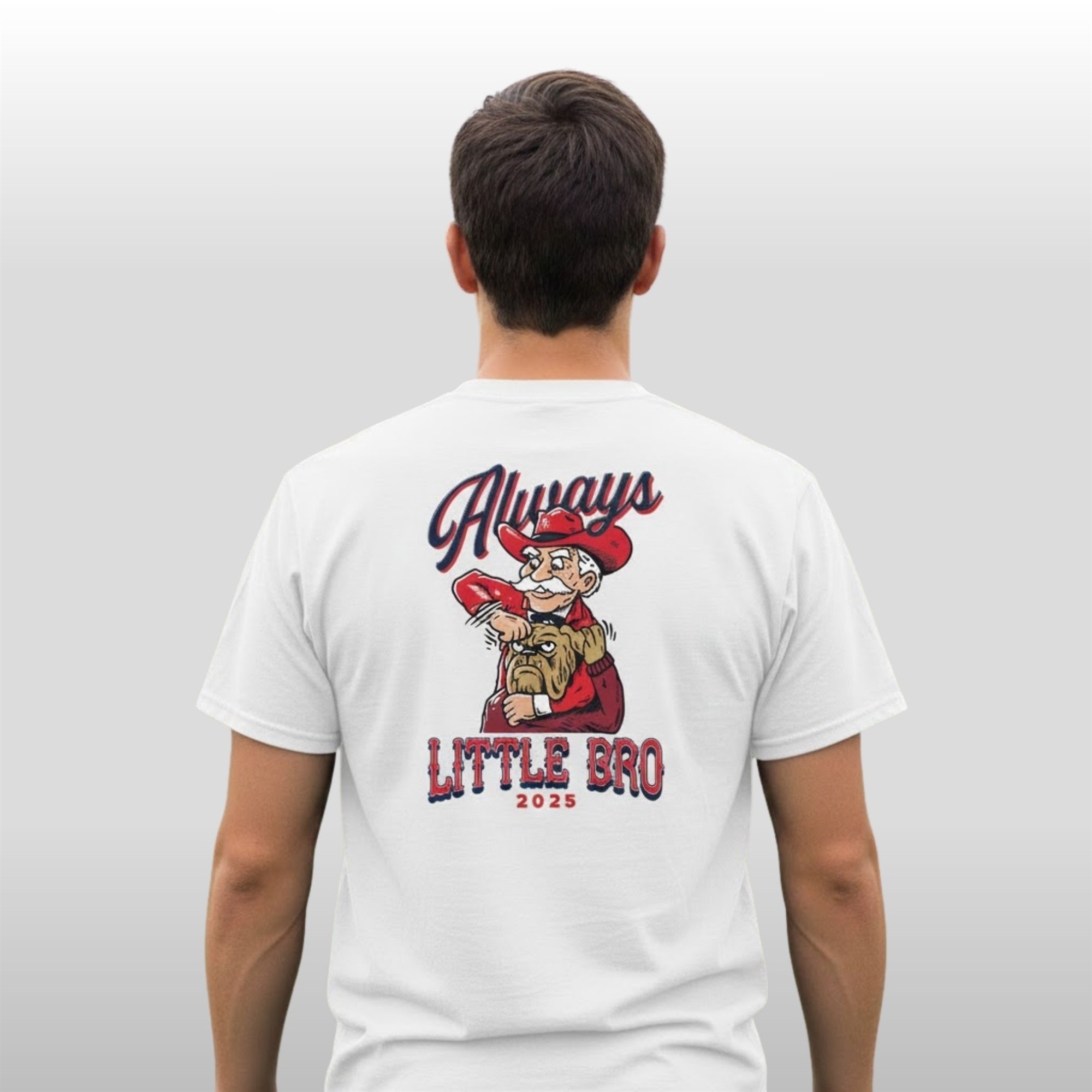 The Barstool Ole Miss Always Little Bro 2025 Shirt features a bold, eye-catching design on the back, a clear nod to the spirited tradition against the in-state foe. It depicts a confident Colonel Reb figure affectionately (and perhaps a bit condescendingly) resting his arm on a mascot resembling a bulldog, symbolizing the long-running rivalry dynamic. Above this iconic graphic, the word “Always” is scripted, and below, “LITTLE BRO 2025” is displayed, cementing the playful jab.