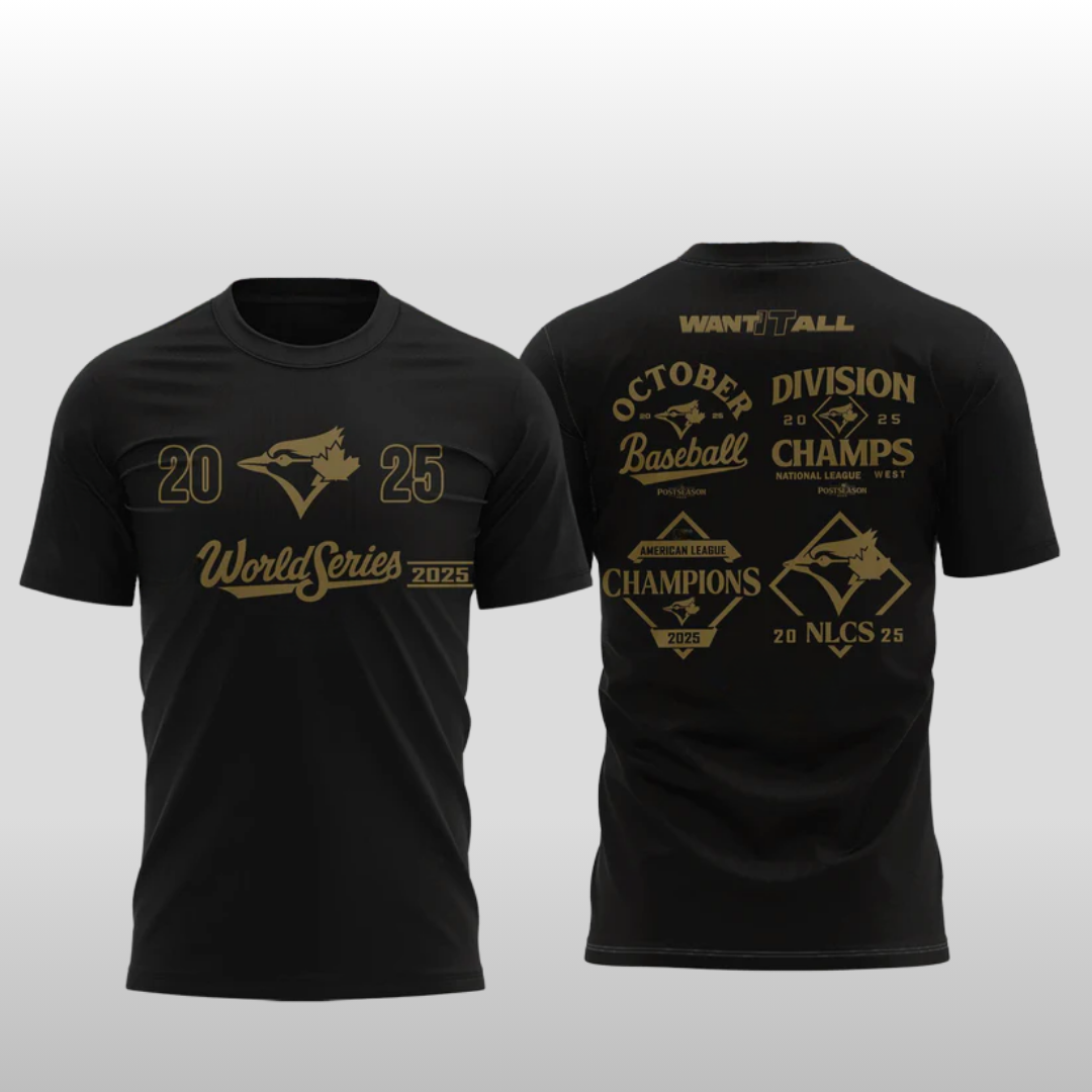 Our exclusive Blue Jays 2025 American League Champions Shirt is the ultimate fan statement. This striking black tee is emblazoned with luxurious gold print featuring the iconic team logo and the triumphant year ‘2025’ on the front, underscored by the powerful ‘World Series’ text. The reverse side is a detailed testament to their journey, proudly showcasing ‘American League Champions 2025′ and ’20 NLCS 25,’ alongside ‘Division Champs’ text and the ‘October Baseball’ phrase—all designed to reflect their dominant playoff path.