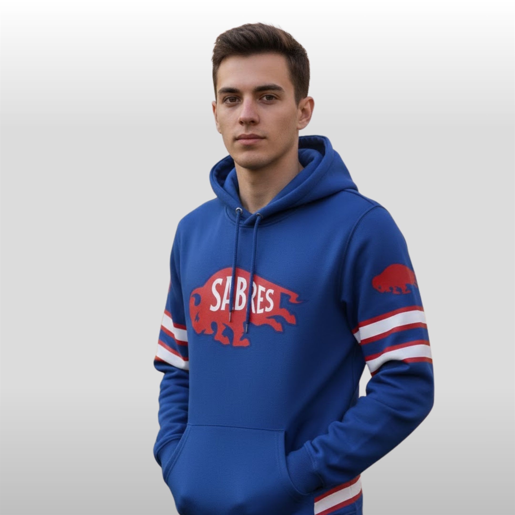 This hoodie is a masterclass in co-branding. It breaks away from standard gear to embrace a vibrant “Electric Blue” and “Charging Red” palette. The front features the iconic charging buffalo silhouette, reimagined with “SABRES” lettering across the body in a crisp white font that pops against the rich blue base. This design choice pays homage to the city’s dual-sport heritage while creating a fresh visual identity for the 2026 season.