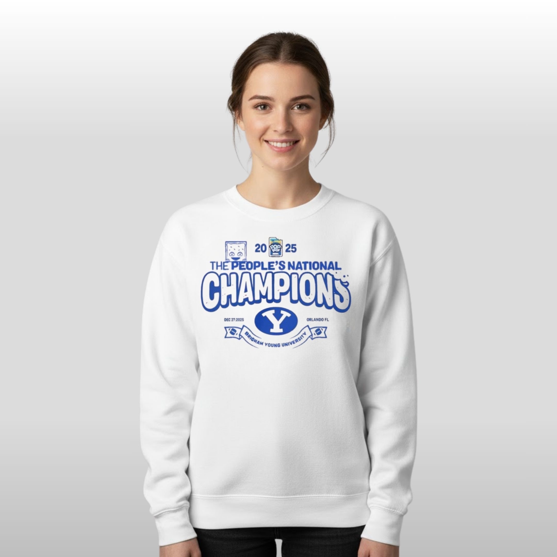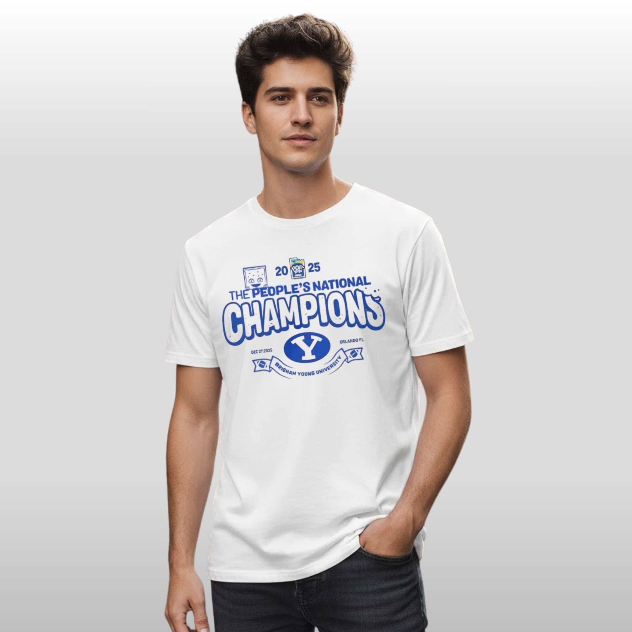 The BYU Cougars The People National Champions 2025 Shirt is the ultimate tribute to a historic season. This high-quality white tee features a bold, vibrant royal blue design that captures the energy of the post-season celebration. At the center, the iconic “Y” logo is anchored by a commemorative banner, flanked by the location “ORLANDO FL.”