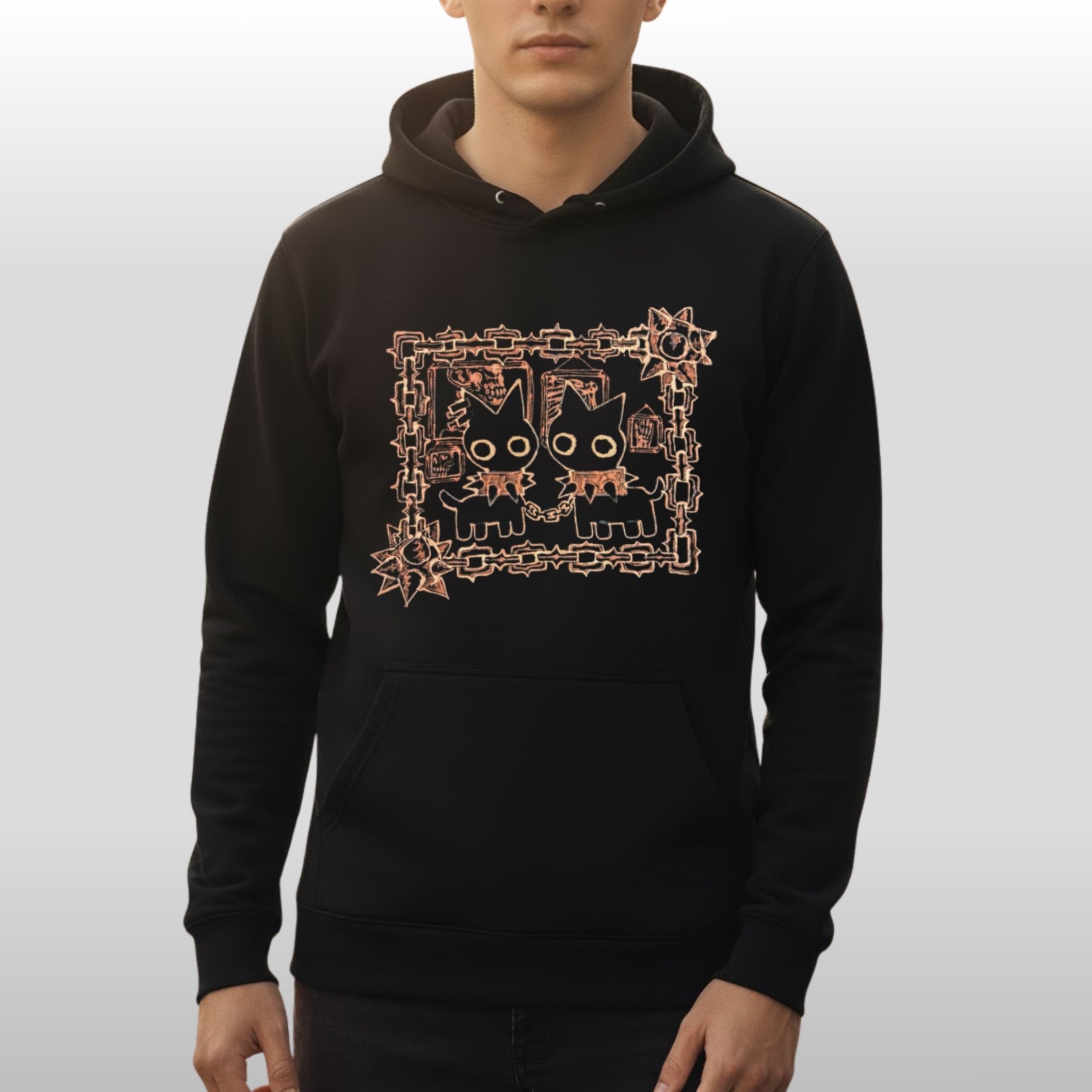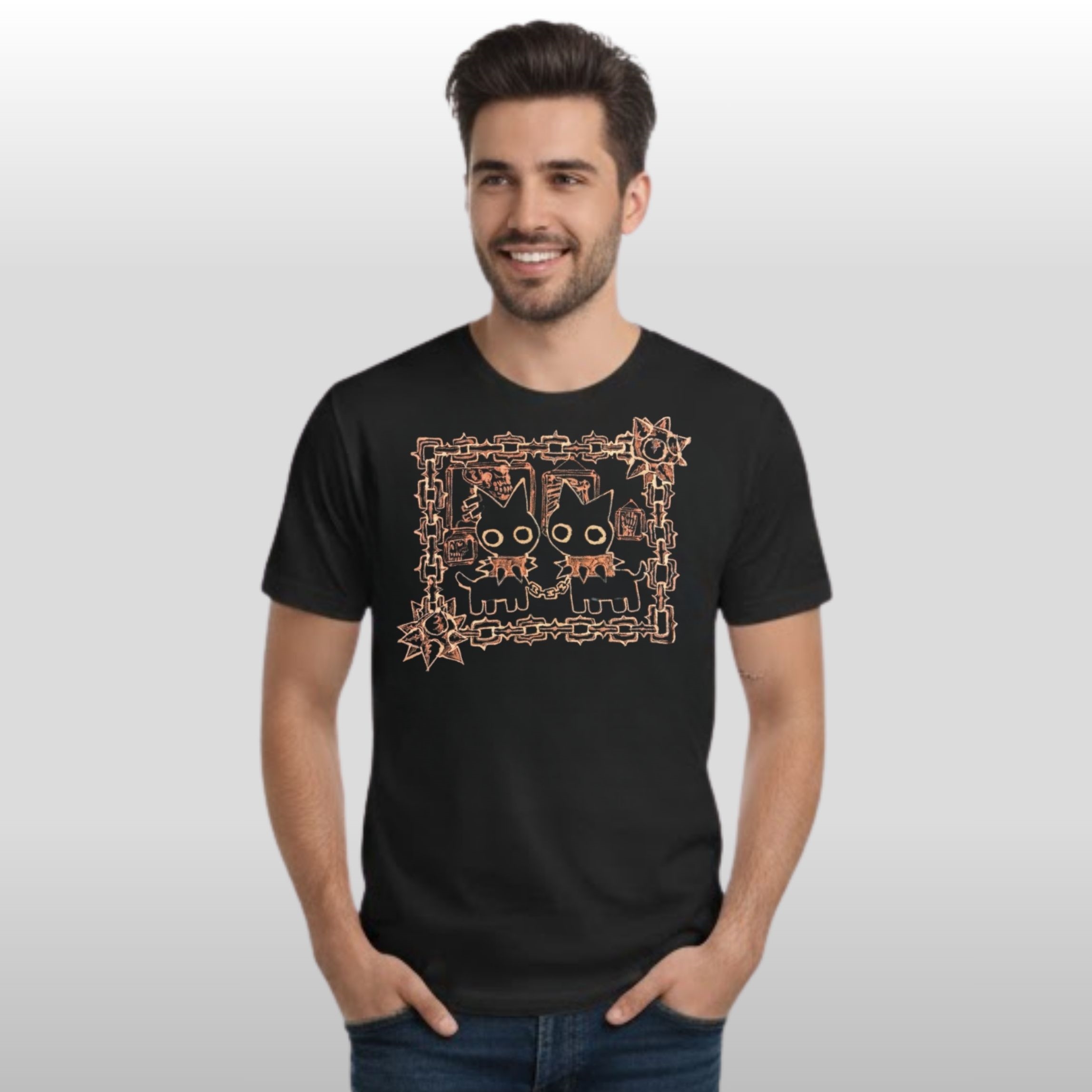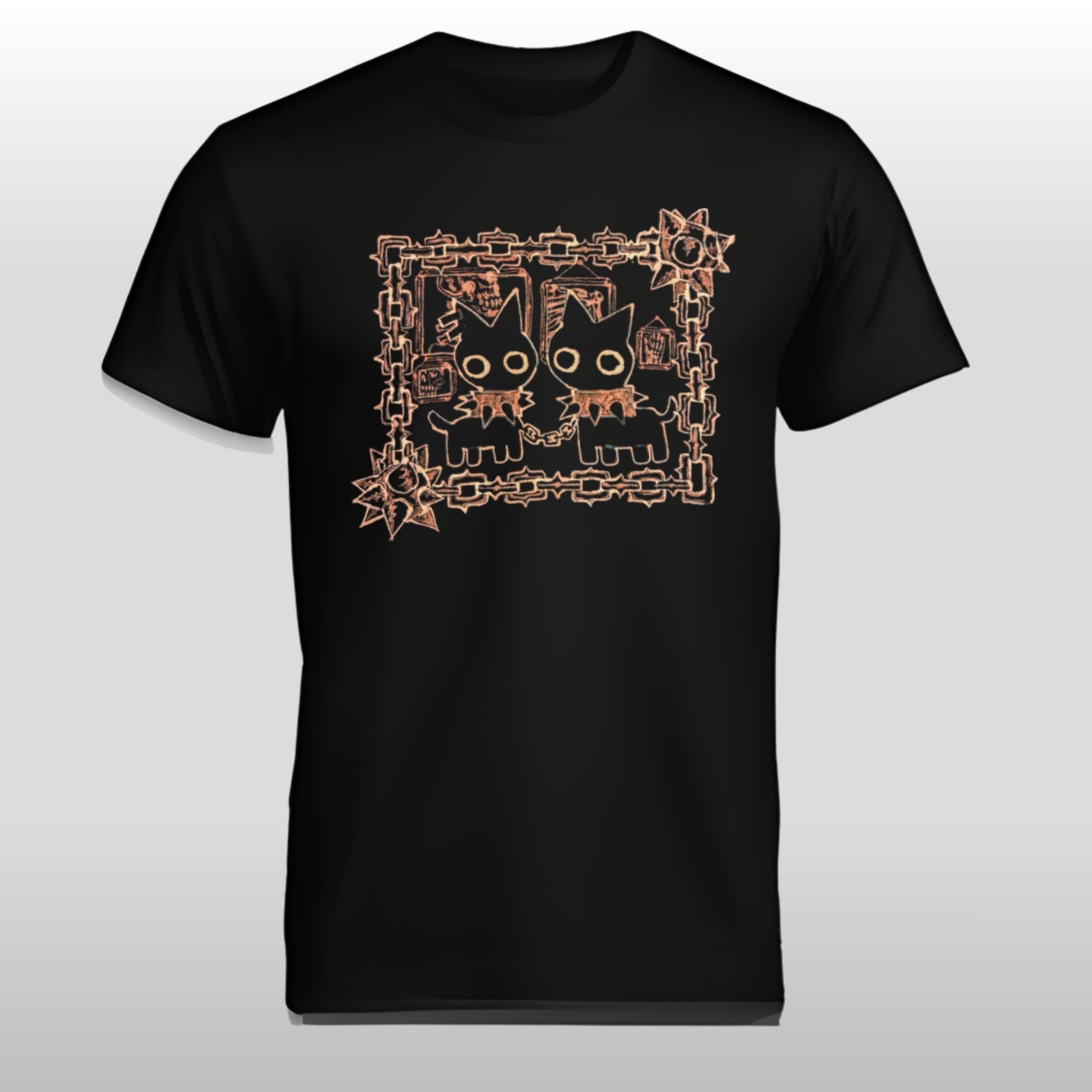 Step into the shadows with the Cat Asylum Bleached Shirt, a black t-shirt featuring a striking, copper-toned graphic. The centerpiece showcases two cartoonish black cats, their eyes wide and unsettlingly intense, each wearing a spiked collar and chained together, symbolizing a playful yet unsettling bond. They are framed within a chaotic, barbed wire and chain border adorned with ominous, spikey star-like motifs. The intricate “bleached” effect graphic provides a unique texture that feels both rebellious and stylishly distressed, making this shirt a must-have for fans of the “caged cats” style.