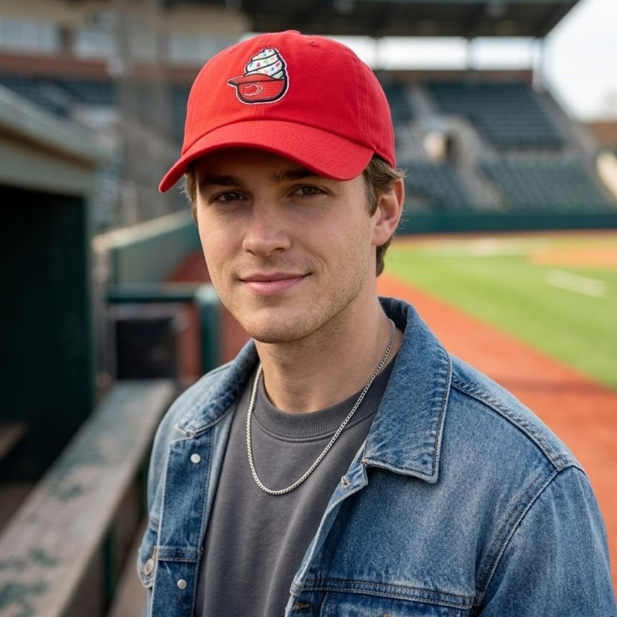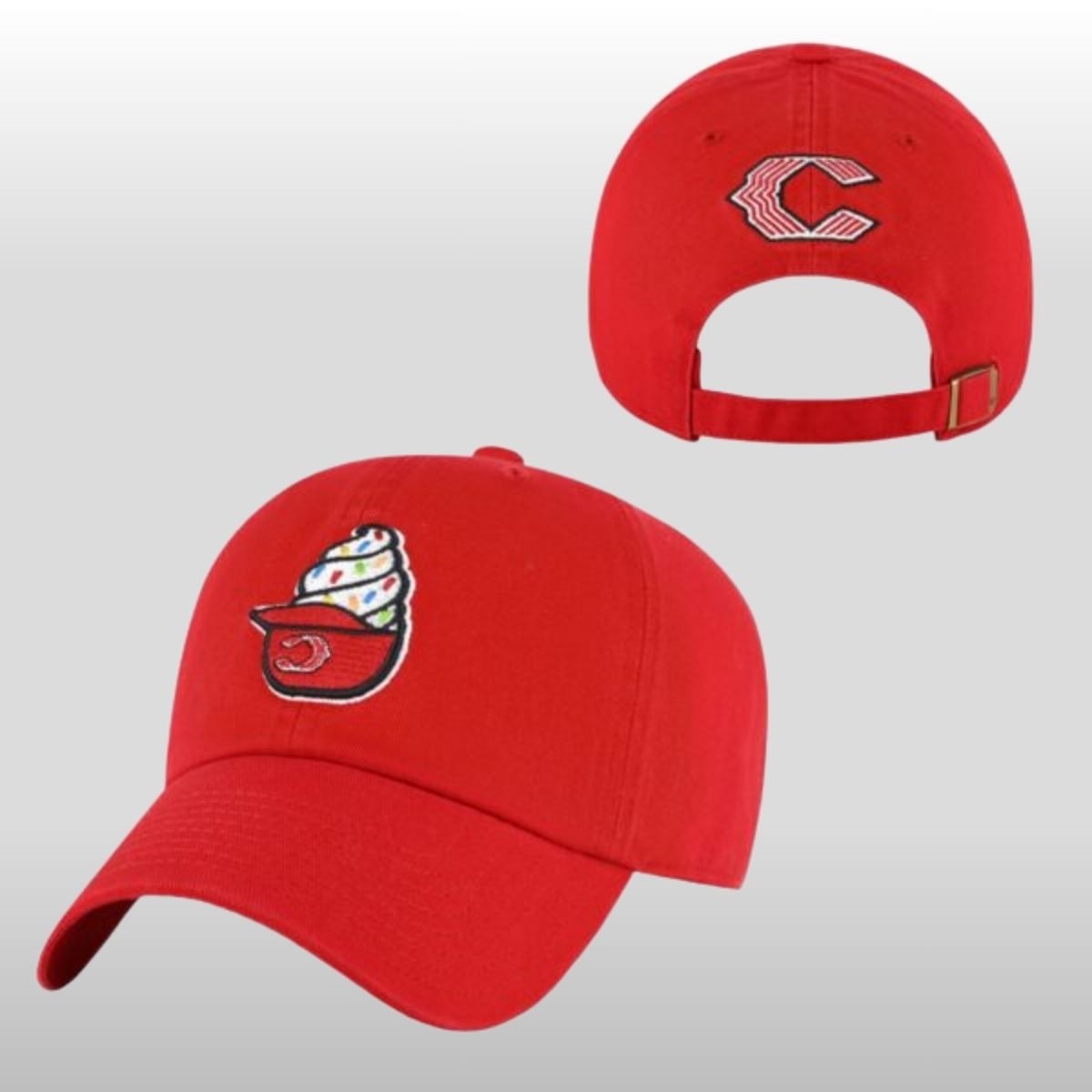 This piece stands out by departing from traditional athletic color palettes in favor of a “dessert-inspired” aesthetic. The crown is bathed in a deep, velvety red that mirrors a classic cherry topping, while the brim features a textured, waffle-cone pattern embossed into the fabric. On the front, the stylized “C” logo is reimagined with a playful twist—the embroidery is thick and puffy, designed to look like a dollop of whipped cream dripping over the edge of the letter. The side panel features a small, embroidered ice cream cone patch with “CINCY” written across the scoop in a retro script, anchoring the design to the city’s unique culinary pride.