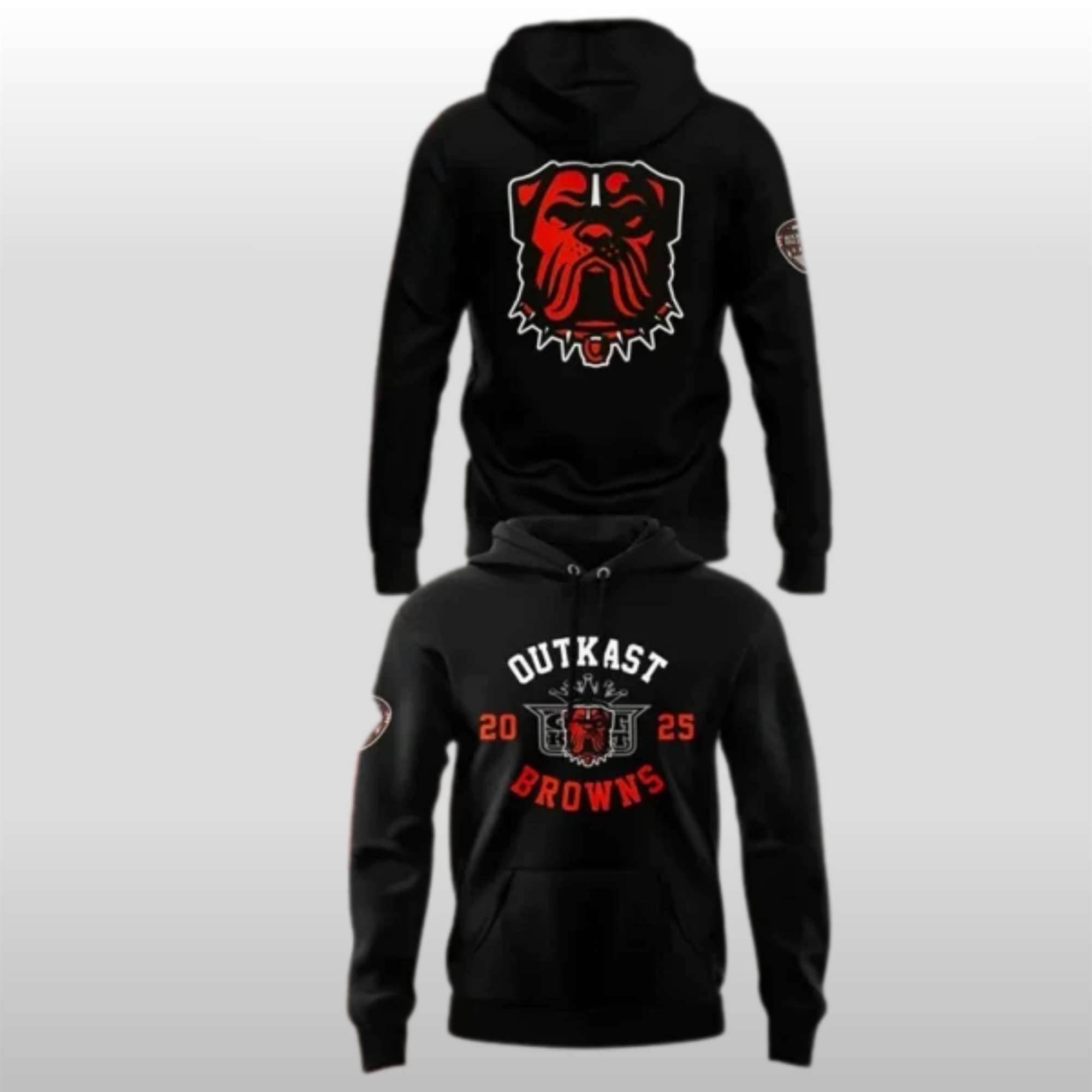 The Cleveland Browns x Big Boi 2025 Hoodie is more than just apparel—it’s a statement. This black, high-quality pullover features a powerful design that pays tribute to the legendary rapper Big Boi, one half of Outkast. The front of the hoodie boldly displays the word “OUTKAST” above the year “2025” and the word “BROWNS” in striking red and white lettering. A fierce, red and black bulldog mascot head, reminiscent of the Dawg Pound spirit, is centrally placed beneath the year. The hoodie’s back (top image) showcases a large, aggressive rendering of the bulldog mascot, framed by a jagged outline, setting an intimidating tone.