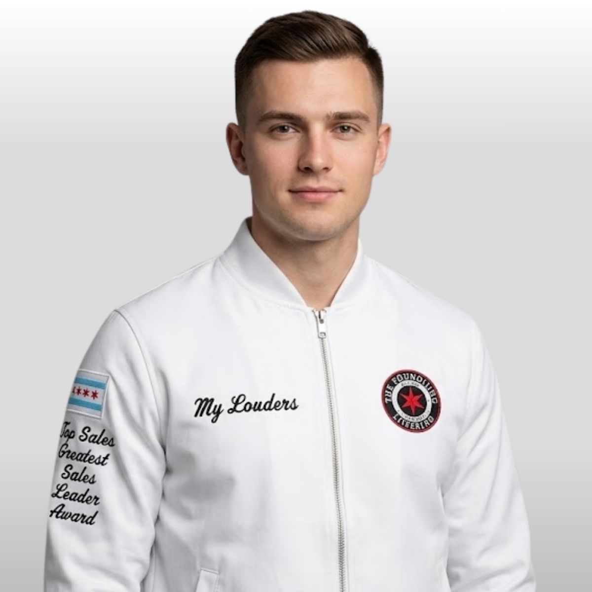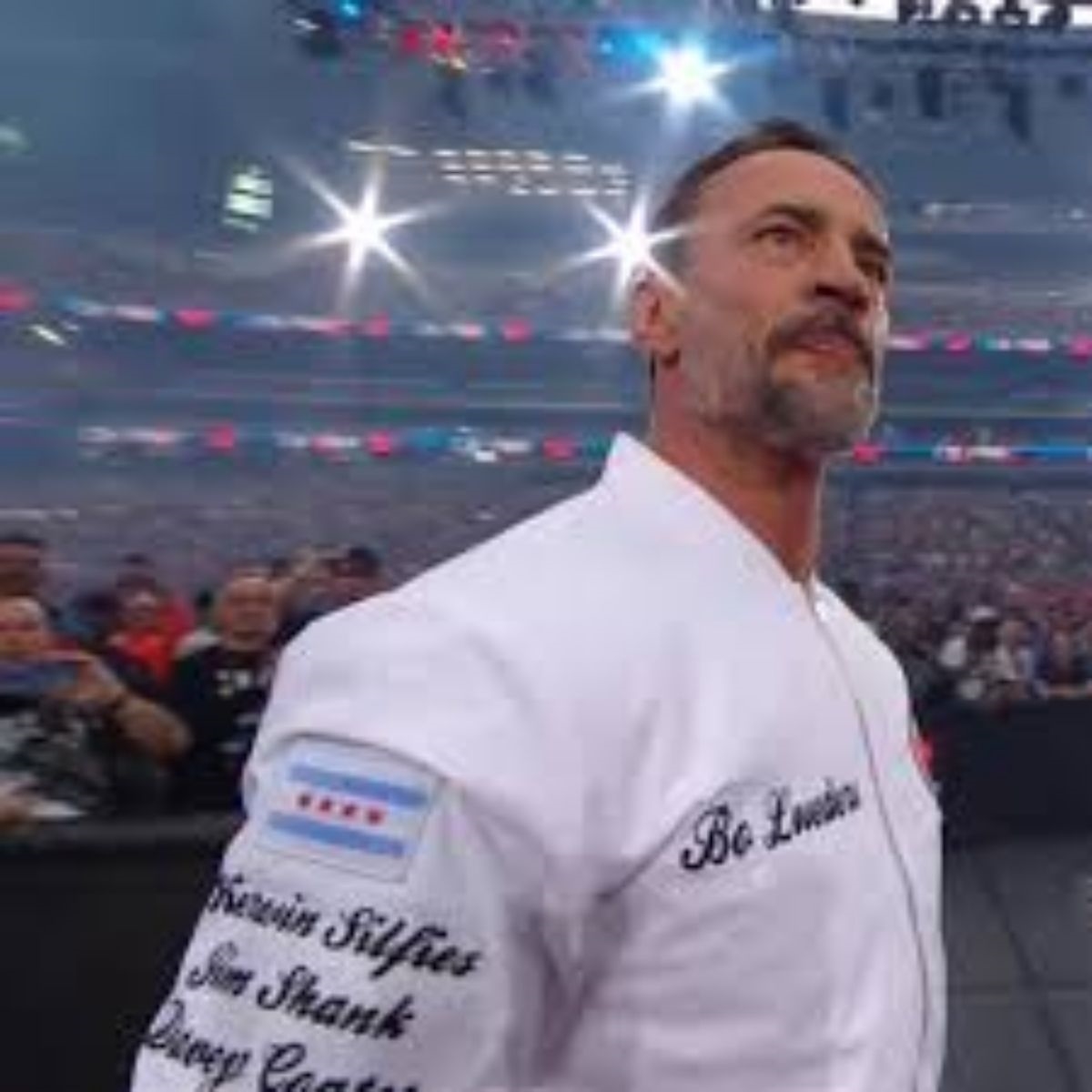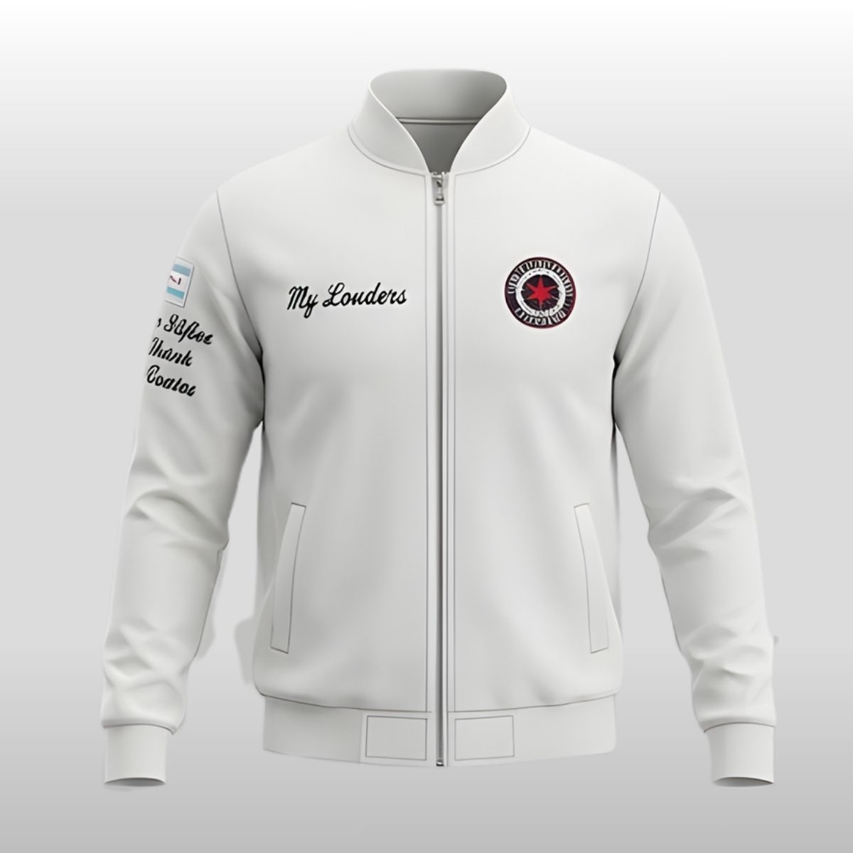The design of this jacket stems from an emotional moment that resonated deeply with the audience, moving beyond simple fan merchandise into the realm of a memorial tribute. When CM Punk stepped out wearing this specific aesthetic, it wasn’t about flashy logos or branding; it was a quiet, powerful gesture to celebrate the life of Bo Lueders. The clean white fabric serves as a canvas for the “My Louders” embroidery, which mimics the personal touch of a hand-written note. This garment represents the bridge between the high-octane world of professional sports entertainment and the real, human stories that happen in the front row of the arena. Every detail, from the vibrant red star in the emblem to the symbolic Chicago flag on the arm, reflects a sense of community and the idea that some bonds are strong enough to be carried onto the grandest stages.