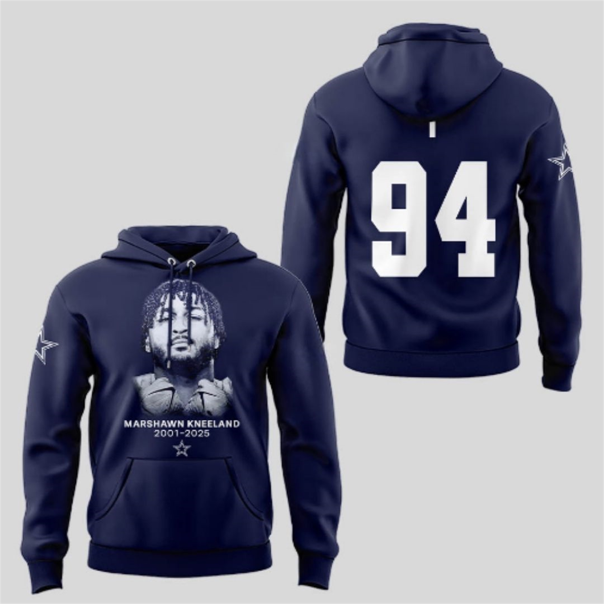 The Cowboys Marshawn Kneeland 2001 – 2025 94 Hoodie is more than just clothing—it’s a powerful statement of remembrance. Crafted in a rich, deep navy hue, the front prominently features a high-quality portrait graphic of Marshawn Kneeland, looking strong and dedicated. Below the image, the inscription “MARSHAWN KNEELAND 2001 – 2025” is displayed, marking the years of his life and serving as a timeless memorial.