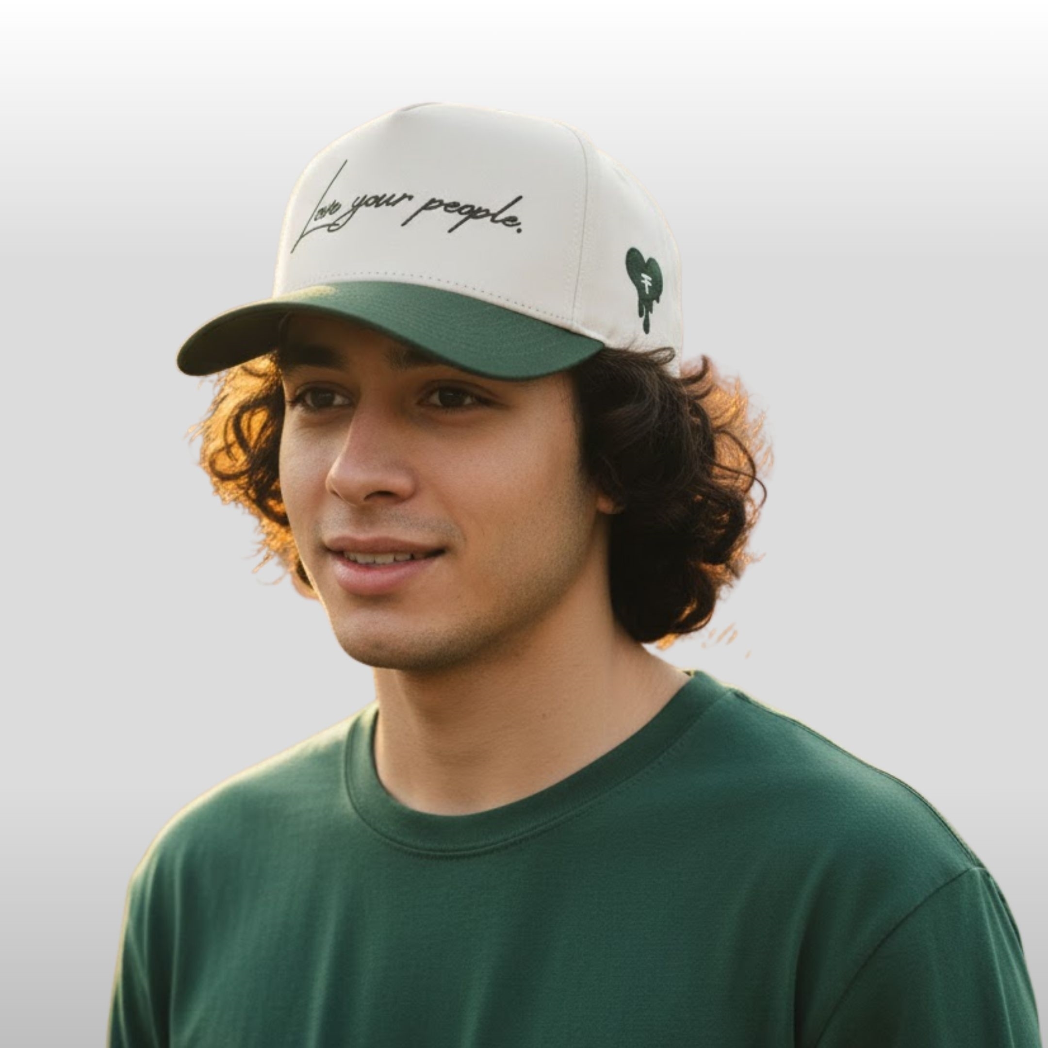 This isn’t your average team merch. The hat features a sophisticated two-tone colorway: a crisp, off-white crown paired with a striking forest green brim. The centerpiece is the signature “Love Your People” script, embroidered in a fluid, handwritten font that feels personal and authentic.