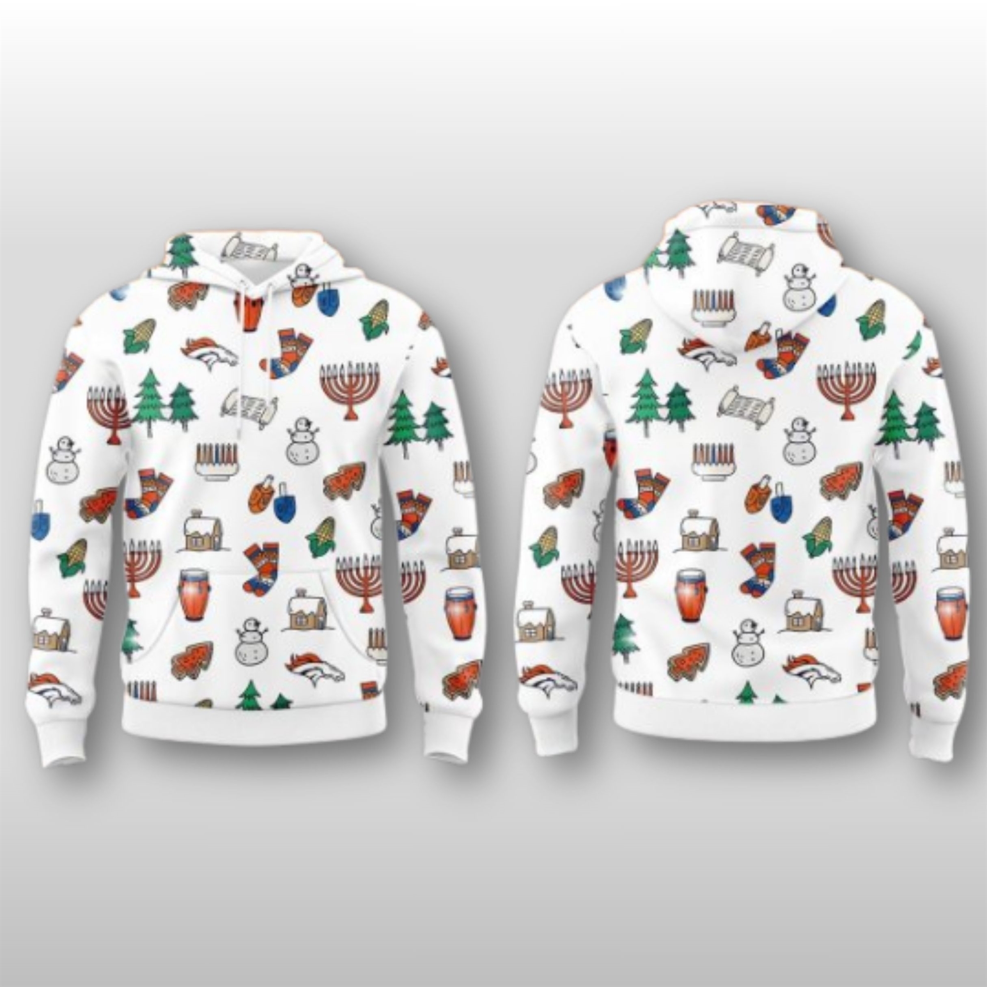 The Denver Broncos Happy Holidays 2025 XMas Hoodie is a must-have for any dedicated fan. This unique white pullover features a vibrant, all-over pattern that perfectly captures the spirit of the season. Look closely, and you’ll find charming holiday icons like festive fir trees, classic snowmen, colorful knitted socks, cozy snow-covered cabins, and the traditional menorah and dreidel to represent all winter celebrations. Woven throughout this cheerful design are the iconic Denver Broncos logo and a deep red conga drum icon, creating a truly original ‘Denver Broncos Holiday Sweater Alternative’ experience.
