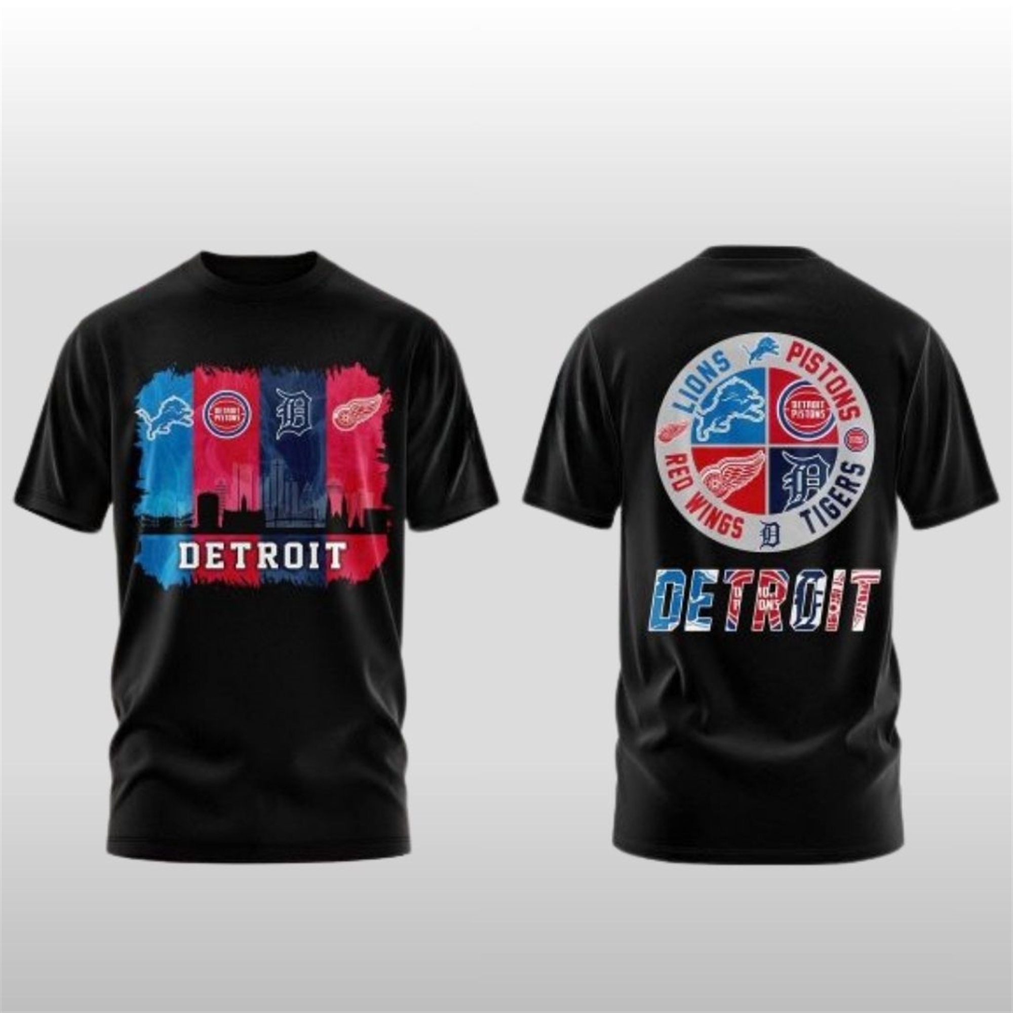 The front design is an eye-catching, distressed skyline graphic in striking red and blue, reminiscent of a spray-painted urban mural. Layered over this backdrop are the distinctive logos of the four major teams, creating a dynamic visual blend. The back seals the deal with a powerful circular crest, clearly displaying the team names—Lions, Pistons, Red Wings, and Tigers—alongside their iconic logos, all anchored by the bold “DETROIT” wordmark. This design is a visual anthem for the dedicated fan.