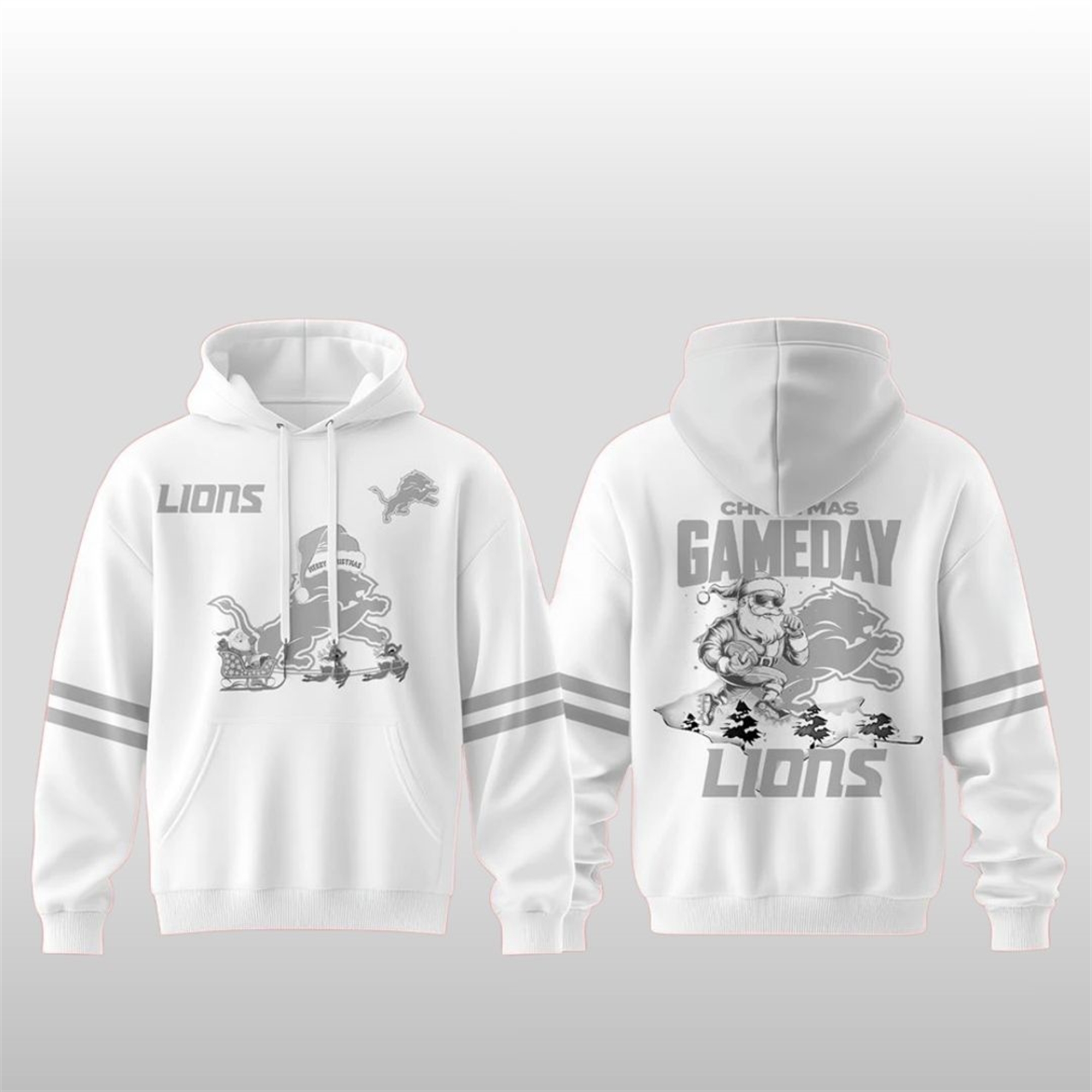 Crafted for warmth and style, this cozy white pullover hoodie is the perfect way to display your Lions pride during the chilly holiday season. The front features a unique grayscale graphic of a jolly Santa Claus, wearing shades and a stocking cap, charging forward on a sleigh led by a magnificent Detroit Lion, evoking a powerful Christmas Day spirit.