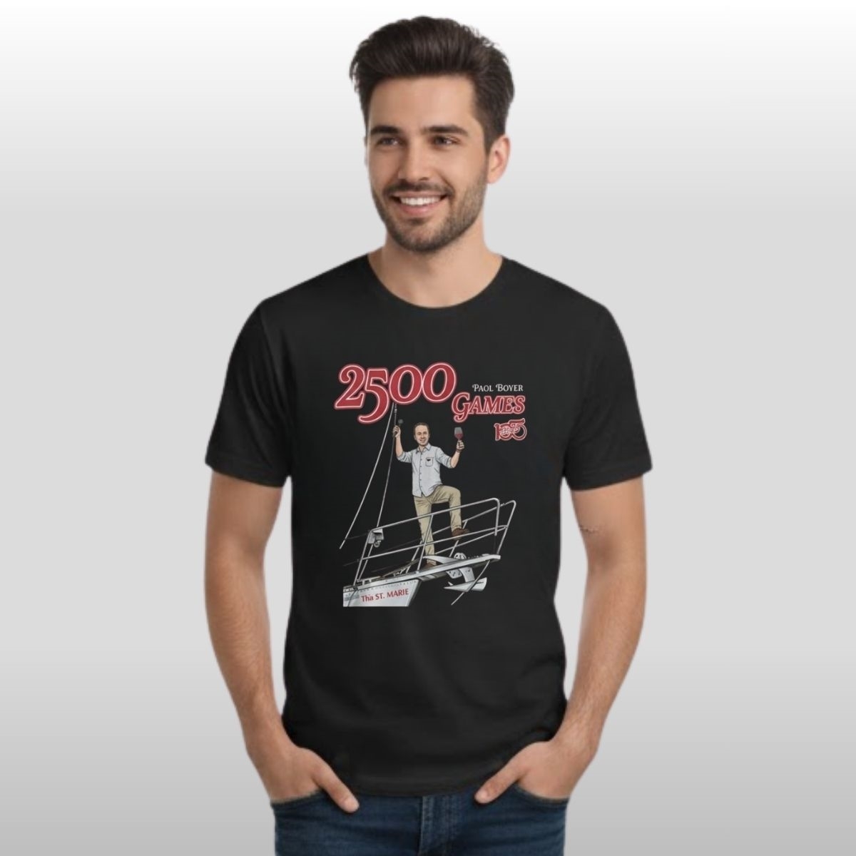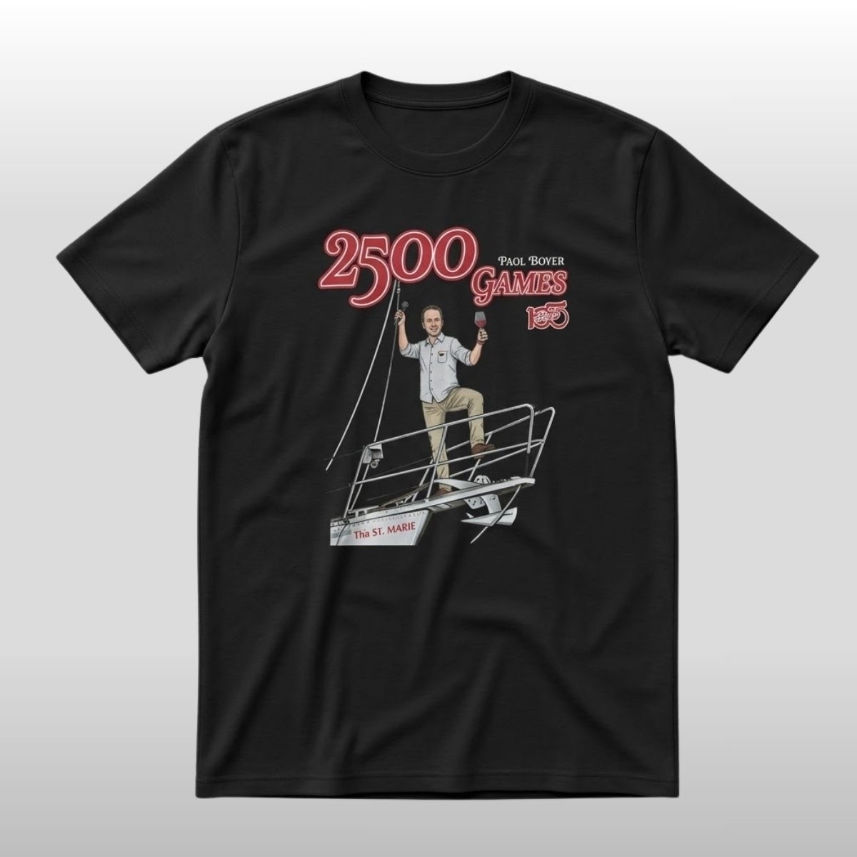 The shirt features a striking graphic that departs from the standard team logo to focus on the man of the hour. Centered on a classic black cotton canvas, the design portrays Paul Boyer in a moment of celebration, perched atop a boat—a nod to his personality and well-earned downtime away from the rink.