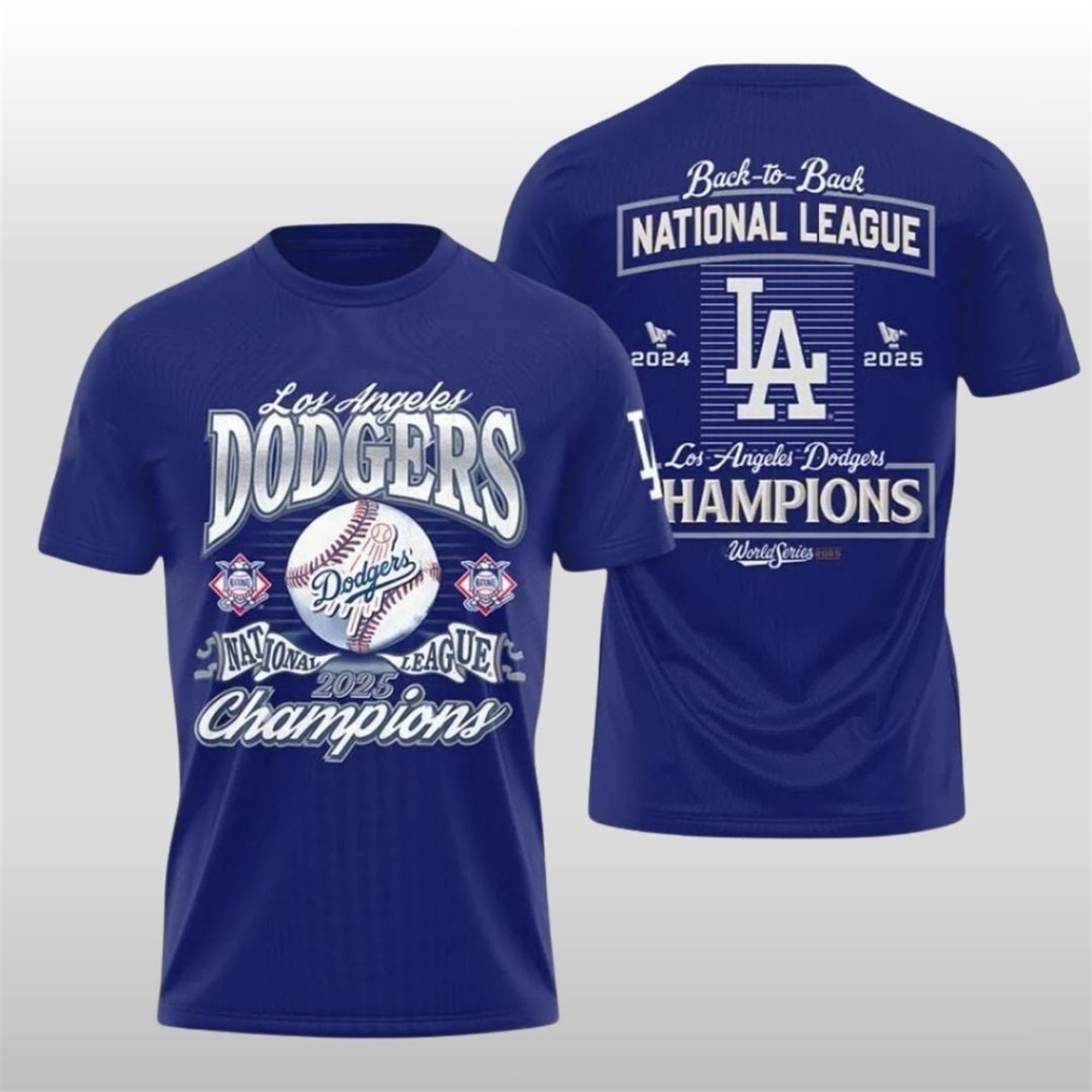 The front boldly declares the team as “Los Angeles Dodgers National League 2025 Champions,” wrapped around an iconic baseball graphic featuring the team’s script logo and championship emblems. The back of the shirt delivers an even stronger message of dominance: “Back-to-Back National League Champions,” featuring the iconic “LA” logo flanked by the years 2024 and 2025, solidifying their run of consecutive success and their place in the final, highly anticipated World Series.