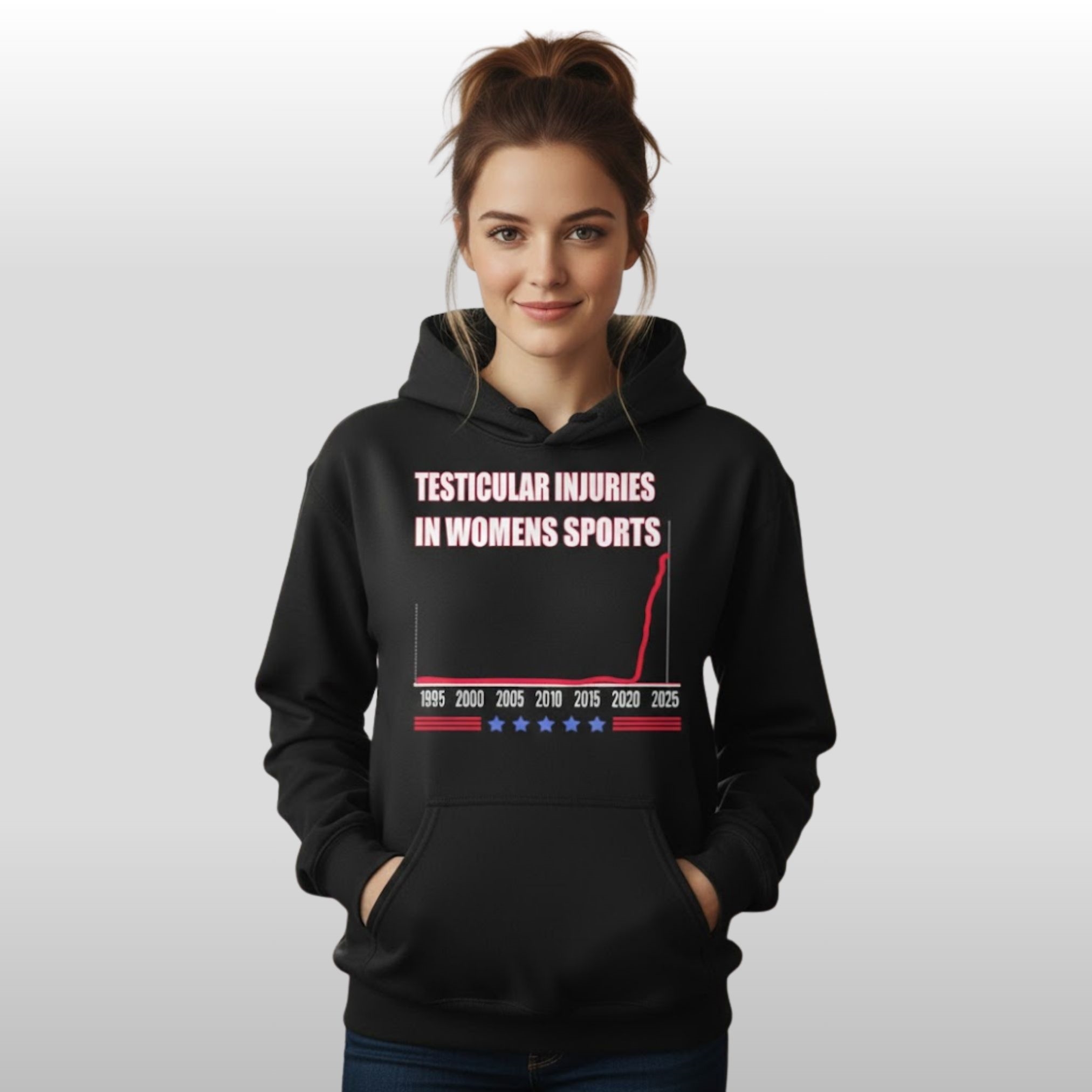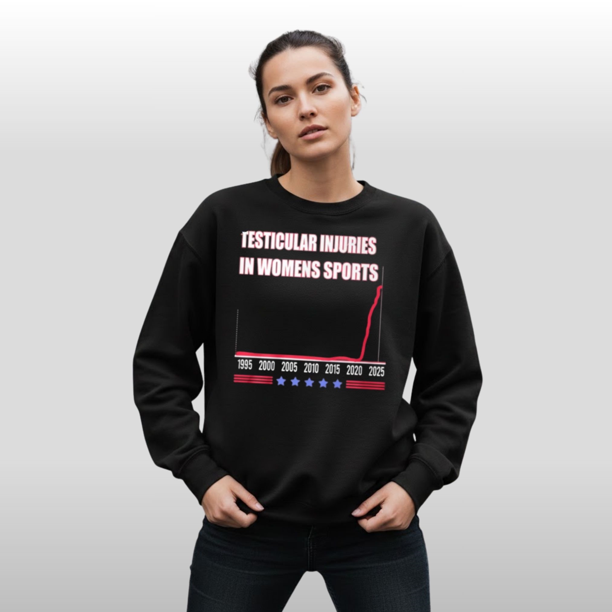 The Don Keith Testicular Injuries In Womens Sport Shirt is a high-quality, provocative piece of apparel designed for those who value tradition and clarity in competition. Crafted from premium, soft-touch cotton, this garment features a striking graphic on a deep black canvas. The design showcases a sharp line graph tracking a dramatic spike in specific injury data from 1995 to 2025, framed by patriotic stars and stripes.