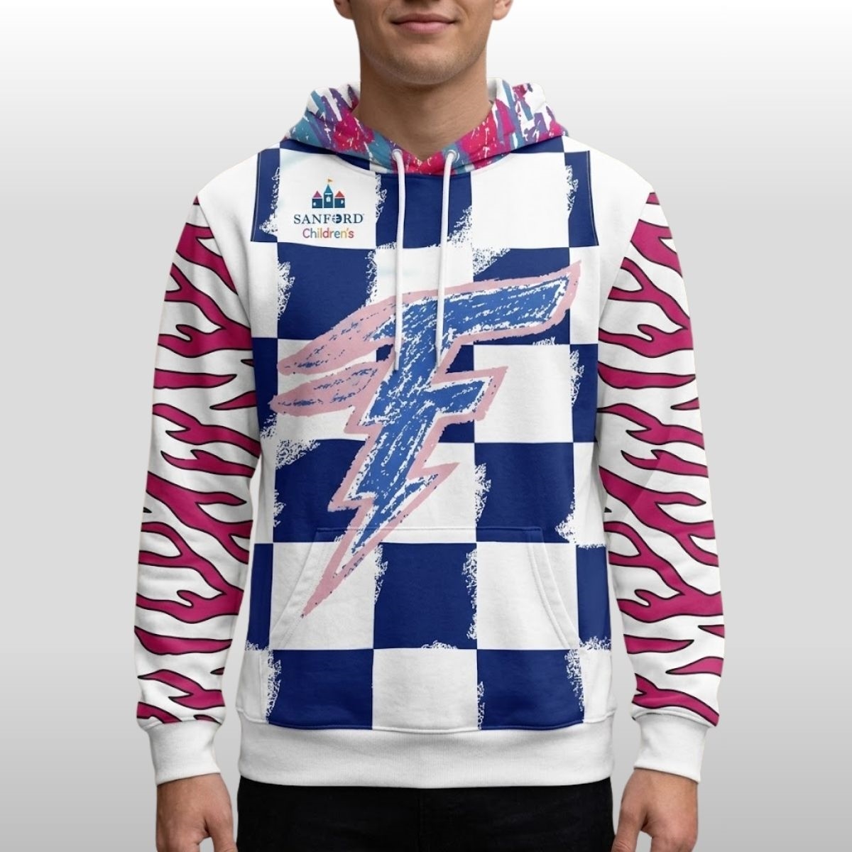 The hoodie is a visual explosion of energy and purpose. Moving away from standard team palettes, this design features a bold, navy-and-white checkered base that serves as a canvas for a “90s-inspired” retro aesthetic. The sleeves are adorned with striking pink flame patterns, while the hood features a “splatter paint” effect in bright magenta and teal, reflecting the playful and resilient spirit of the children it honors.