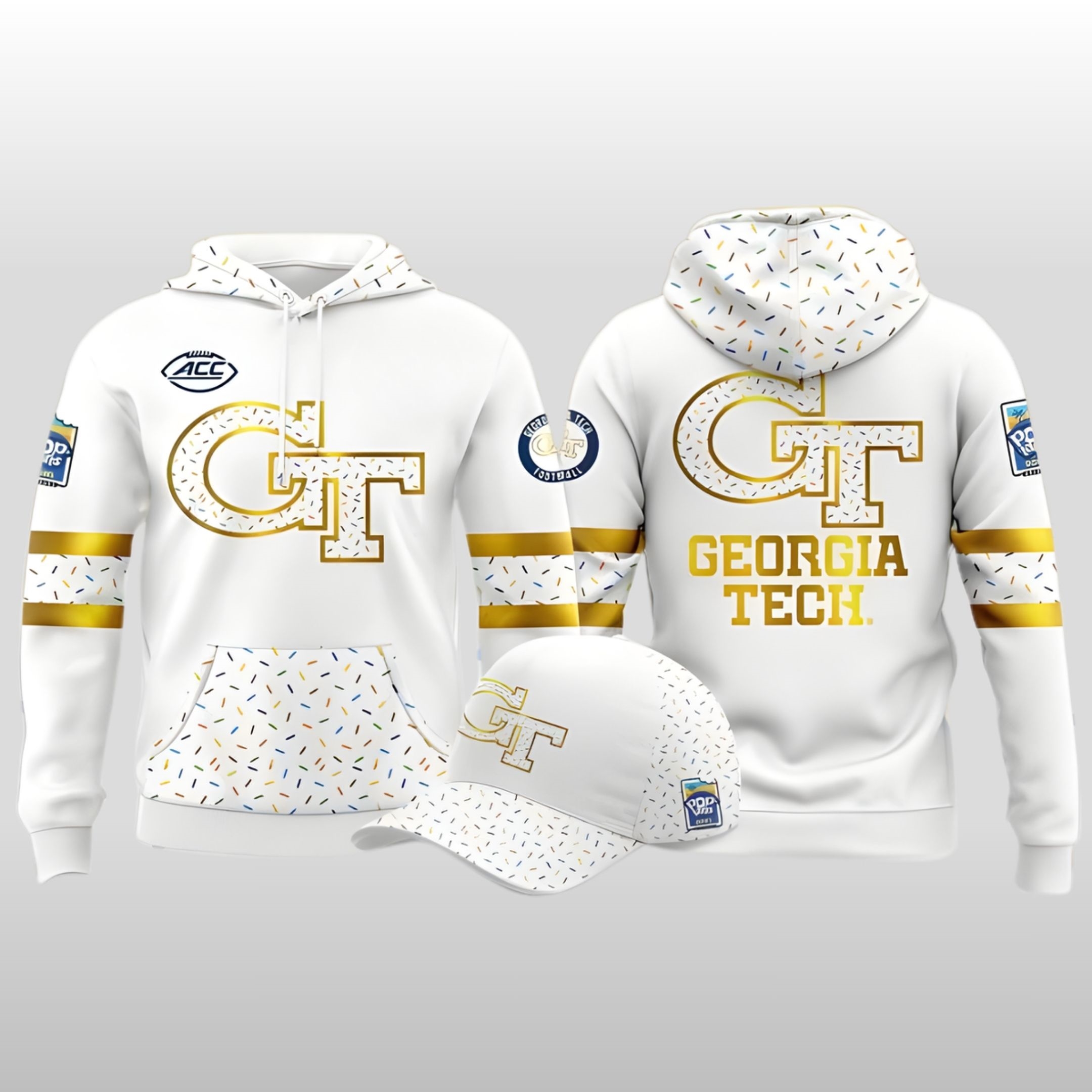 Commemorate a legendary performance in Orlando with the one-of-a-kind Georgia Tech Football Frosted Sprinkled Pop Tarts Bowl Orlando Hoodie Shirt. This premium apparel captures the fun and energy of the postseason, featuring a crisp white base adorned with a vibrant “frosted” aesthetic. The iconic Yellow Jackets “GT” logo is reimagined with a delicious sprinkle pattern, complemented by metallic gold accents and a celebratory sprinkles motif on the hood, pocket, and sleeves.