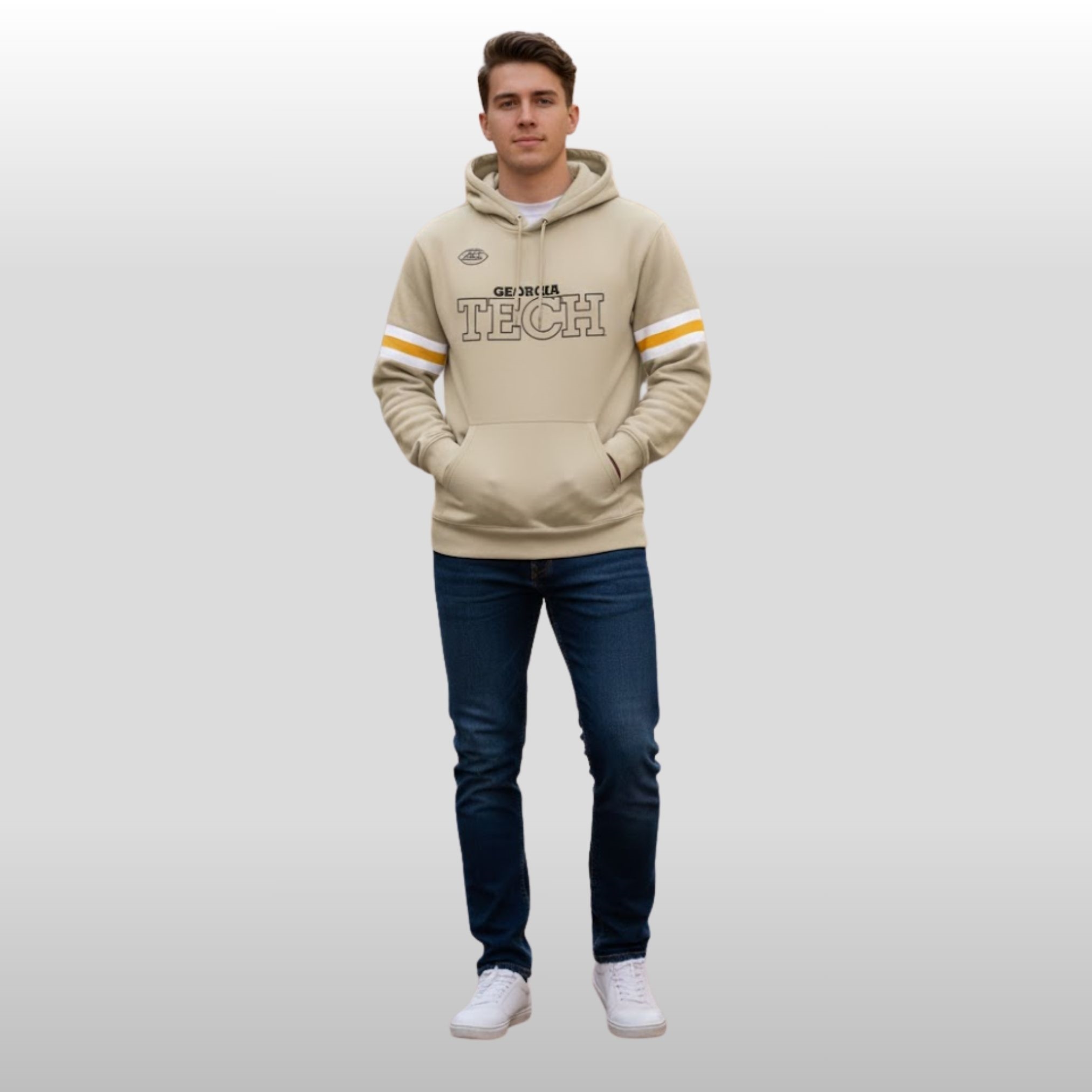 Turn it around to reveal the showstopper: a massive, stylized vertical “T” logo with “GEORGIA TECH” integrated into the design. The sleeves are accented with vibrant white and gold racing stripes, giving it a classic varsity vibe with a contemporary edge. This Georgia Tech commemorative sweatshirt is crafted from heavy-duty yet soft fabric, ensuring you stay warm whether you’re in a lecture hall or at a night game.