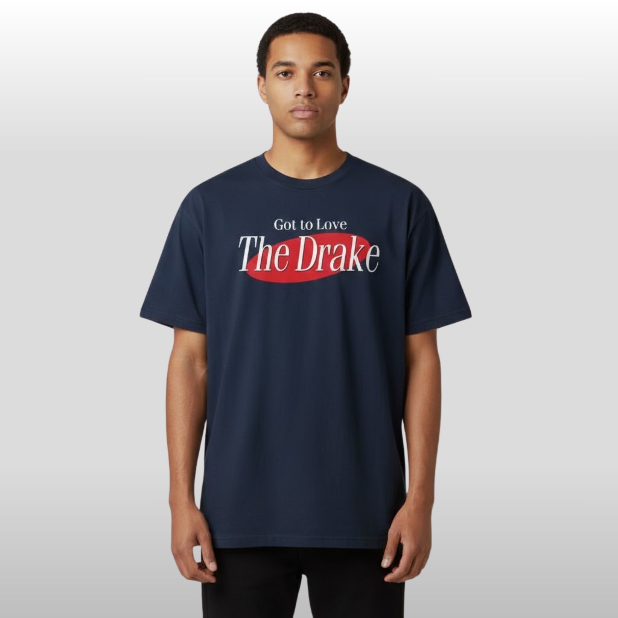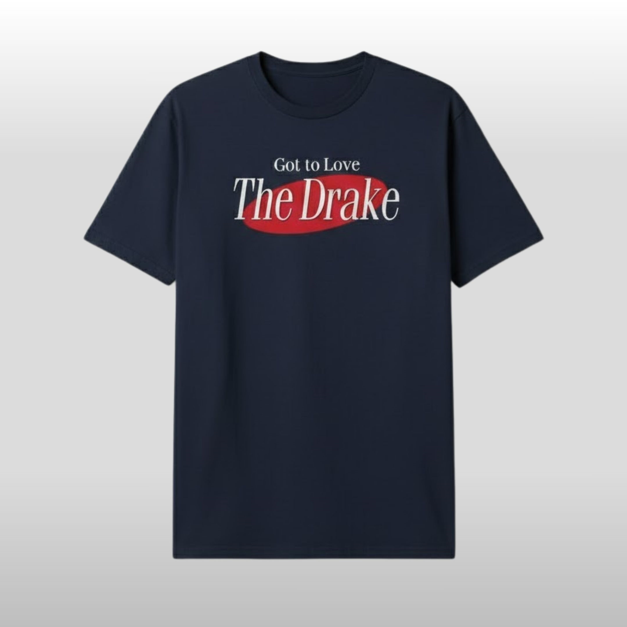 This shirt is a masterclass in minimalist design with maximum impact. Moving away from the cluttered graphics of standard fan gear, it features a clean, navy blue base that serves as the perfect canvas for its bold message. The front displays the phrase “Got to Love” in elegant white serif typography, anchored by the iconic “The Drake” text set against a striking red oval.