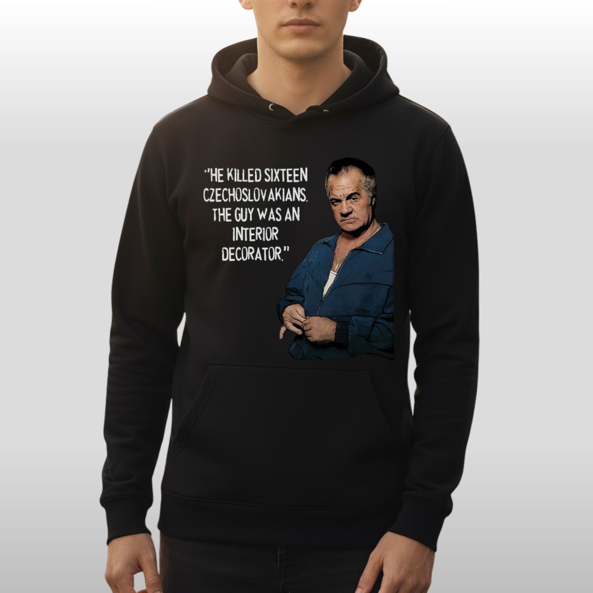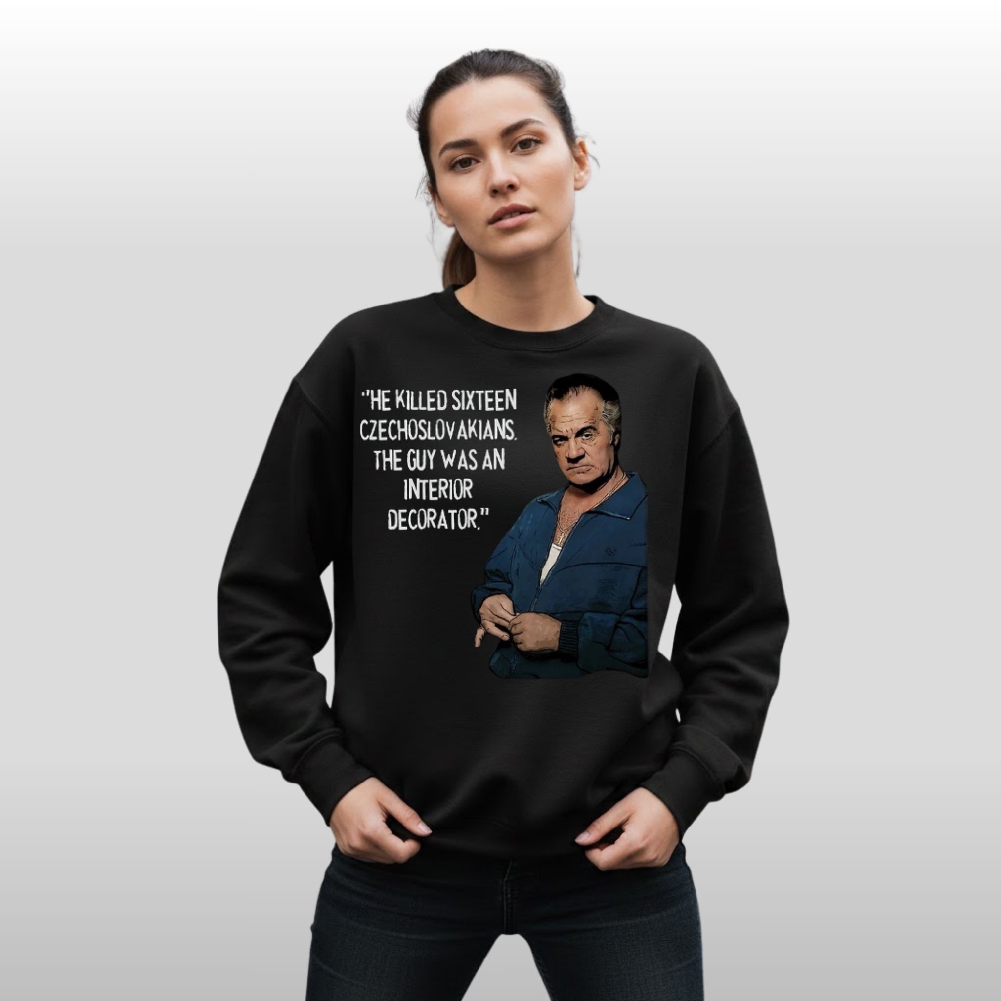 Step into the world of New Jersey’s most famous crew with our He Killed Sixteen Czechoslovakians The Guy Was An Interior Decorator Shirt. This premium shirt features a high-quality graphic of Paulie Walnuts, capturing his signature look of confusion and confidence. The bold, white text immortalizes the hilarious game of “telephone” from the legendary episode Pine Barrens, where a dangerous Russian commando is hilariously misidentified as a home designer.