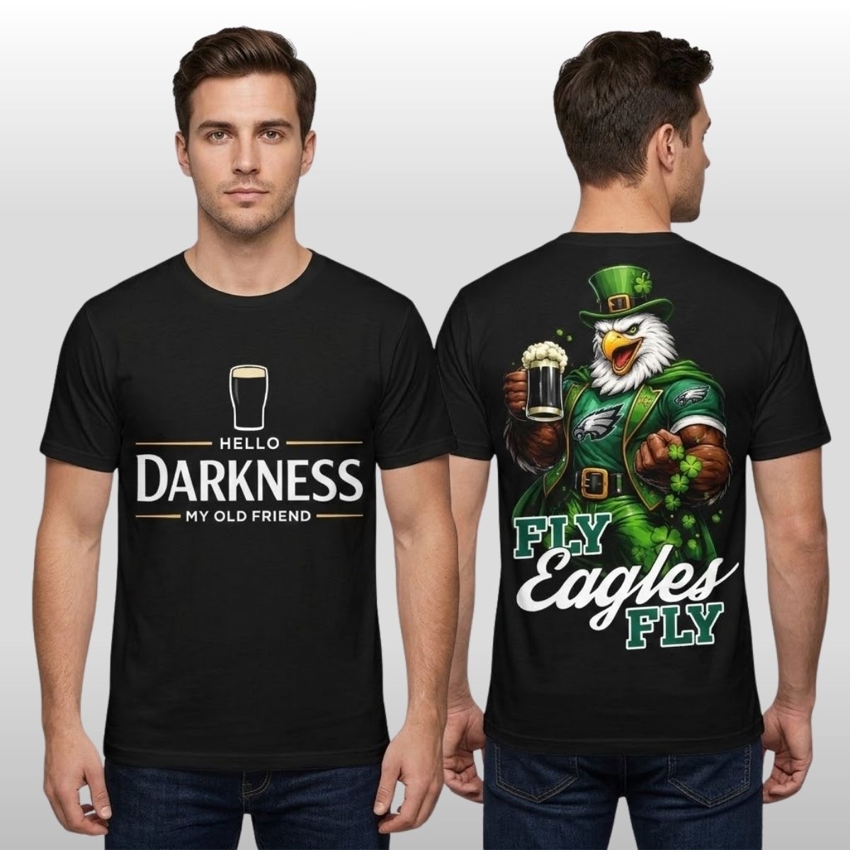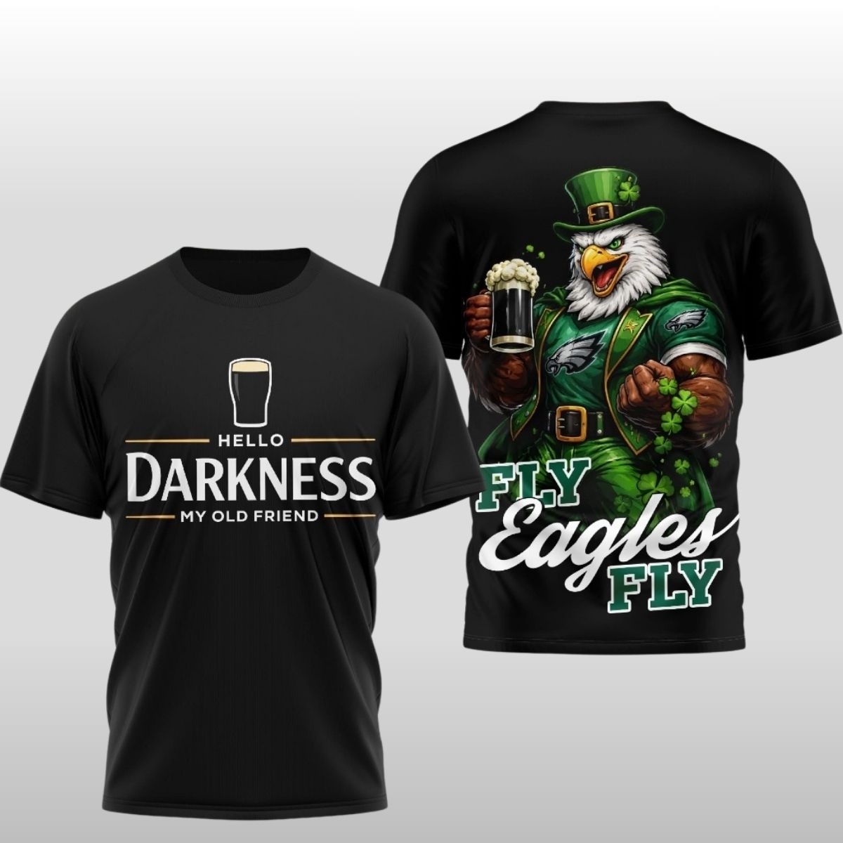 The back of the shirt is where the energy truly ignites. A powerful, leprechaun-inspired eagle mascot takes center stage, clad in vibrant green gear and ready for action. The bold “Fly Eagles Fly” typography anchors the design, surrounded by shamrocks and Celtic-inspired elements that celebrate the rich heritage and fighting spirit of the fan base. The contrast between the sleek front and the explosive back creates a dynamic visual experience.