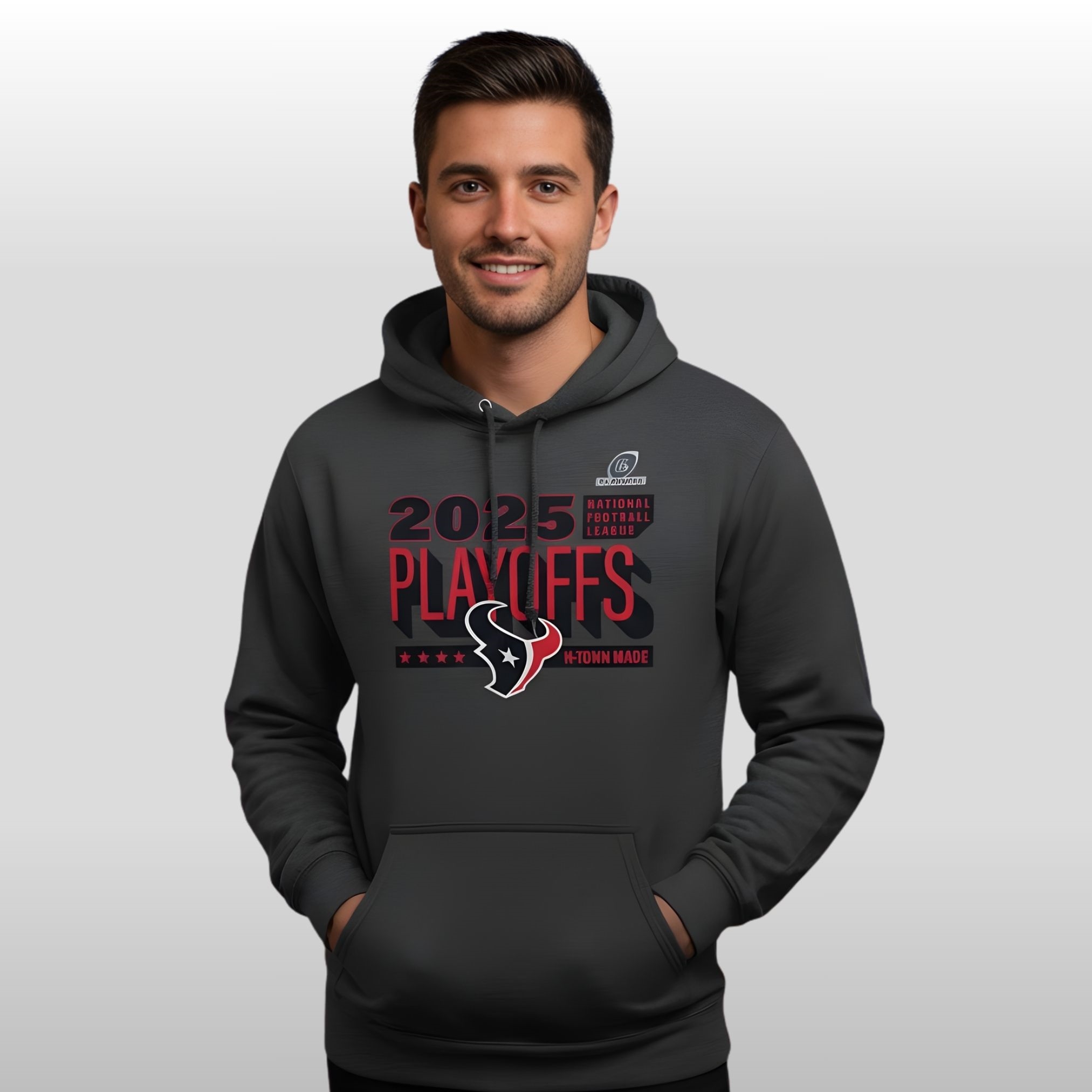 This charcoal heather hoodie features high-impact graphics on both sides to ensure your loyalty is seen from every angle. The front boldly displays the “2025 Playoffs” branding alongside the iconic Texans bullhead logo and the definitive “H-Town Made” seal of authenticity.