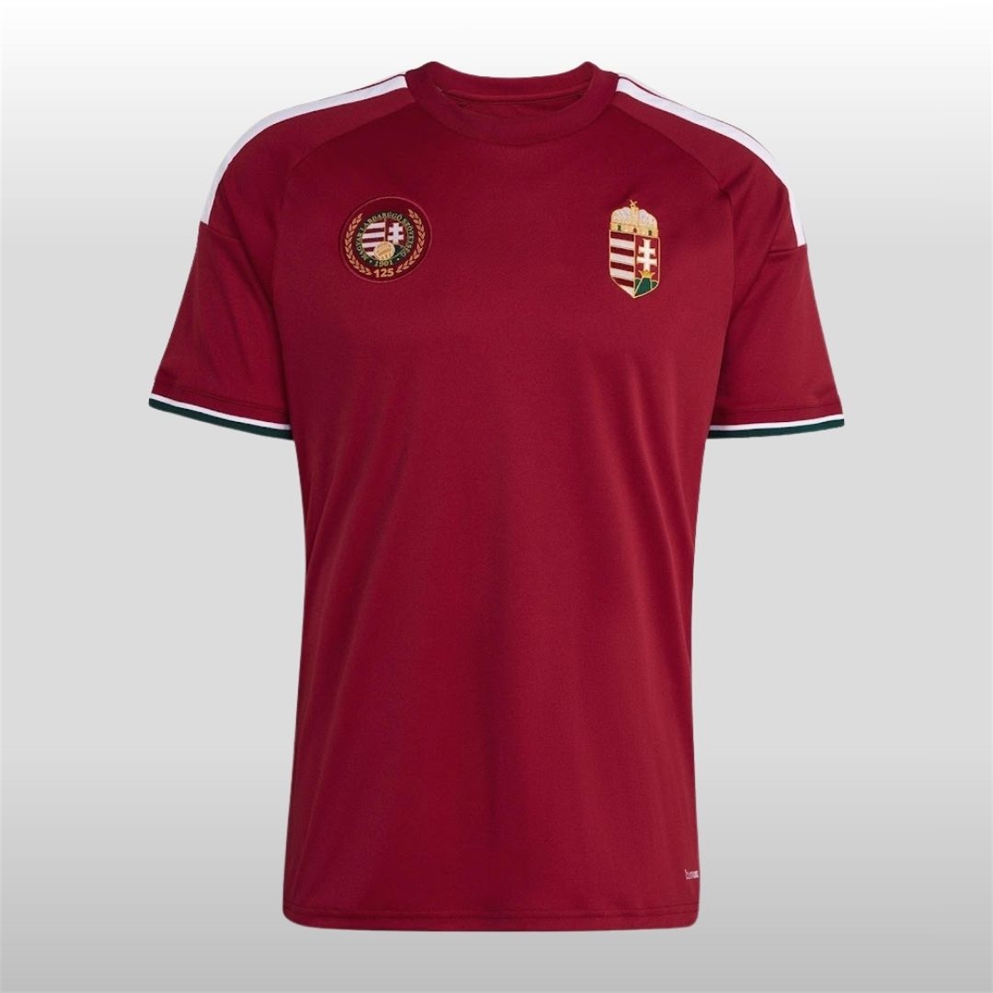 The jersey features a classic, evocative design that honors the nation’s footballing past. Proudly displayed on the chest are two significant emblems: the iconic Hungarian national team crest, and a special jubilee emblem celebrating 125 years of the Hungarian Football Federation. Clean white Adidas stripes run along the shoulders, contrasting beautifully with the deep red fabric. The sleeves are trimmed with the national colours—white, green, and red—a subtle yet powerful nod to the Hungarian flag.