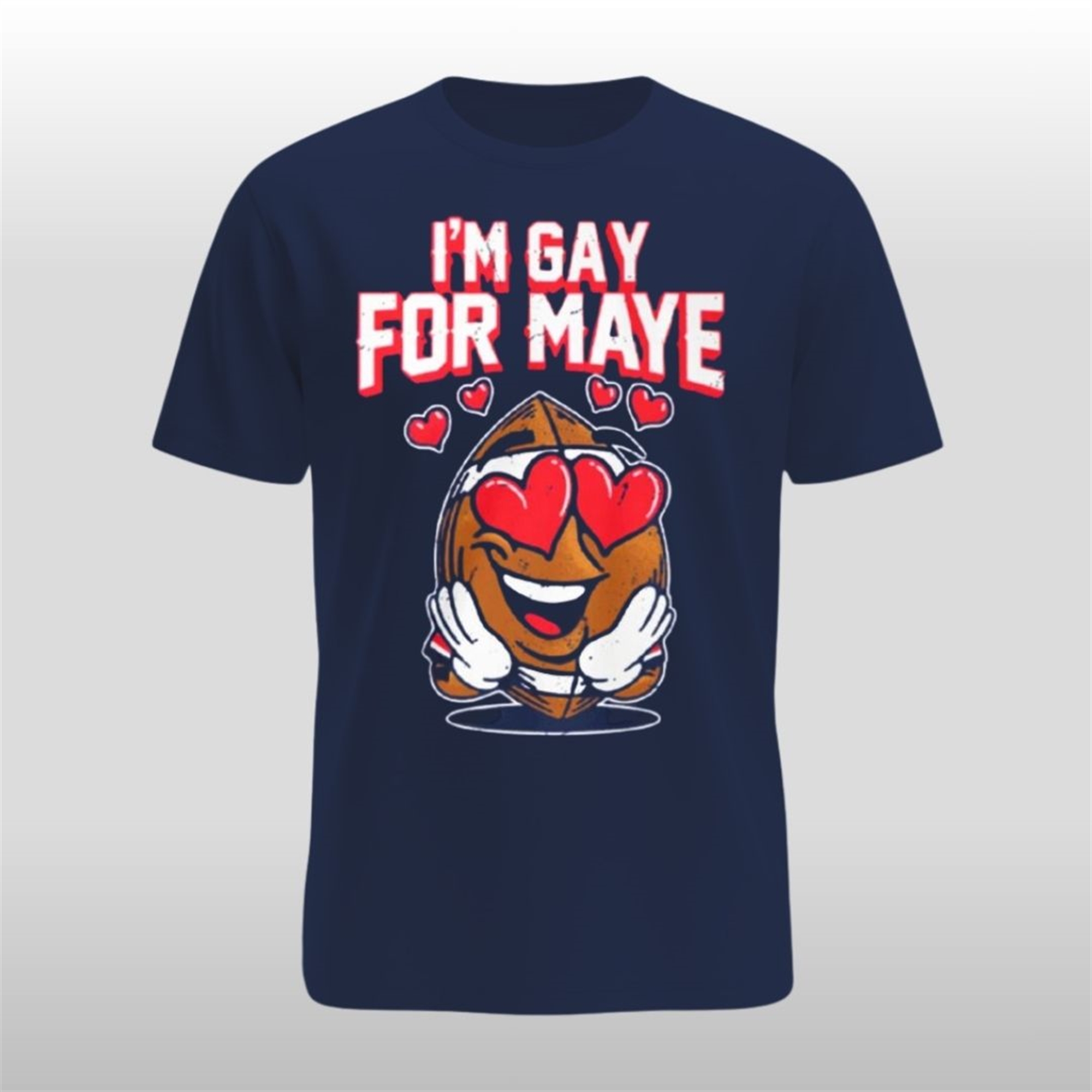 The I’m Gay For Maye Shirt features a bold, eye-catching design on a comfortable navy tee. Dominating the center is a grinning, anthropomorphic football character with hands excitedly placed on its cheeks and big, heart-shaped eyes, clearly smitten. The text “I’M GAY FOR MAYE” is emblazoned above the image in a vibrant, slightly distressed font, surrounded by small floating hearts, perfectly capturing a feeling of joyful, overwhelming admiration.