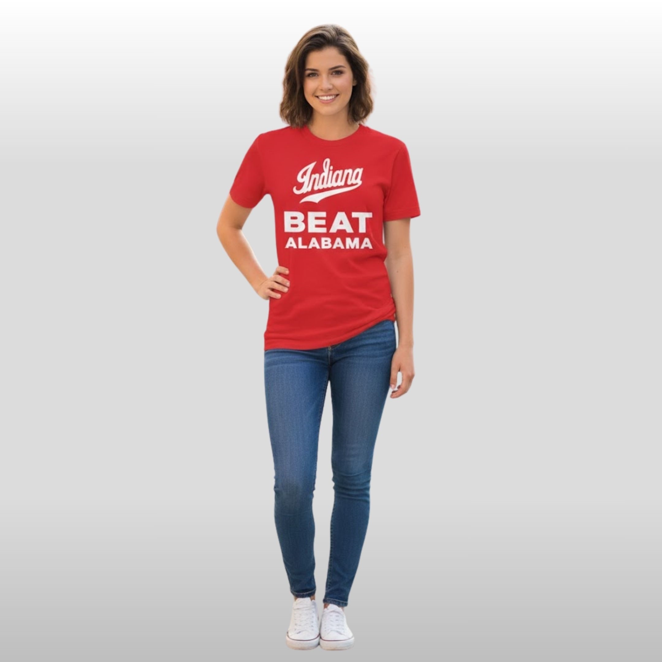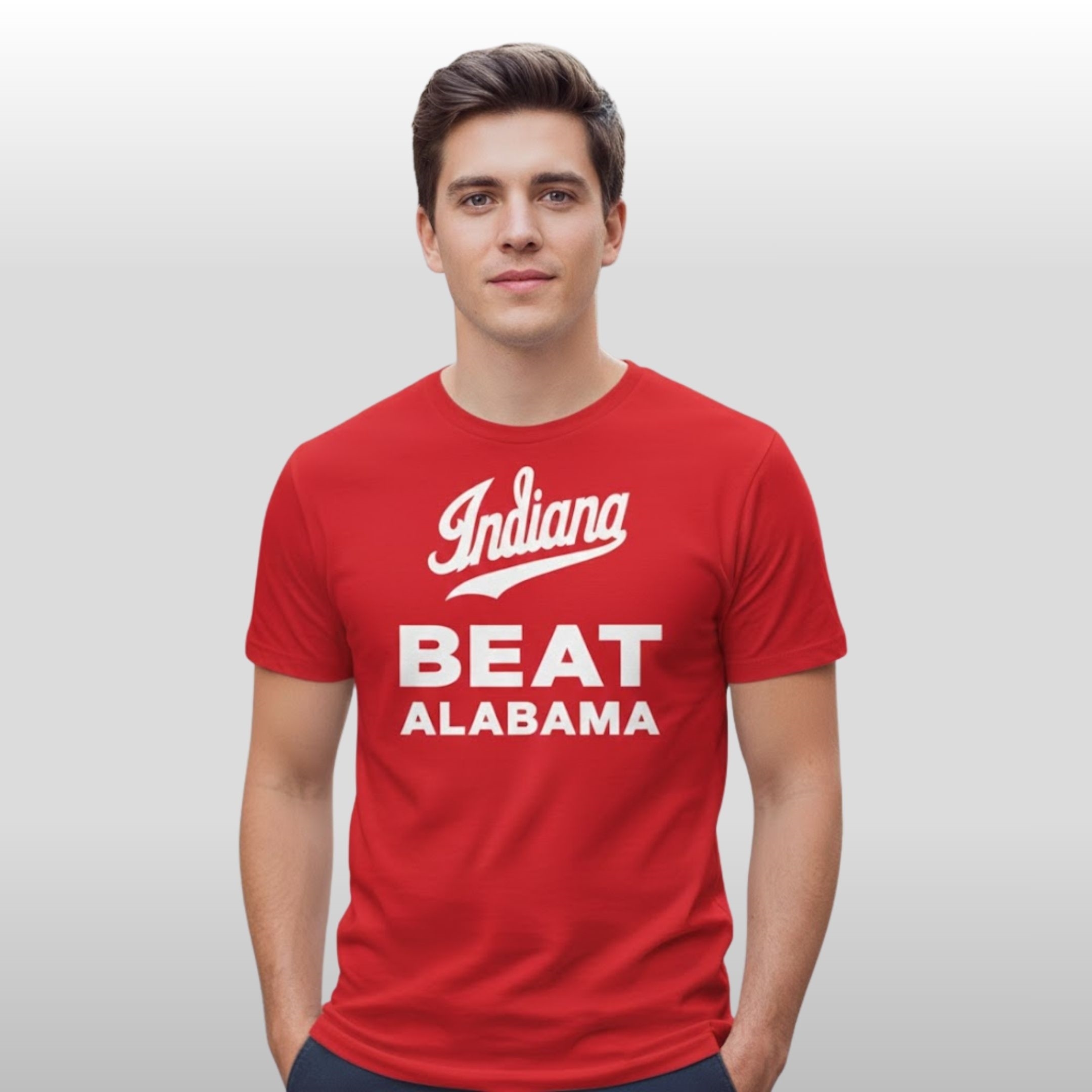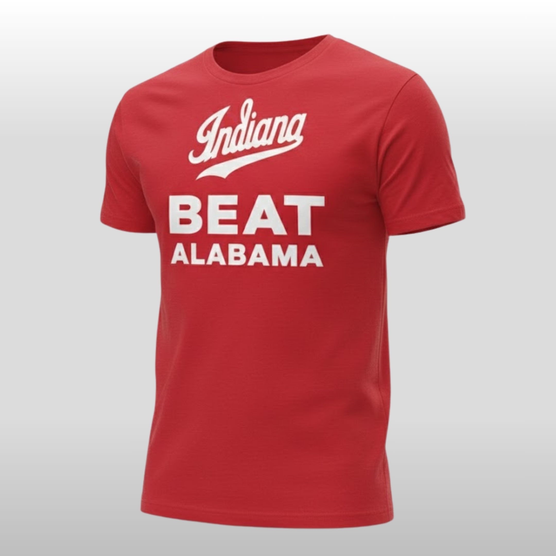 This isn’t just another piece of fan gear; it’s a high-quality commemorative garment designed for comfort and style. The shirt features a bold, crimson-red base that mirrors the intensity of the game. At the chest, the iconic “Indiana” script sits proudly above the high-contrast, block-lettering declaration: BEAT ALABAMA.