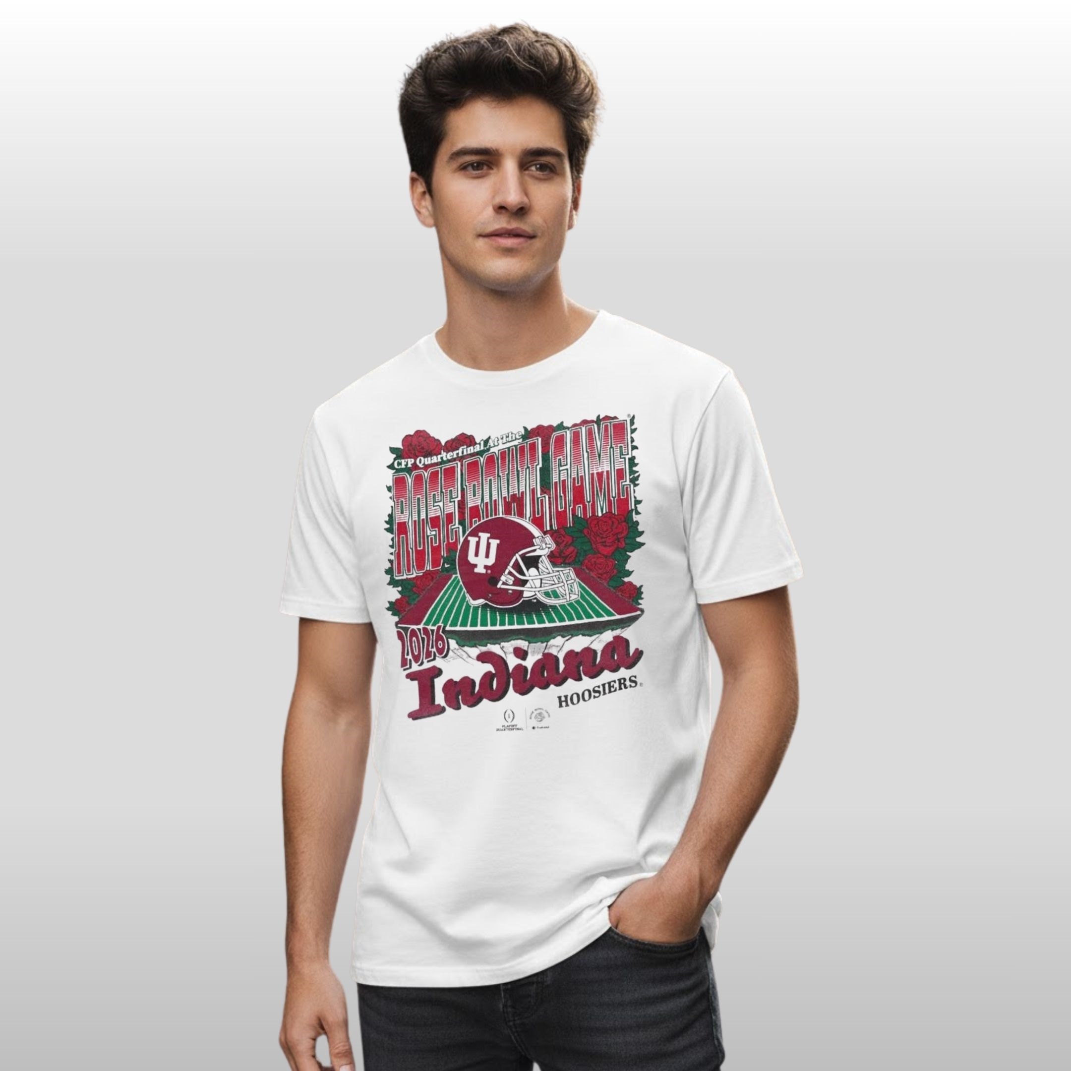 Celebrate an unforgettable season with the Indiana Hoosiers 2026 CFP Quarterfinal At The Rose Bowl Game Shirt. This premium apparel captures the electric energy of the January 1st showdown in Pasadena. The design features a bold, classic crimson helmet centered on a lush green field, framed by iconic blooming roses and vintage-style typography.