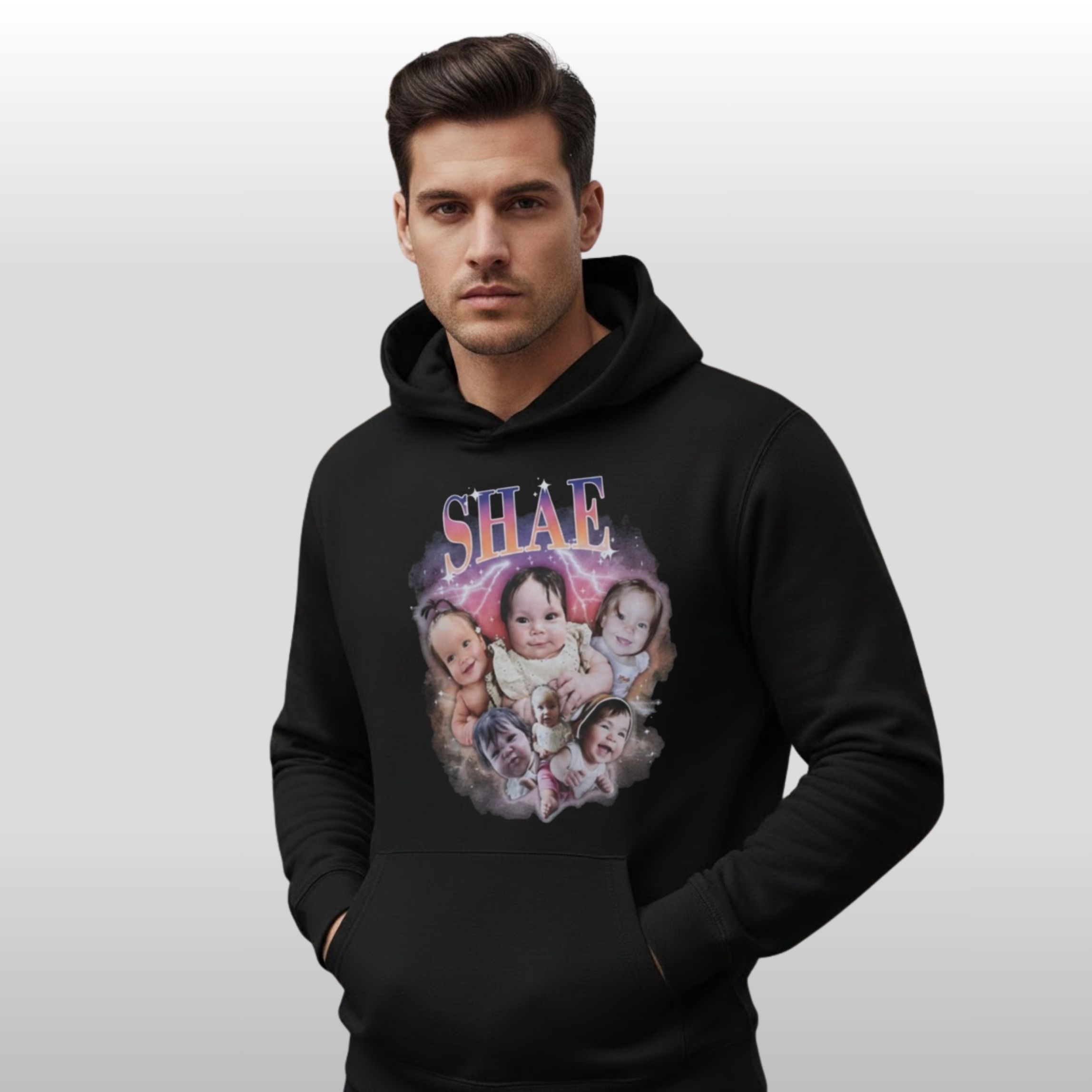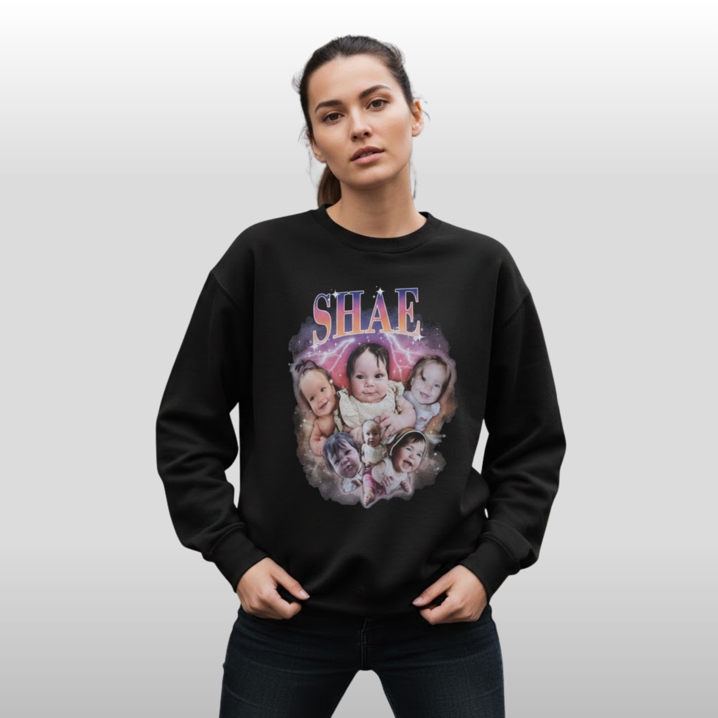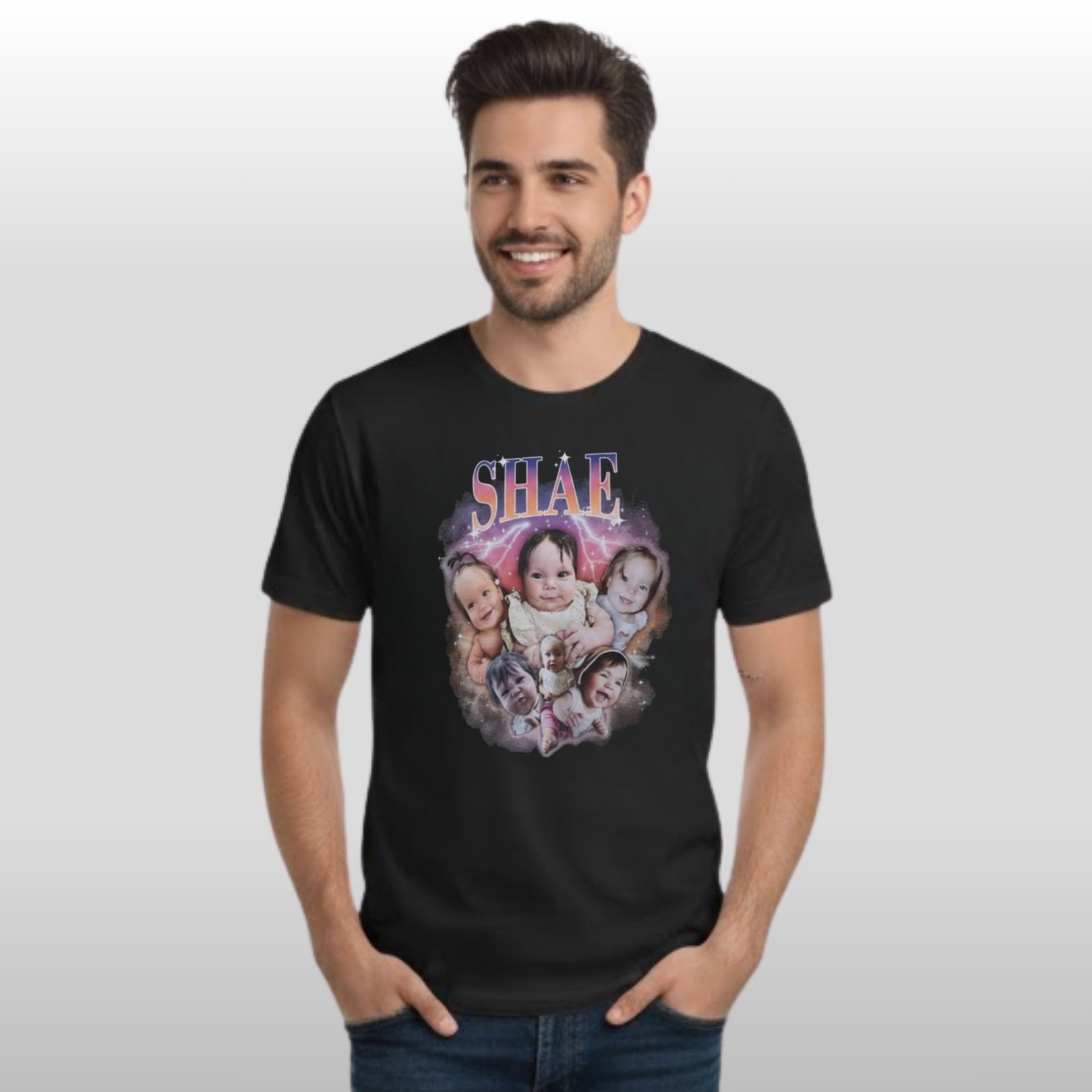 This Trevor Lawrence Shae baby photo apparel perfectly captures the retro aesthetic while remaining modern in its appeal. By using a collage of various infant expressions—from curious gazes to wide smiles—the shirt creates a visual narrative of joy. It avoids the stiff, corporate look of traditional merchandise, opting instead for a soft, airbrushed galaxy background that makes the imagery pop against the classic black fabric.