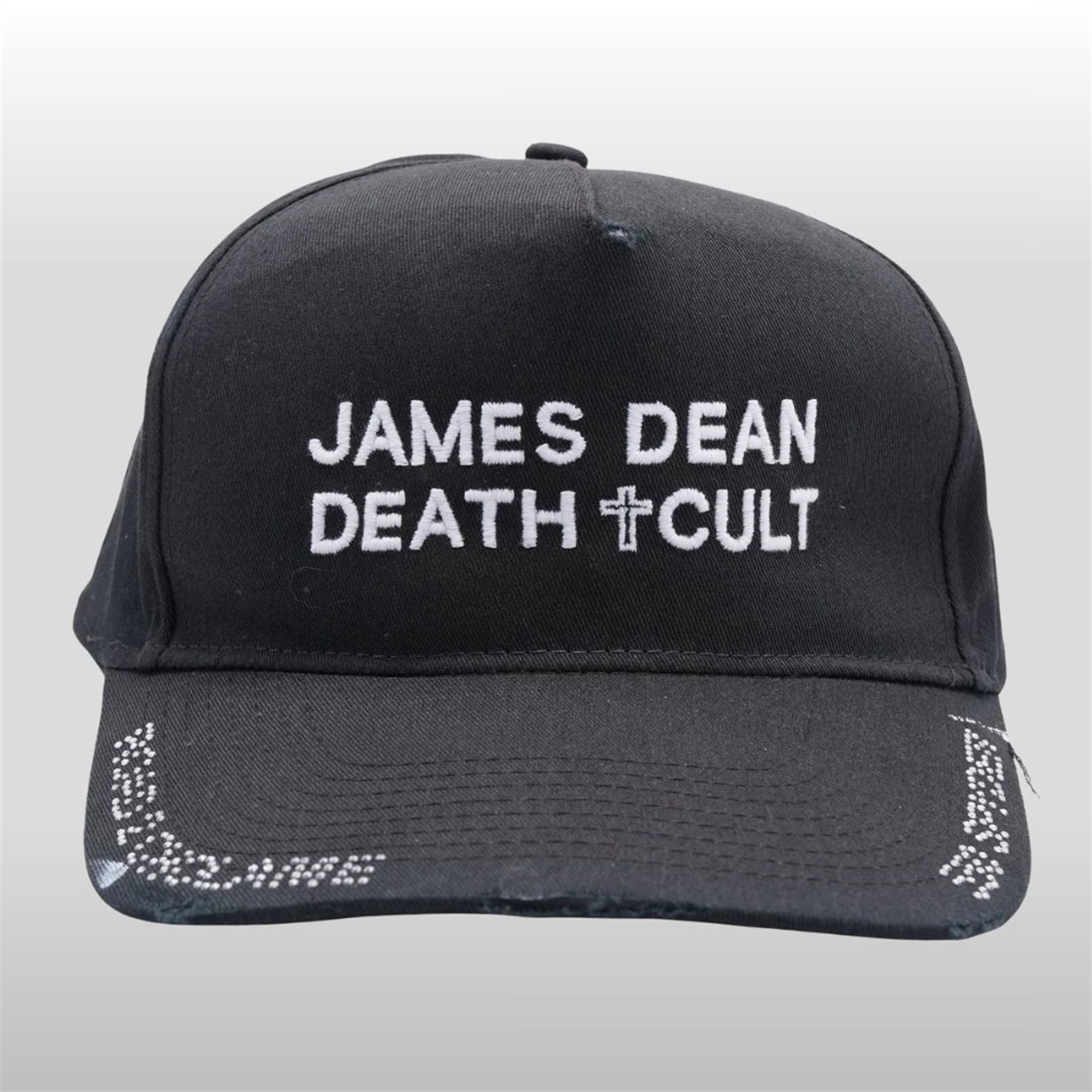 The James Dean Death Cult Hat is a classic black baseball cap featuring striking white embroidered text across the front: “JAMES DEAN DEATH $\dagger$ CULT.” The use of the cross symbol ($\dagger$) further emphasizes the themes of devotion, untimely end, and lasting cultural reverence. Subtly styled decorative stitching adorns the brim, adding an edge to the classic silhouette. This adjustable cap offers a timeless, comfortable fit for anyone drawn to the dark allure of Hollywood’s most famous rebel.