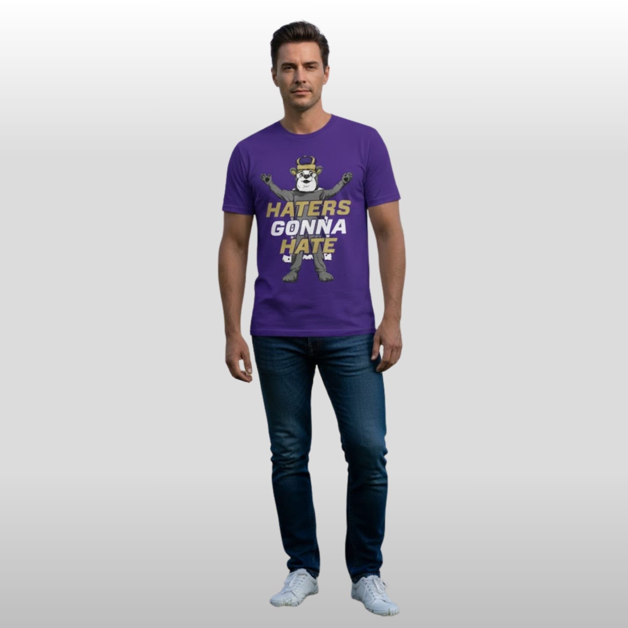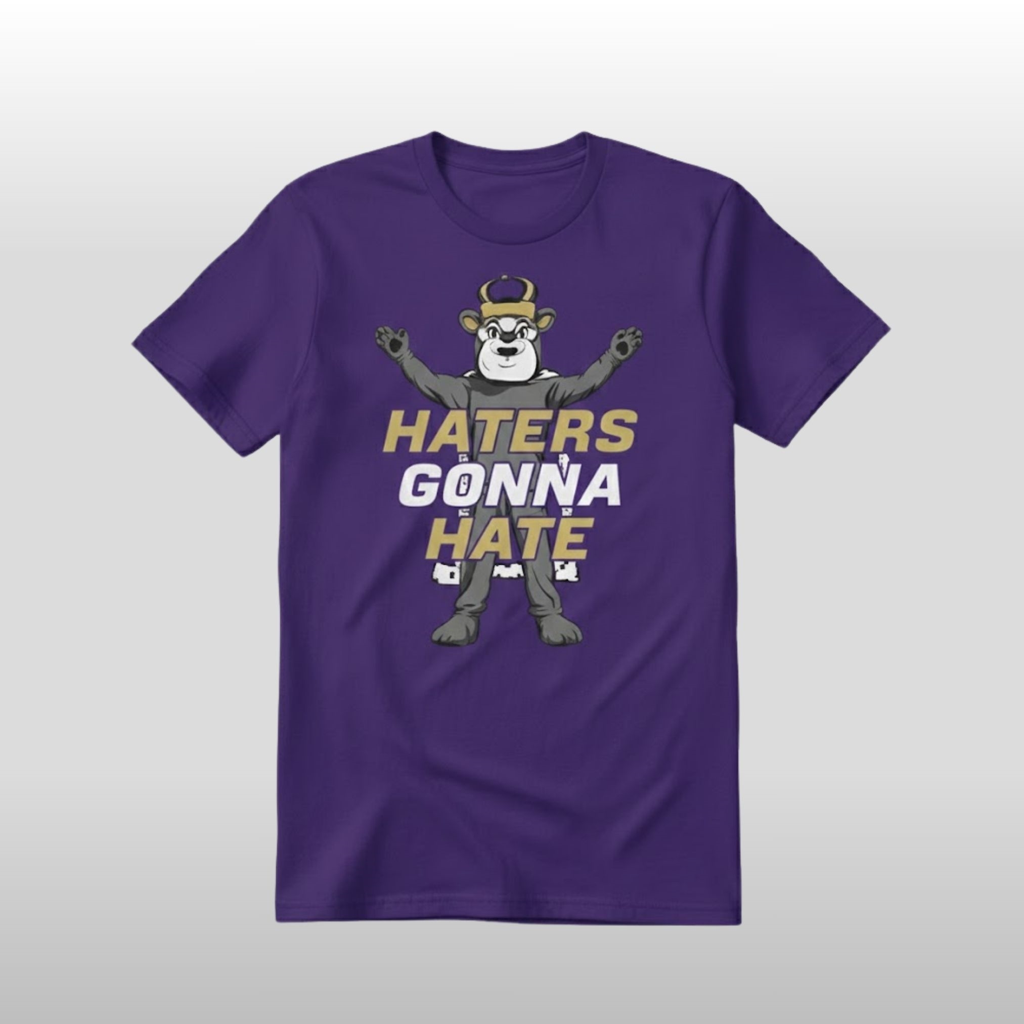 When your team is consistently climbing the ranks and shaking up the landscape, people are bound to talk. The JMU Football Haters Gonna Hate Shirt is the ultimate wardrobe essential for fans who embrace that competitive friction. This premium purple tee features a bold, stylized graphic of the iconic Duke Dog mascot, standing defiant with arms outstretched, wearing his signature crown. The design is punctuated by high-contrast gold and white typography that delivers a clear message to any doubters.