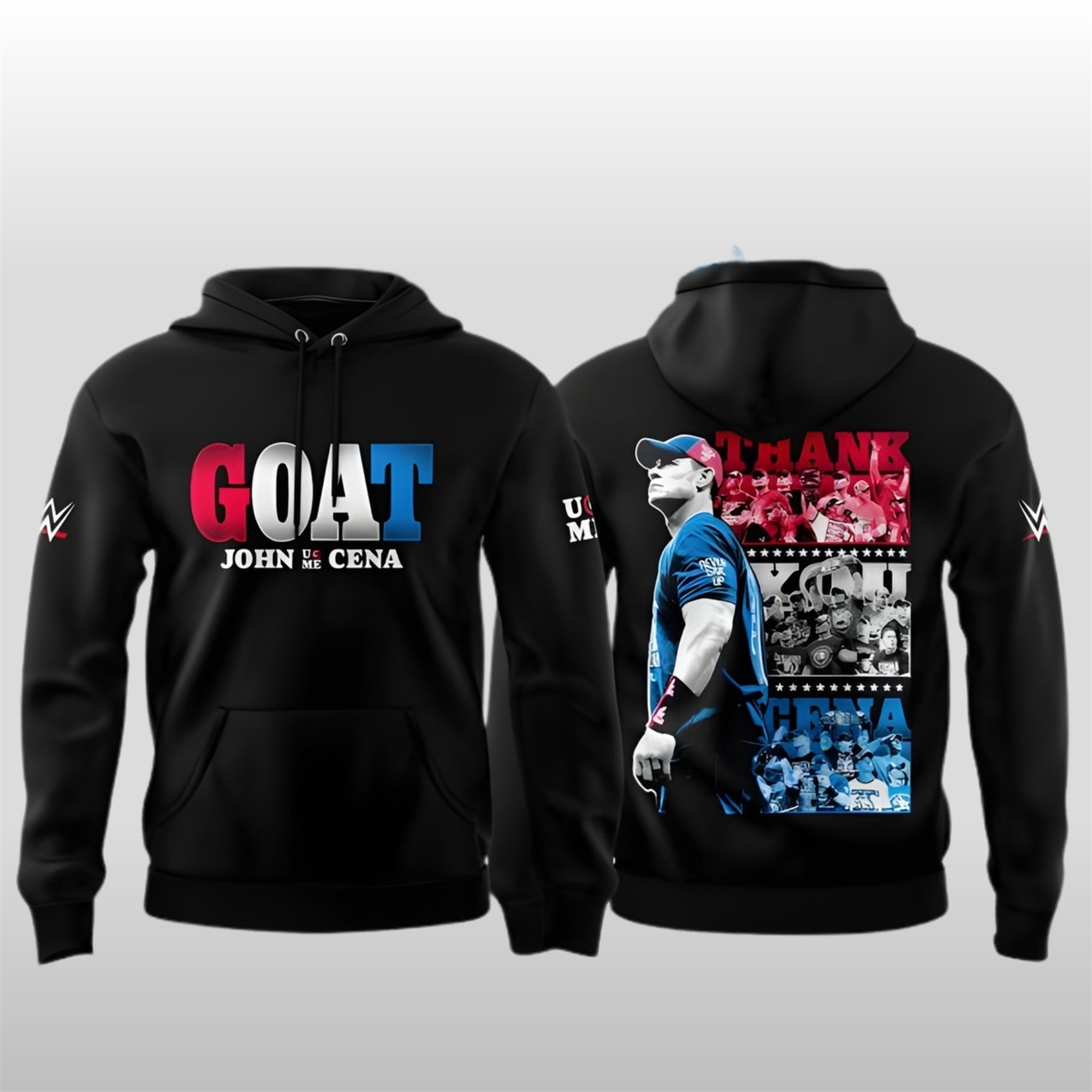 Unveil your dedication with the John Cena Thank You Cena 2025 Never Give Up Hoodie, the centerpiece of any true fan’s collection. This striking black pullover features a bold, patriotic-themed “G.O.A.T.” (Greatest of All Time) graphic on the front, instantly recognizing his status as a sports entertainment icon. The back is a powerful collage under the banner “THANK YOU CENA,” showcasing memorable moments and the star himself, a true visual timeline of his career.