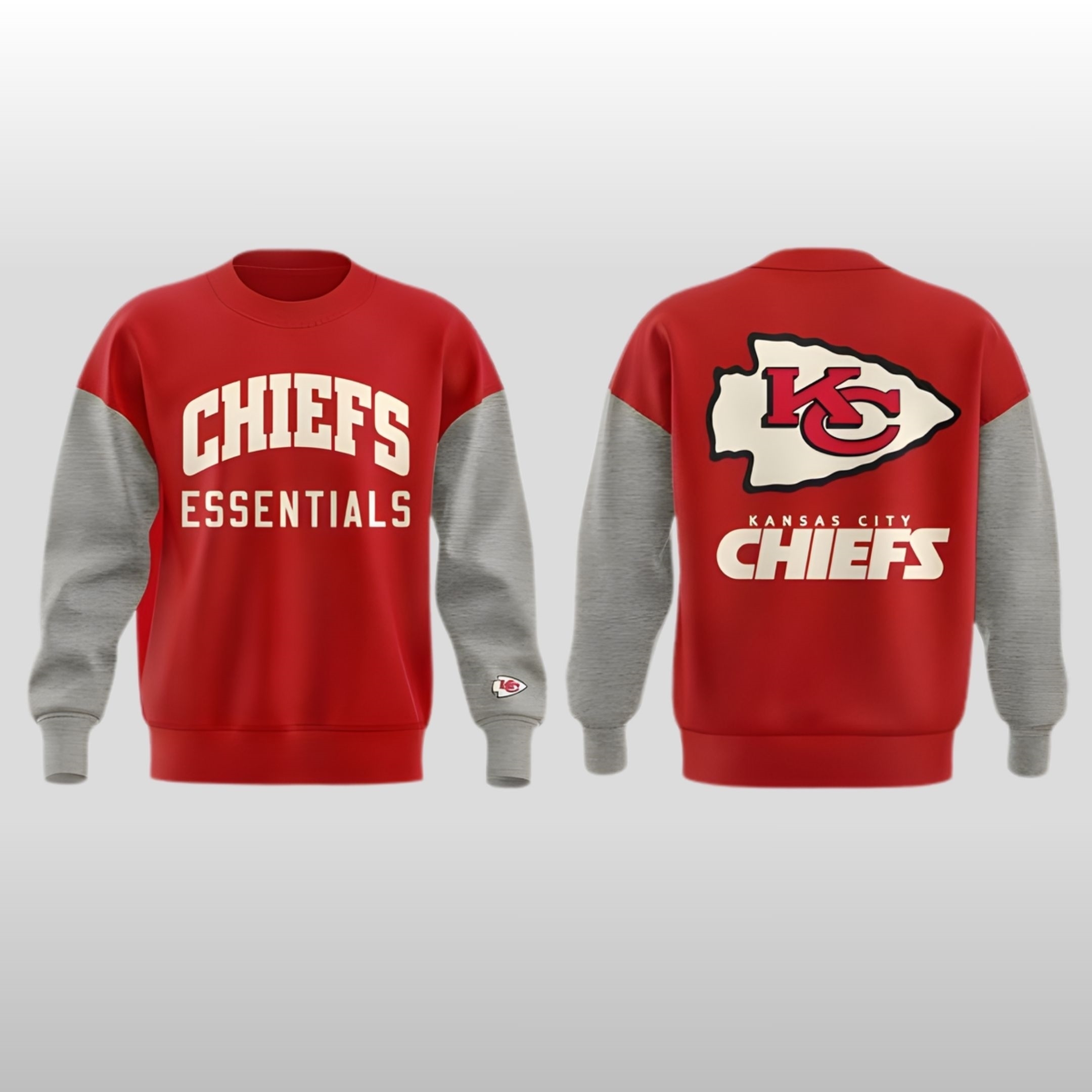 The design features a bold two-tone aesthetic with striking red body panels and heather gray sleeves. On the front, the “CHIEFS ESSENTIALS” typography pops in a classic collegiate font, while the back showcases the iconic arrowhead logo paired with a modern “Kansas City Chiefs” wordmark. This specific Travis Kelce-inspired Chiefs pullover is going viral because it captures the “Main Character” energy of one of the most charismatic players in the game today, making it perfect for victory parades, watch parties, or casual outings.