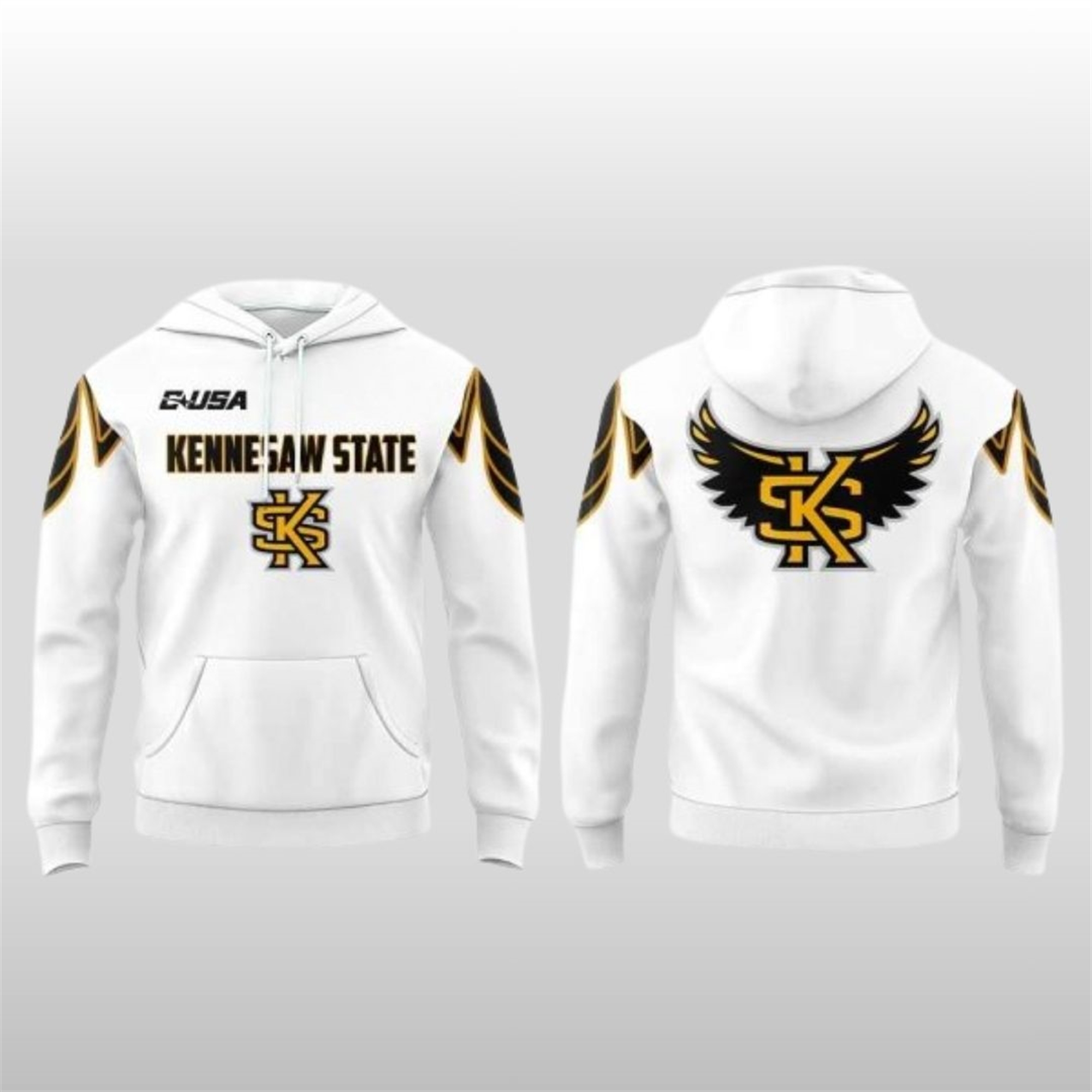 A major feature, derived from the emerging uniform design, is the dramatic winged motif on the reverse. The large, stylized golden wings frame the ‘KS’ emblem, symbolizing the Owls’ powerful ascent in college football. The shoulders boast chevron-like black and gold piping, echoing a sense of strength and unity. Crafted for comfort and warmth, this 2026 Kennesaw State Football White Uniform Hoodie is perfect for game days.