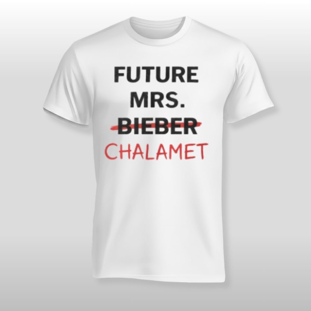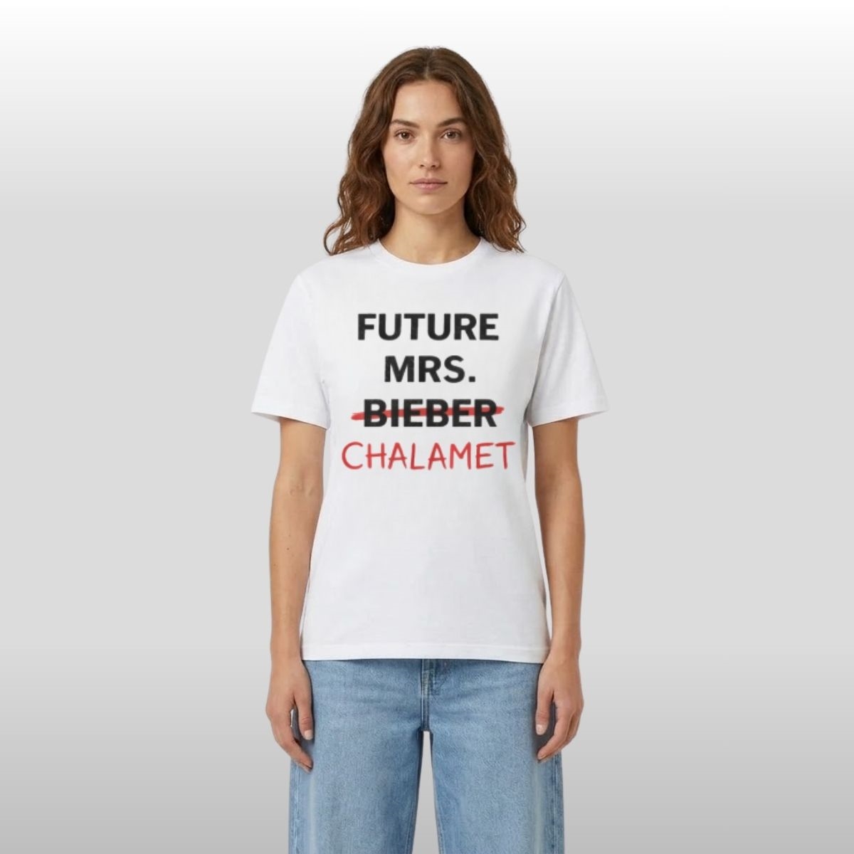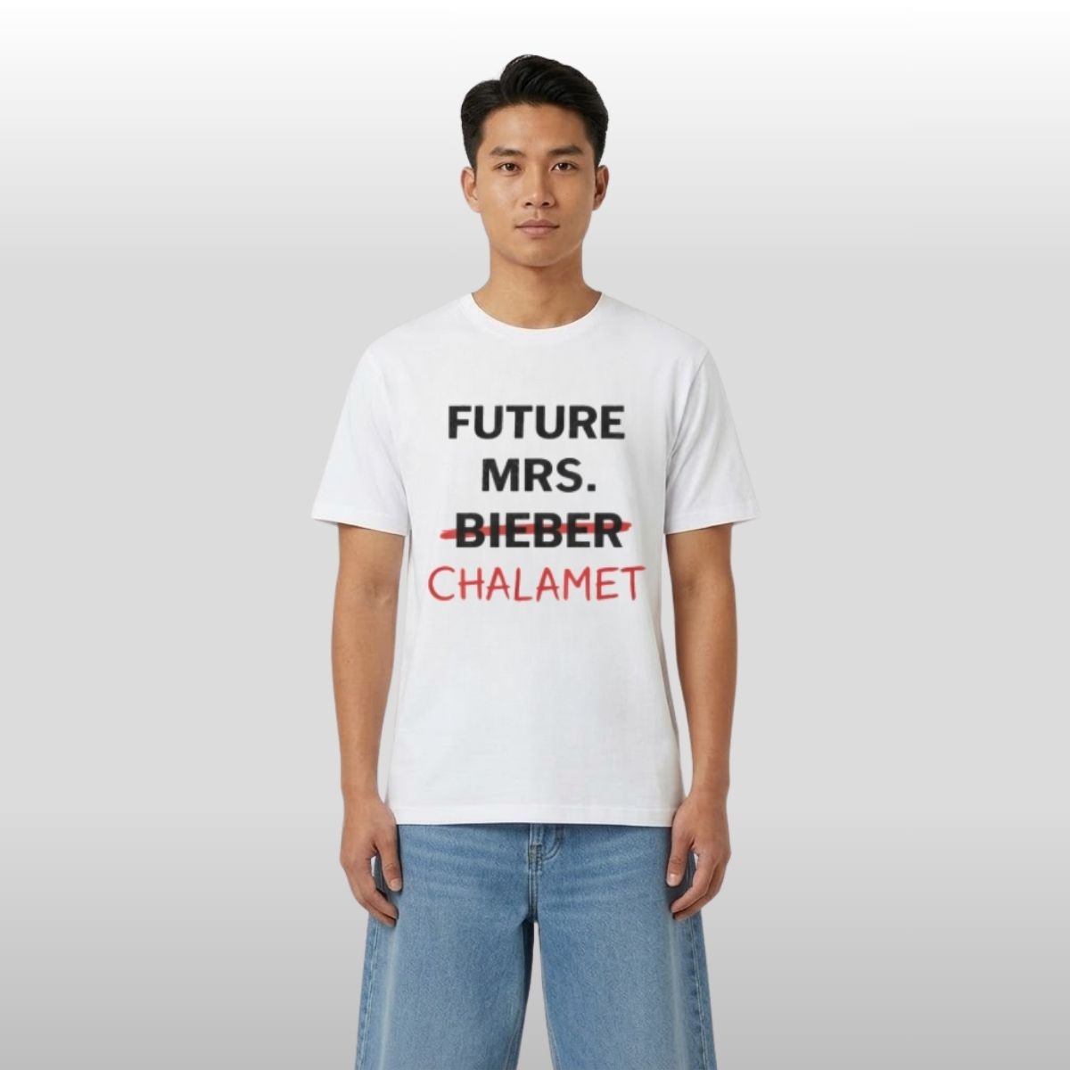 This minimalist white shirt features a bold and witty design that speaks directly to the internet’s obsession with A-list romances. The front of the shirt displays the text “FUTURE MRS.” followed by the name “BIEBER,” which has been cheekily crossed out with a thick red horizontal line. Directly underneath, the name “CHALAMET” is written in a vibrant red, handwritten-style font. This clever visual joke mirrors the real-world shift in media attention from one heartthrob to another, making it a relatable piece for anyone who follows the latest Hollywood headlines.
