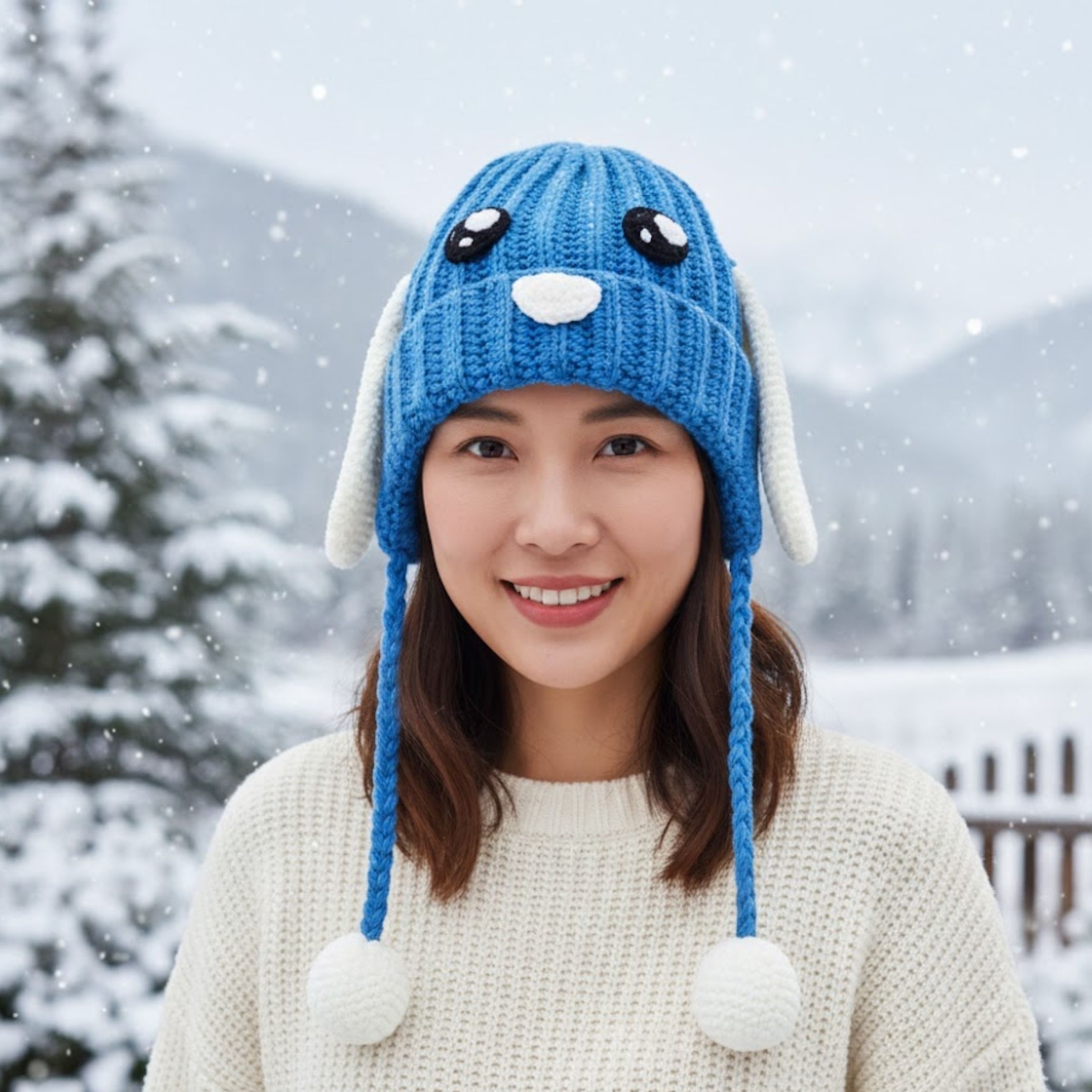 The Bunny Ice Hat is a standout piece in modern knitwear, prioritizing both texture and personality. Moving away from standard, plain beanies, this hat features a vibrant blue ribbed knit that provides a snug, flexible fit for all ages. The design is centered around its adorable character features: large, expressive “kawaii” eyes and a soft white muzzle that give the hat a friendly, animated appearance.