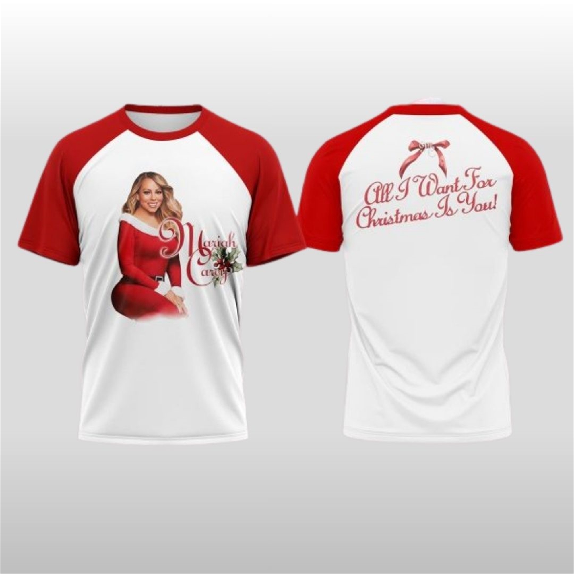 Dive into the Christmas cheer with the must-have Mariah Carey All I Want For Christmas Is You Hoodie. This eye-catching raglan-style hoodie features a vibrant red and crisp white color block, instantly evoking classic holiday aesthetics. The front boasts a captivating graphic of the Queen of Christmas herself, Mariah Carey, in a glamorous holiday-themed pose with her signature and festive holly accents. The back delivers the ultimate statement, featuring the beloved, cursive lyric: “All I Want For Christmas Is You!”