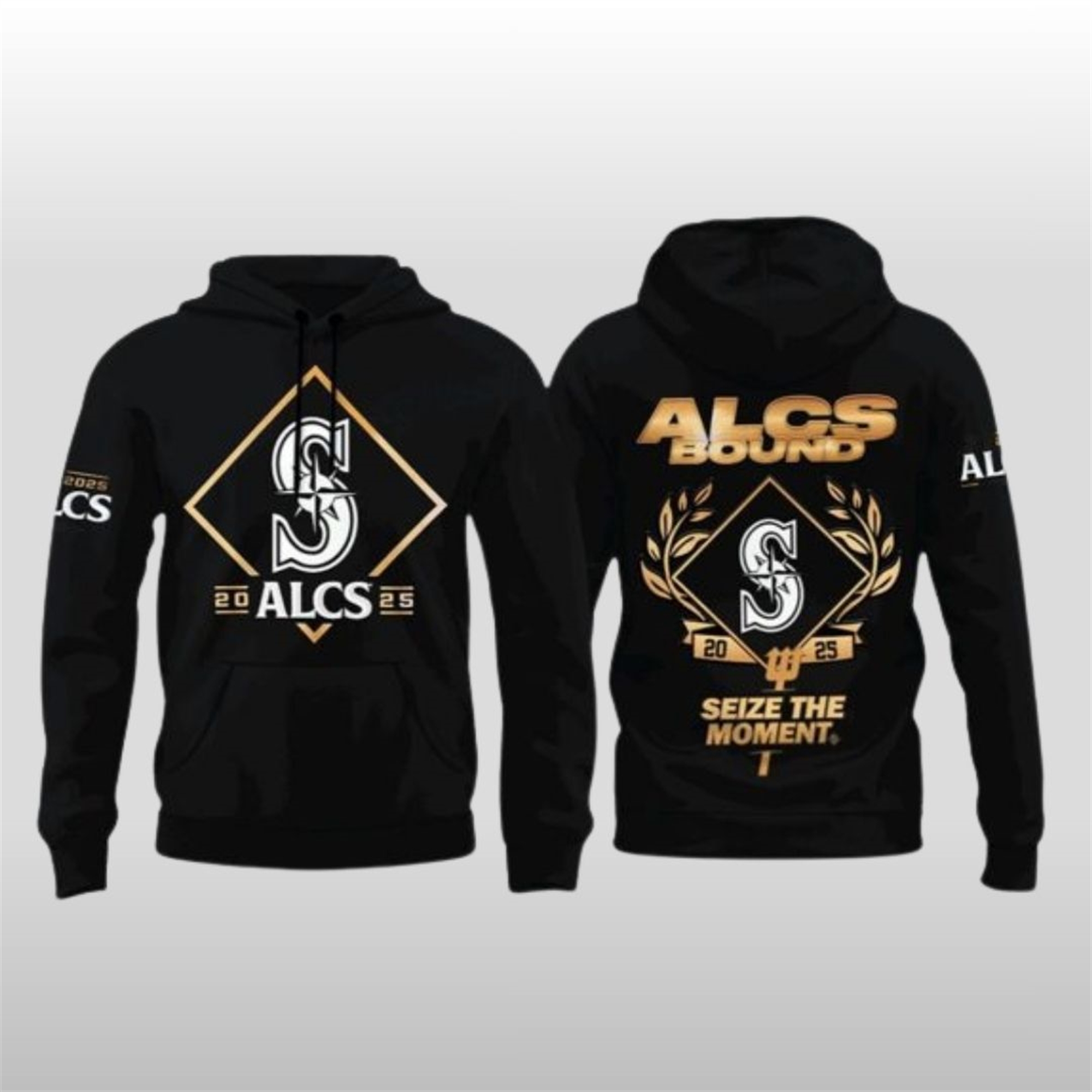 Celebrate the Mariners‘ incredible push for glory with this striking black pullover hoodie. The 2025 Mariners ALCS Bound Champions Hoodie, or as fans are calling it, the Seattle Baseball Championship Series Hoodie, is designed for the true supporter. The front features a bold, gold-and-white diamond logo centered around a stylized ‘S,’ flanked by the ‘2025‘ numerals and the acronym ‘ALCS.’