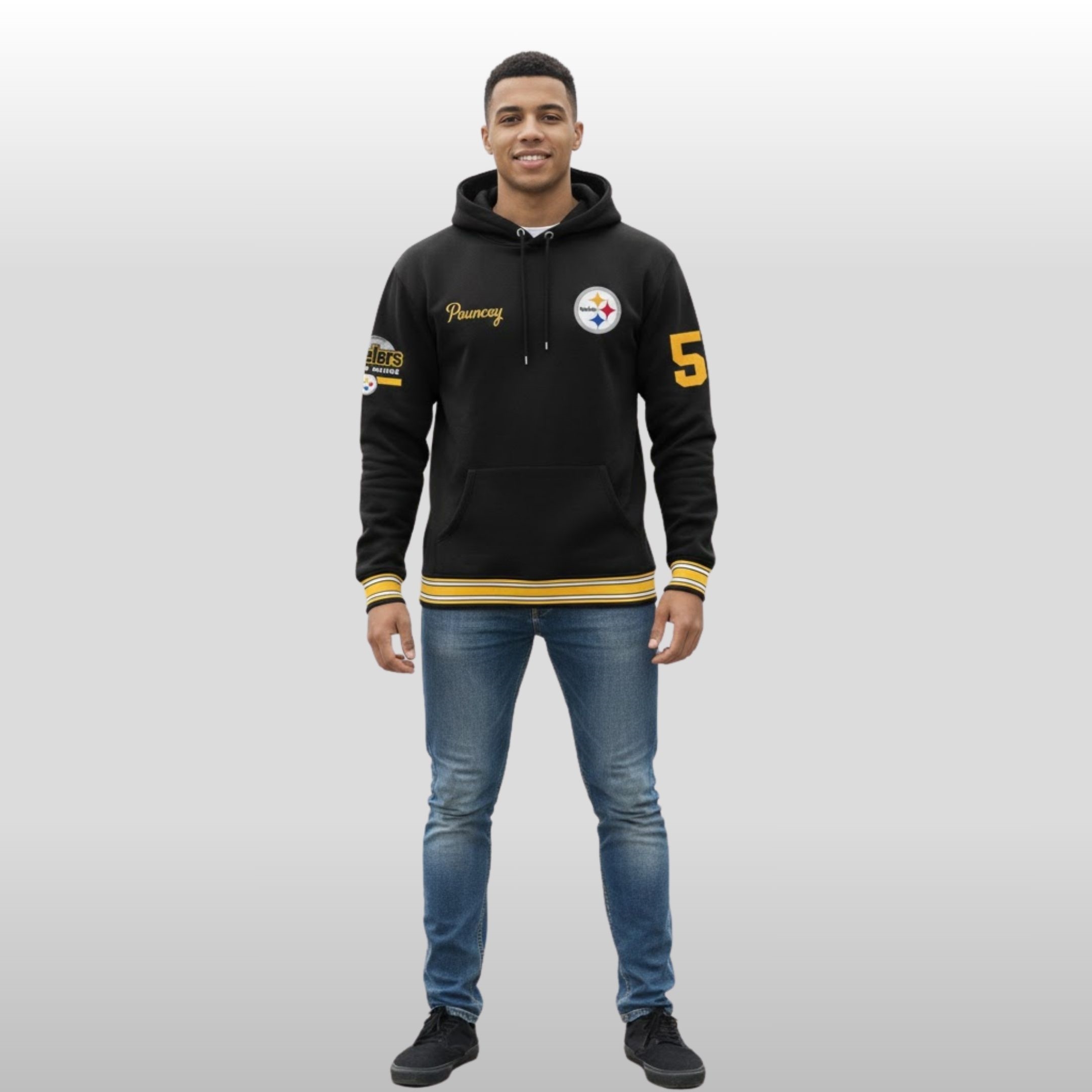 Pay tribute to one of the most dominant centers in franchise history with this premium Maurkice Pouncey Pittsburgh Steelers The Hall Of Honor Custom Hoodie. Crafted for the ultimate supporter, this hoodie features high-quality embroidery and screen-printed details that stand out. The chest proudly displays “Pouncey” in elegant gold script alongside the iconic team logo. The sleeves are adorned with his legendary number 53 and a dedicated “Hall of Honor” patch, marking his induction into the pantheon of greats. Finished with signature gold-and-white striped ribbing at the waist and cuffs, this Pouncey tribute fan apparel offers a timeless look for any Sunday afternoon.