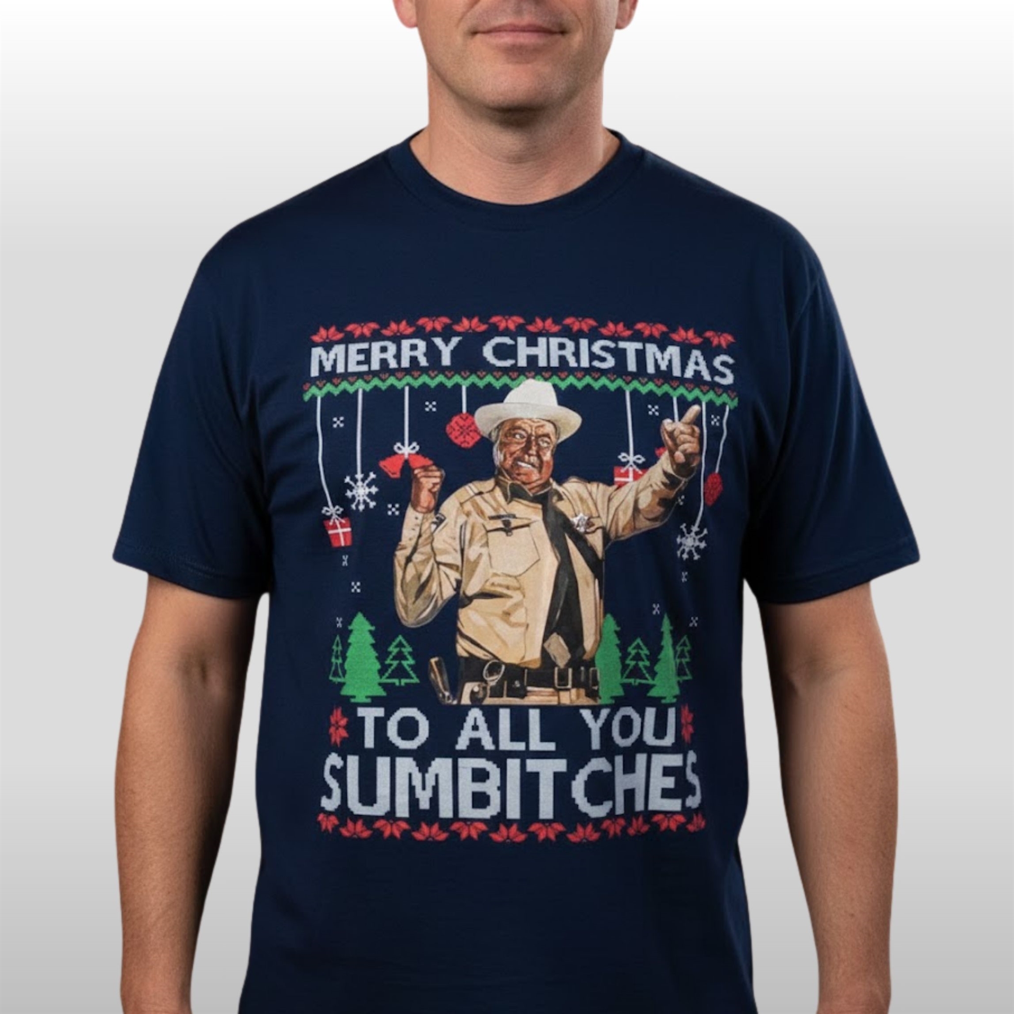 This isn’t just a t-shirt; it’s a piece of wearable holiday attitude. The navy blue tee features a bold, “ugly Christmas sweater” style graphic. At the center is a classic illustration of a gruff, white-hat-wearing sheriff-type character, pointing a finger and holding a cigar. Above and below him, the phrase “Merry Christmas To All You Sumbitches” is rendered in a distressed, festive font, surrounded by traditional holiday elements like snowflakes, gift-box ornaments, pine trees, and decorative sweater patterns.
