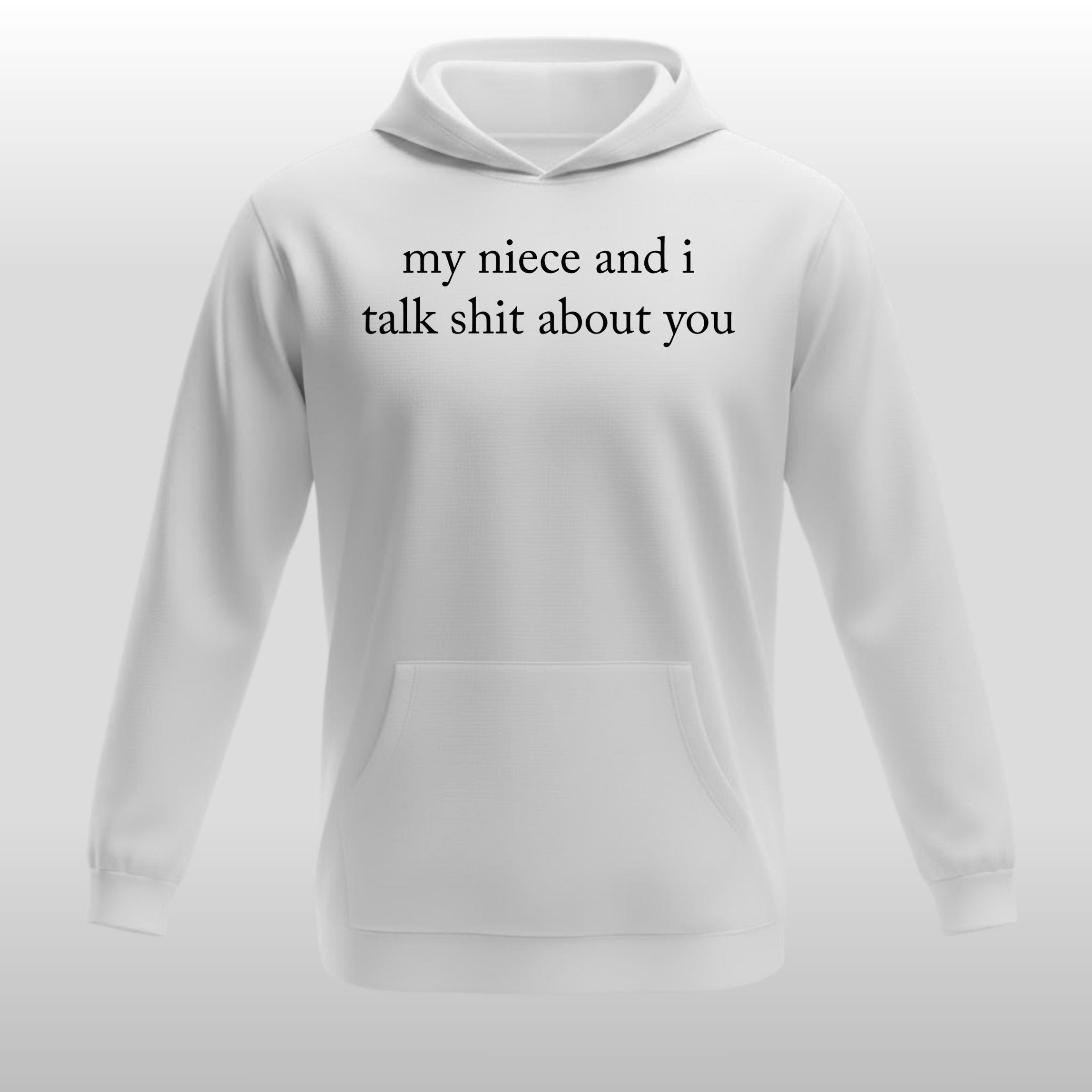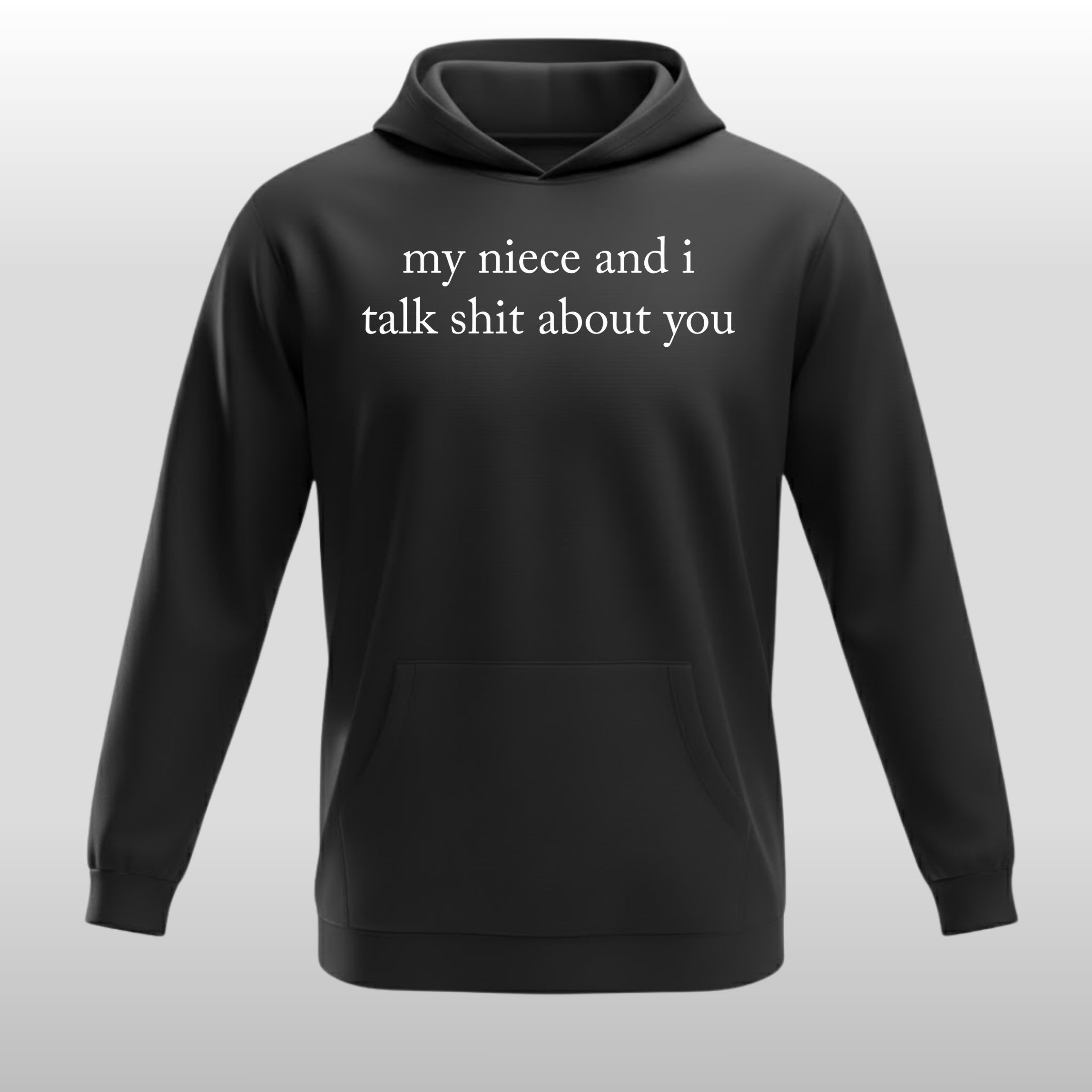 The design is minimalist but high-impact. Featuring a sleek, black backdrop, the hoodie displays the phrase “my niece and i talk shit about you” in a clean, elegant white serif font across the chest. The contrast between the polite typography and the sassy message is exactly what makes it a conversation starter.