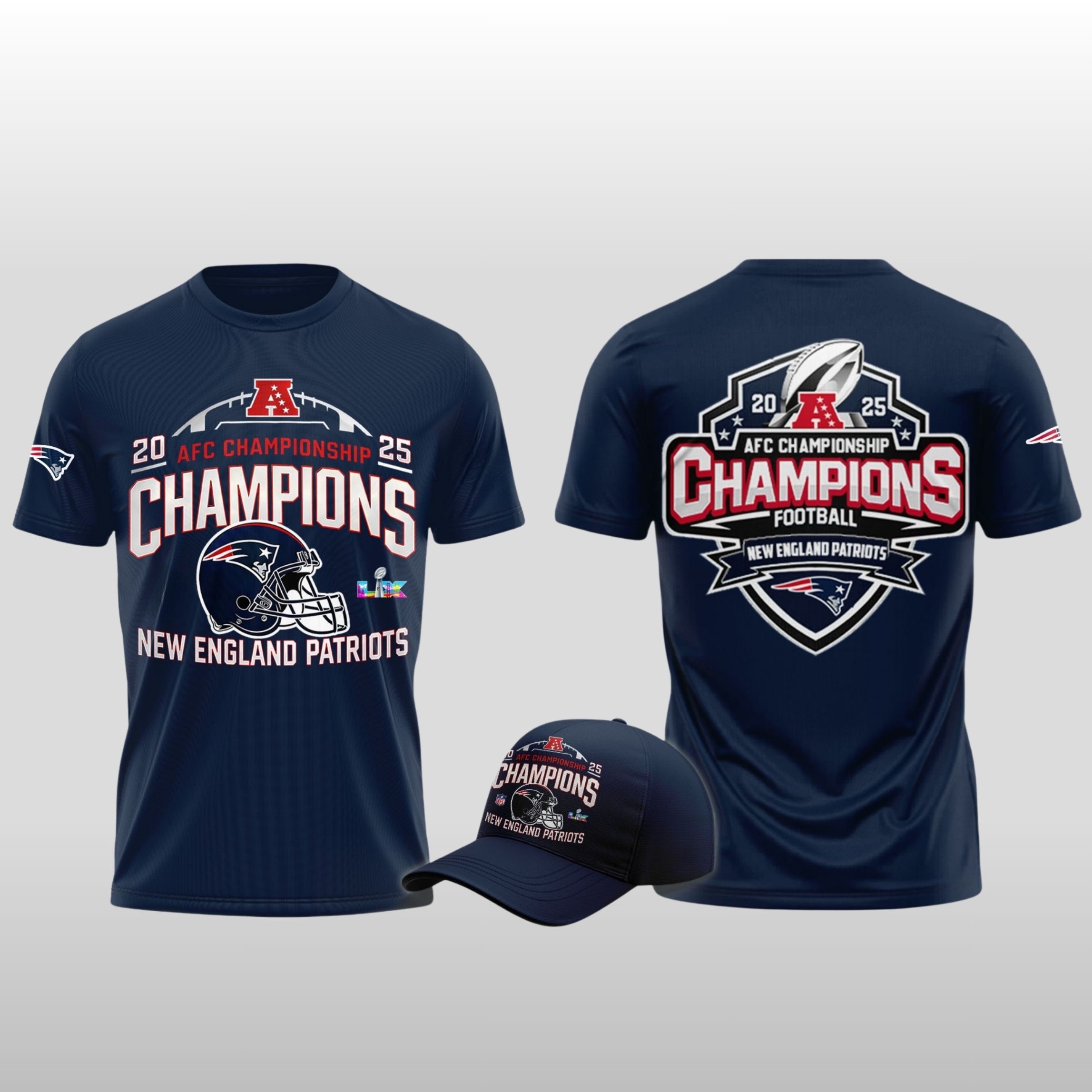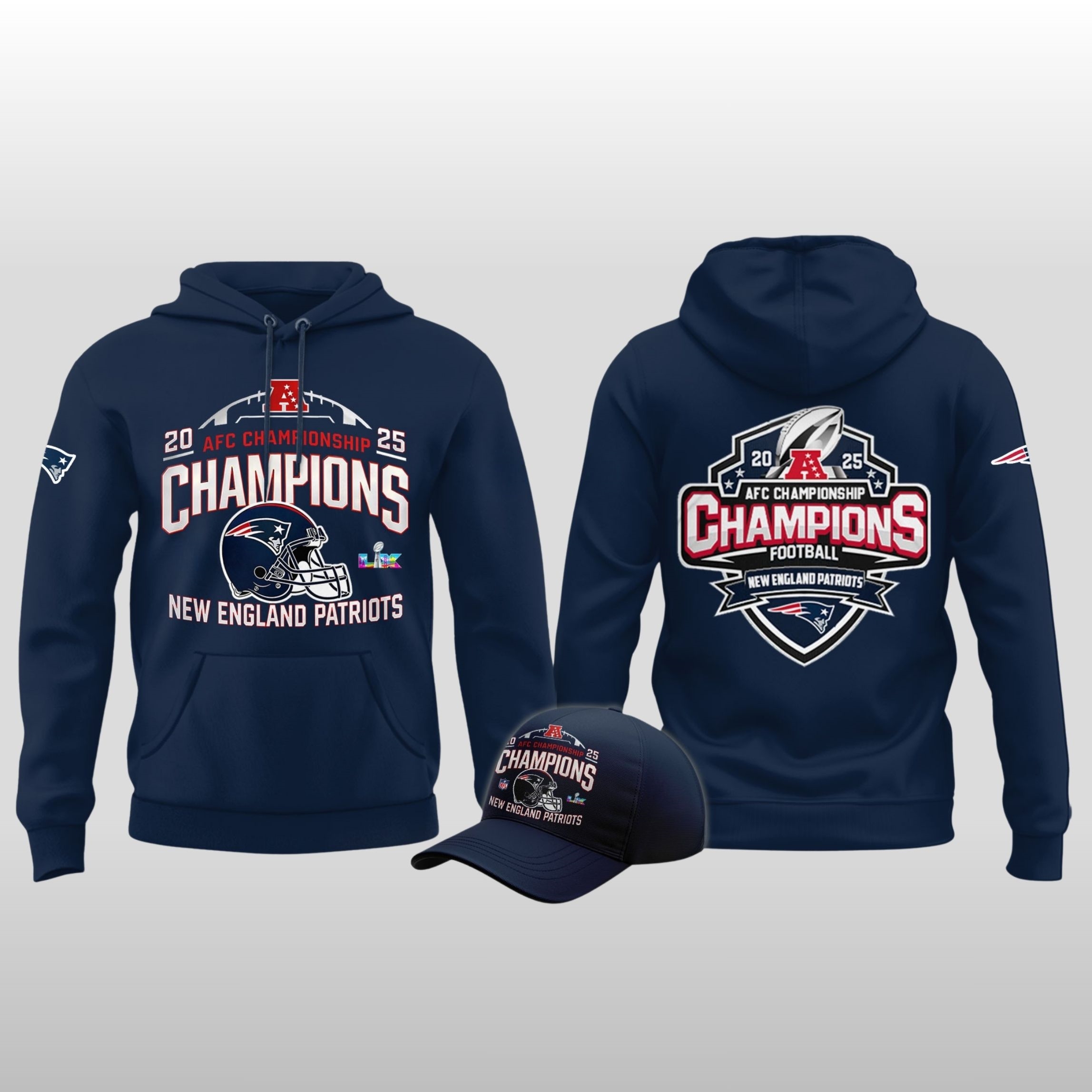 The front of the hoodie and shirt showcases the bold “CHAMPIONS” typography, flanked by the “2025” milestone. The centerpiece—a detailed helmet graphic—is paired with a sleek silver arch that mirrors the intensity of the post-season atmosphere. Every stitch and print is designed to feel as premium as the victory itself, blending the classic New England identity with a sharp, modern street-style edge.