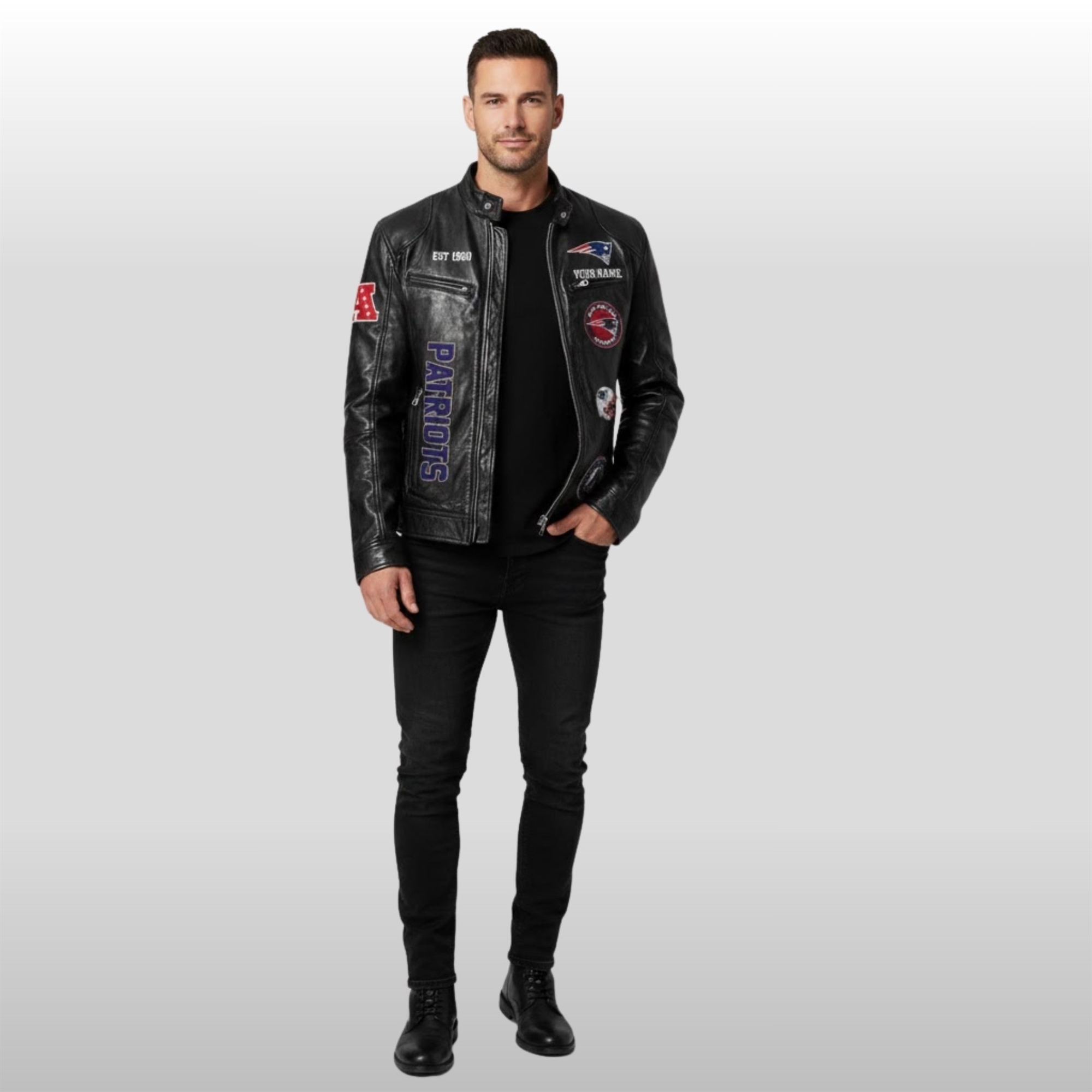 Since the franchise first took the field in 1960, the Patriots have become synonymous with a relentless pursuit of excellence. This premium leather jacket bridges the gap between rugged biker culture and the high-octane energy of Foxborough. Designed for the fan who leads the pack, it features a masterfully embossed “Since 1960” commemorative emblem, honoring the journey from the AFL roots to the most decorated dynasty in modern sports history.
