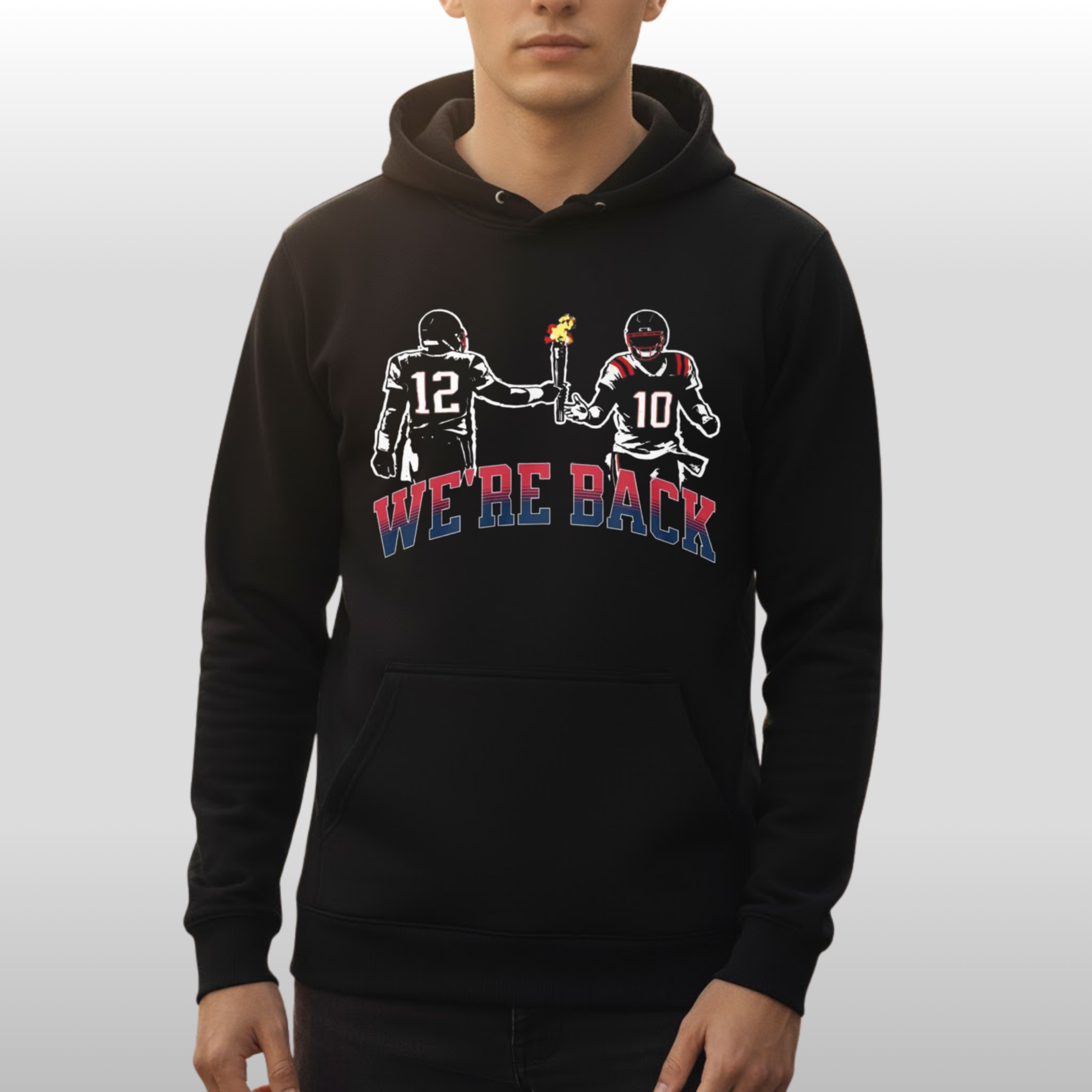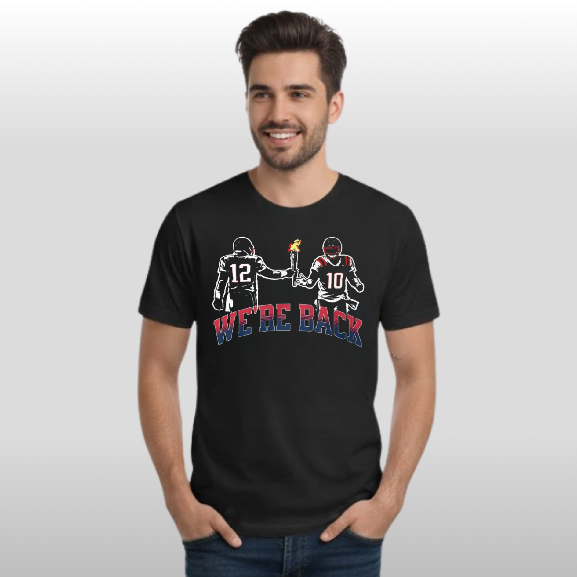 The New England Patriots We’re Back Shirt is a powerful visual tribute to a franchise defined by its relentless pursuit of excellence. Featuring a symbolic “passing of the torch” between the legendary number 12 and the rising number 10, this design captures the exact moment a storied legacy meets a promising future. Set against a deep black canvas, the high-contrast graphics and bold “WE’RE BACK” typography in gradient red and blue create a look that is both nostalgic and fiercely modern.