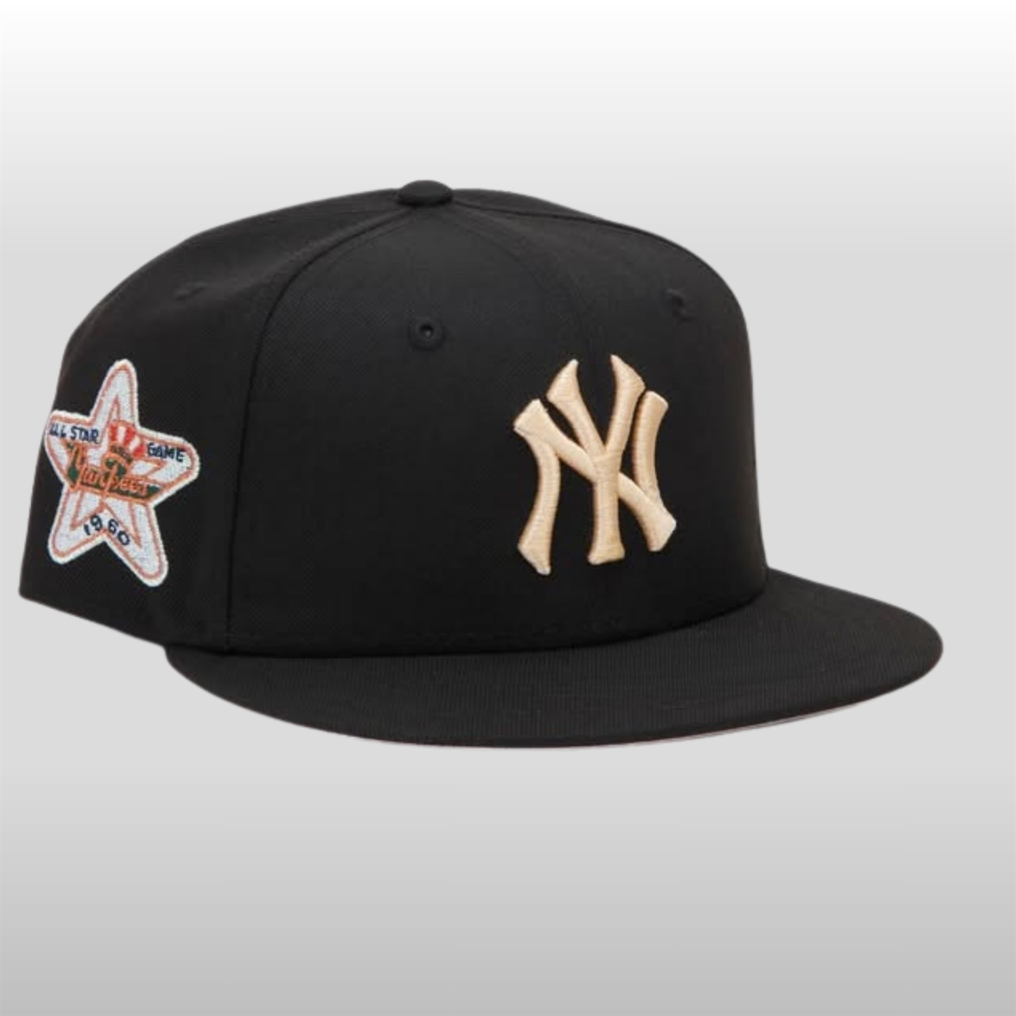 Experience the golden age of baseball with the New York Yankees 1960 All Star Game Hat. This premium, black fitted cap features the iconic Yankees “NY” logo beautifully embroidered in a striking tan/gold color on the front crown.