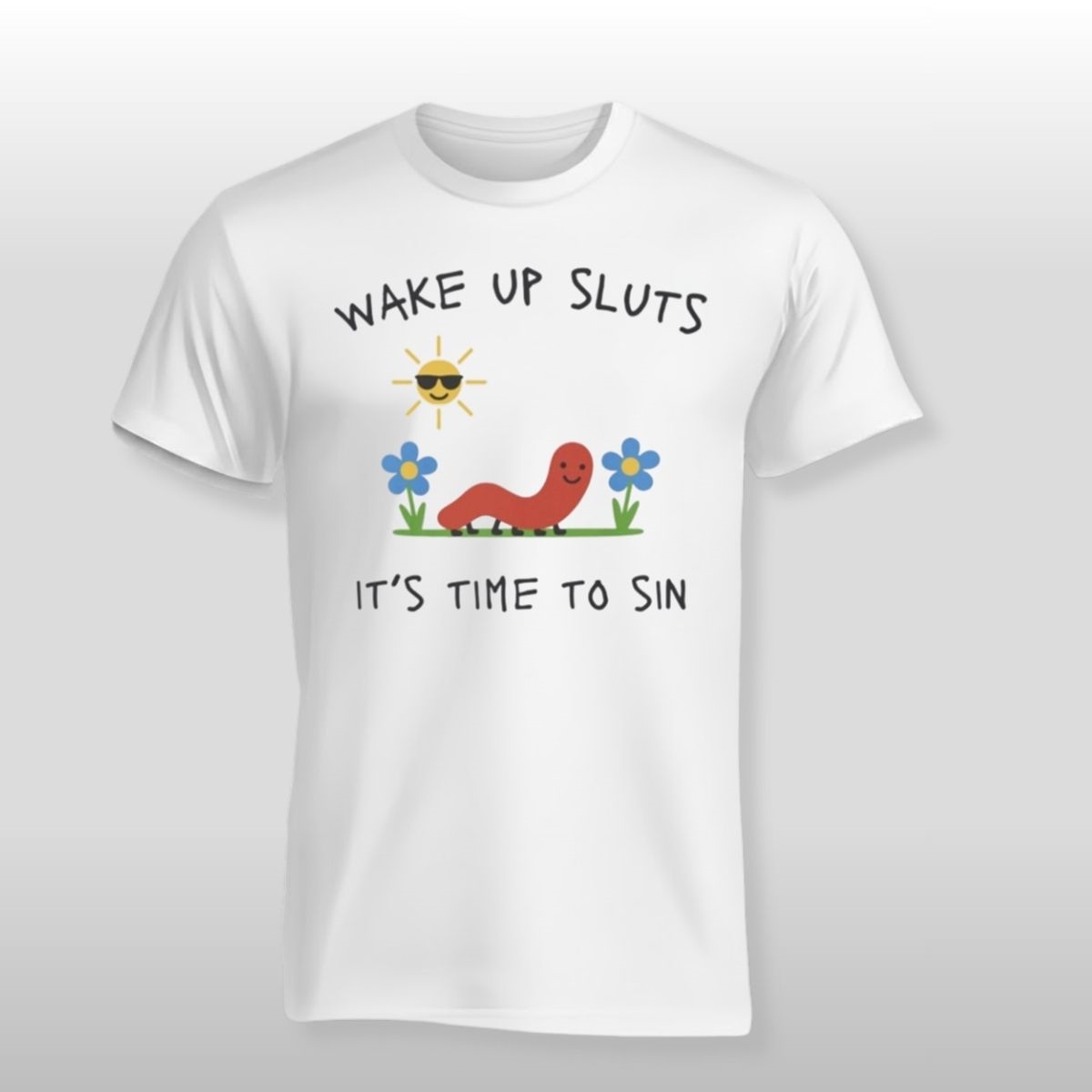 Step away from the mundane and dive headfirst into a world of bold irony with the Nicolas Vansteenberghe Wake Up Sluts It’s Time to Sin Shirt. This piece isn’t just about making a statement; it’s about a complete subversion of expectations. By pairing a cheerful, almost childlike illustration of a smiling red worm and bright blue flowers with a provocative, high-contrast slogan, this Nicolas Vansteenberghe shirt captures a specific brand of modern nihilism wrapped in a “cottagecore” aesthetic. It is the ultimate wardrobe choice for those who find humor in the absurd and aren’t afraid to spark a conversation—or a few double-takes—at the local coffee shop or an art gallery opening.
